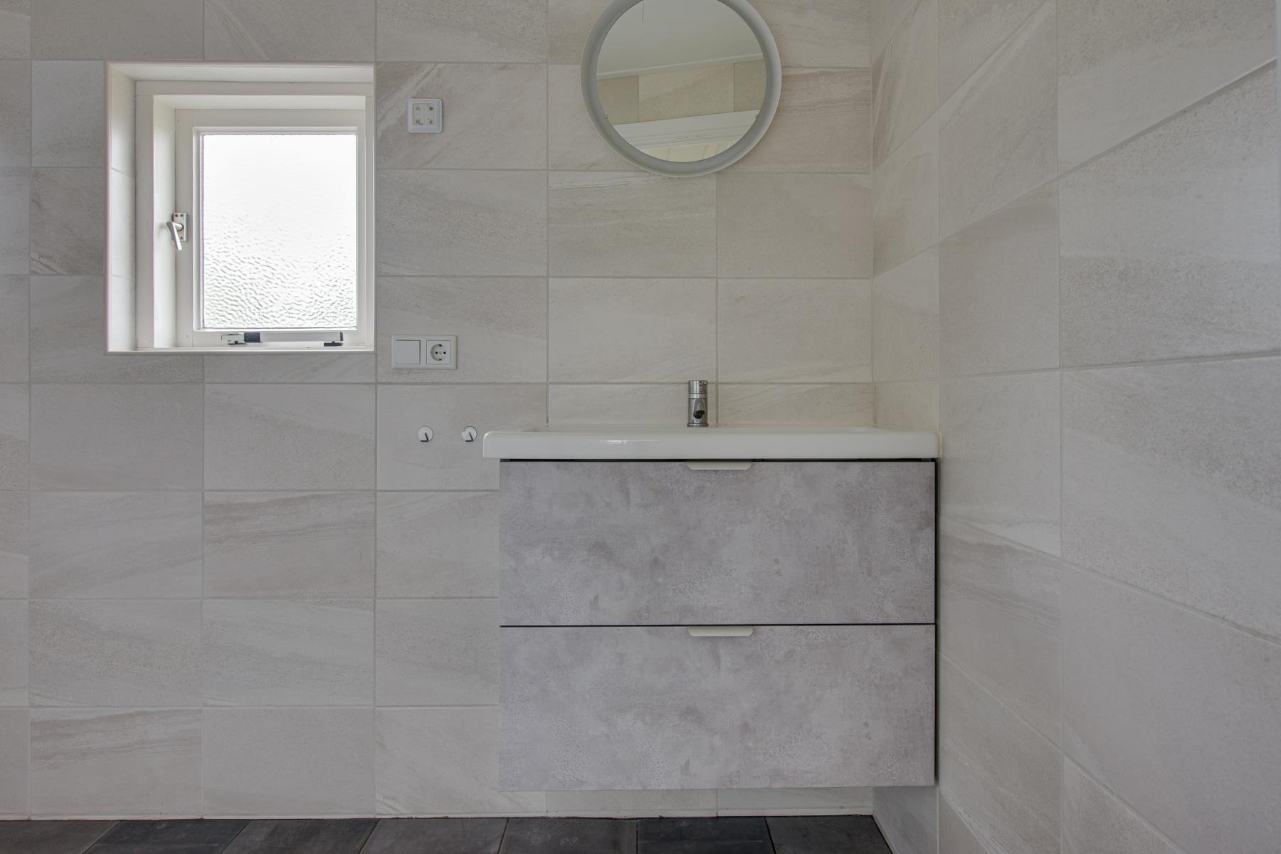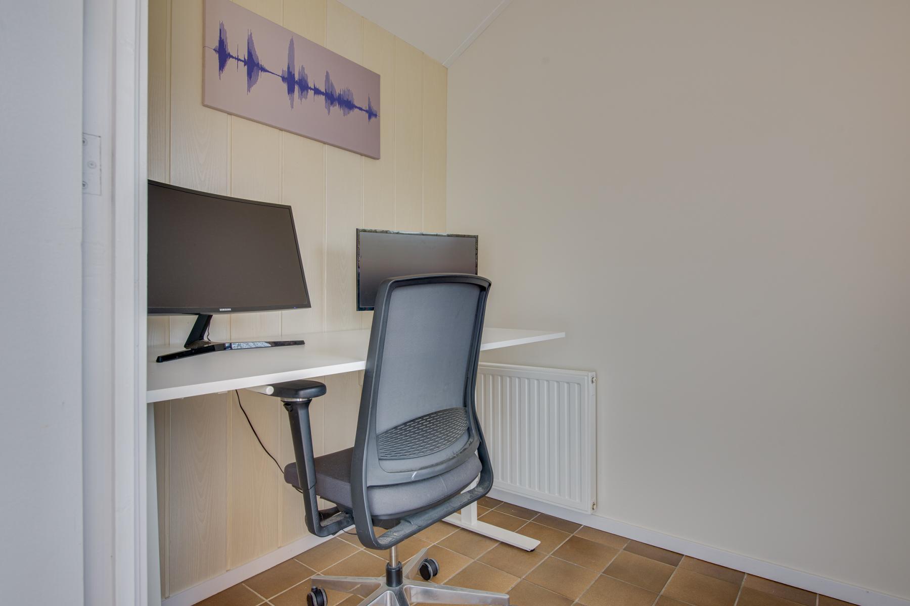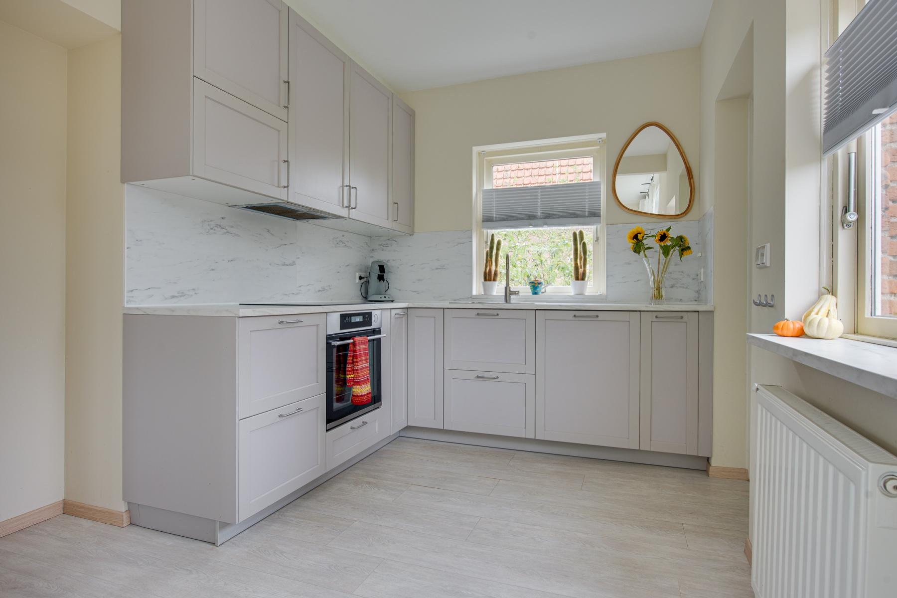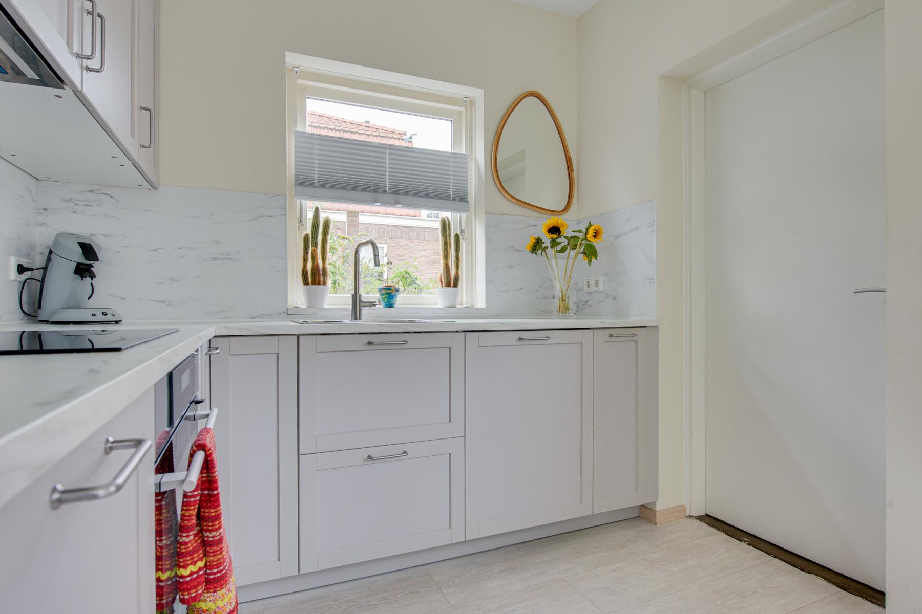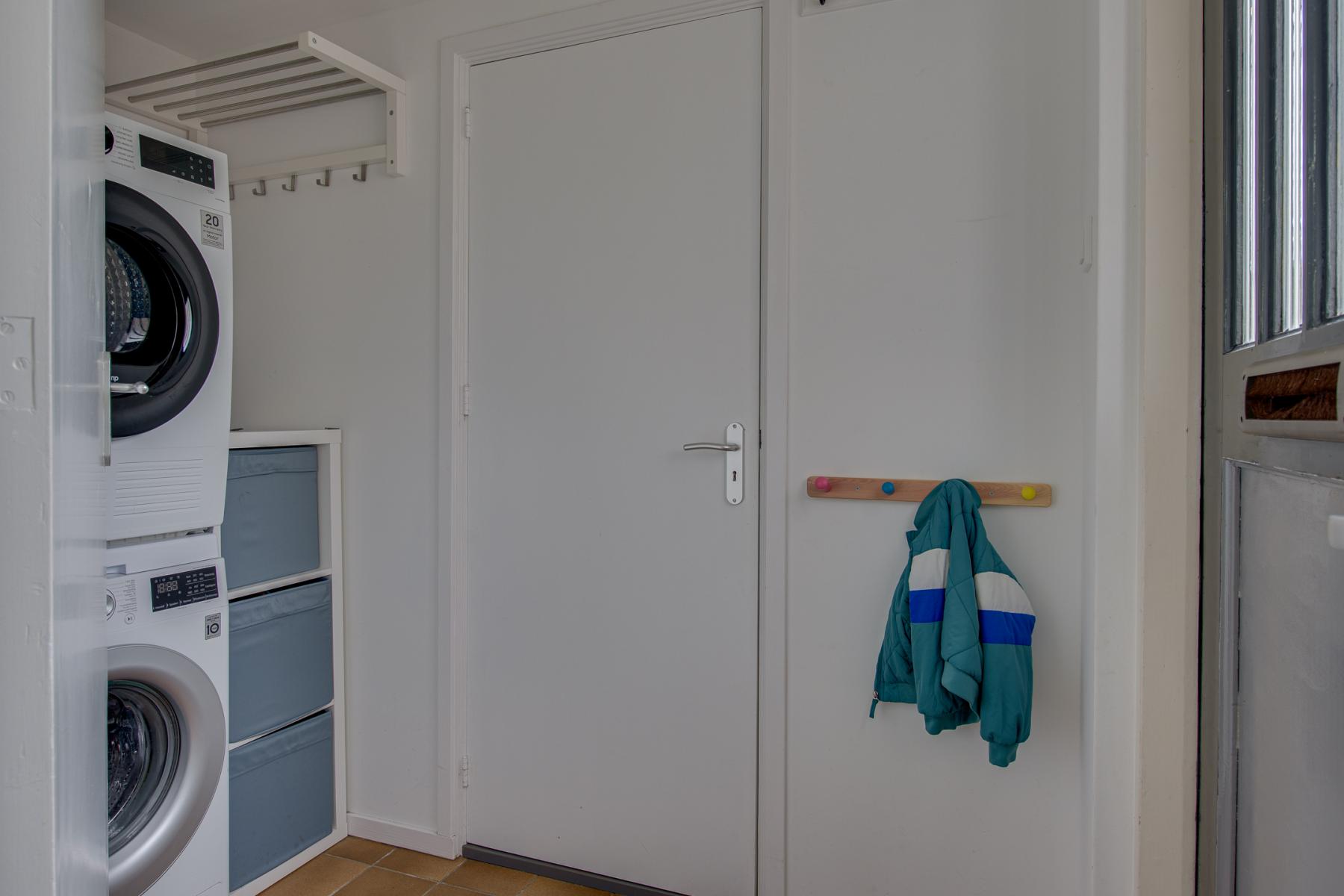 Achter de keuken ligt de praktische bijkeuken met aansluitingen voor wasmachine en droger, en de opstelling van de Intergas Kompakt HRE CV-ketel. Ook vind je hier een fijne werkplek in de vorm van een thuiskantoor: rustig gelegen en ideaal voor wie regelmatig vanuit huis werkt.