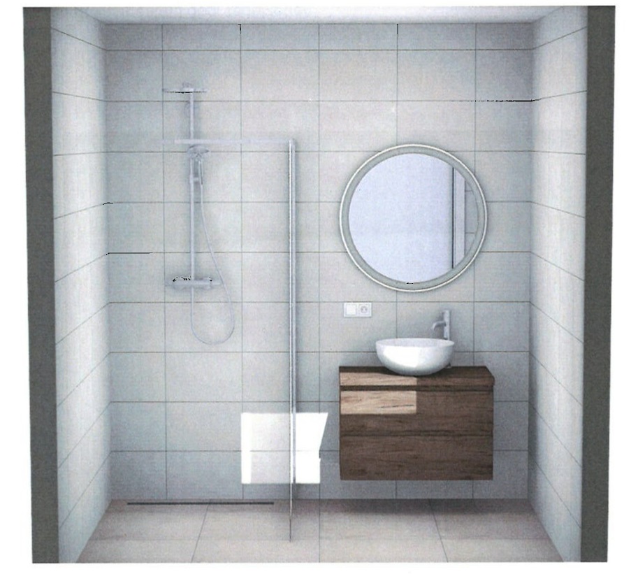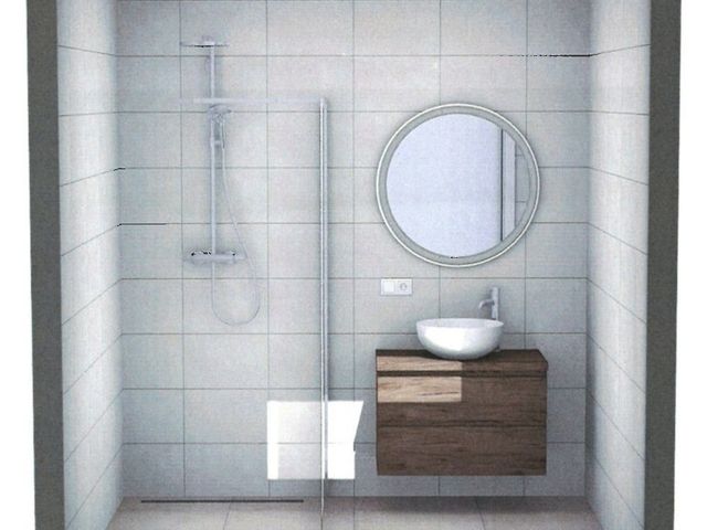 • In de badkamer standaard thermostatische douchemengkranen, draingoot, douchescherm en luxe sanitair