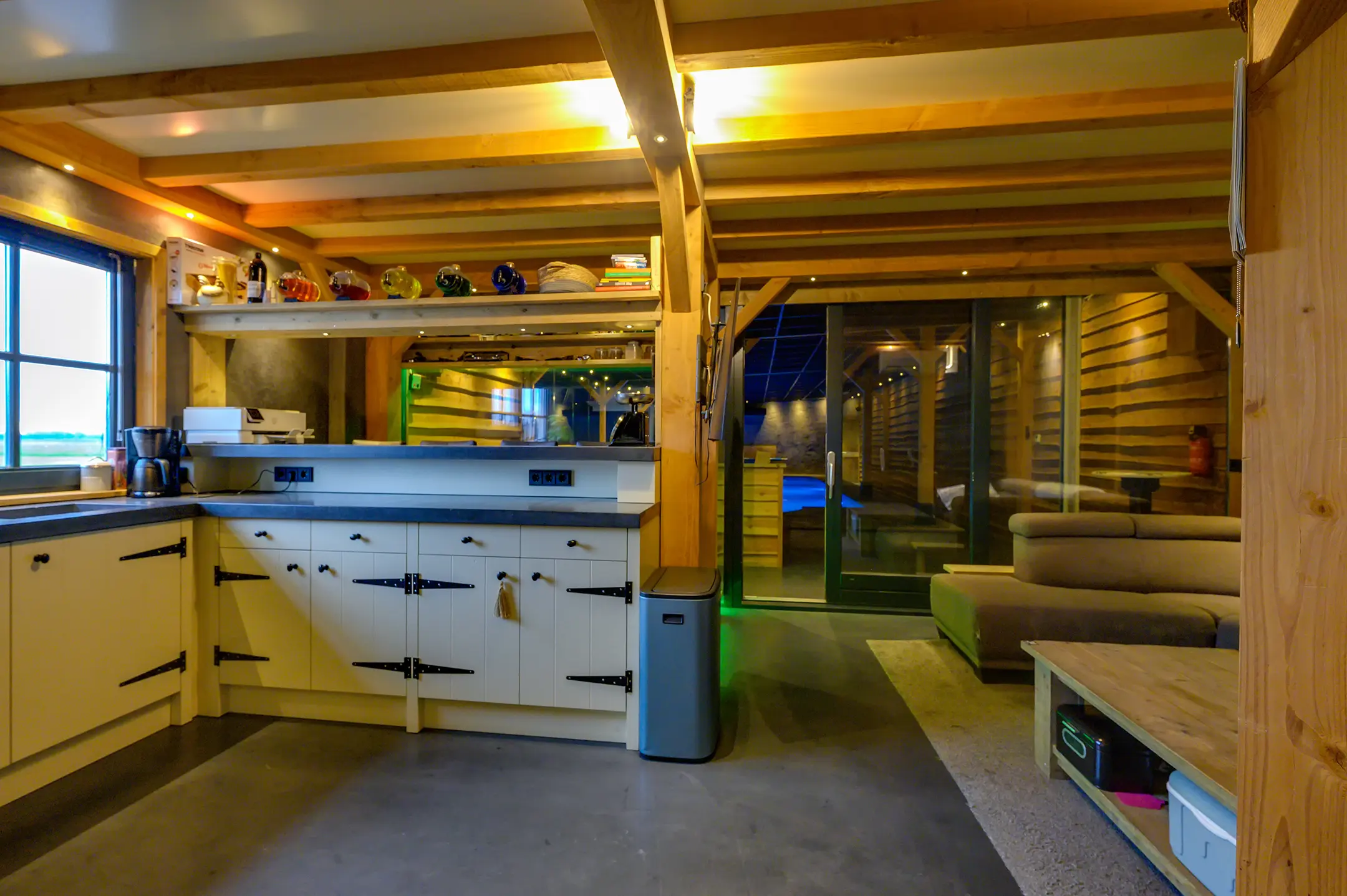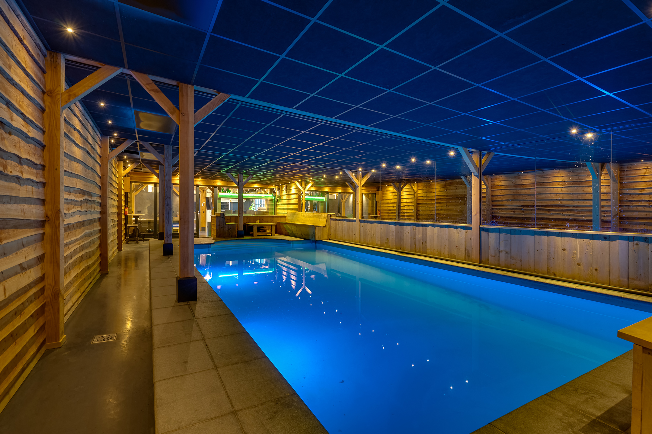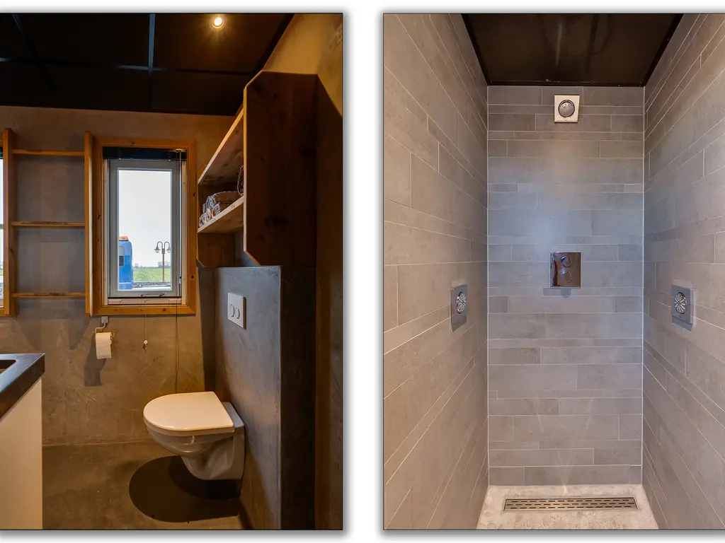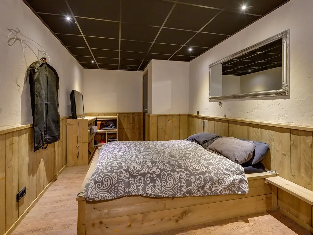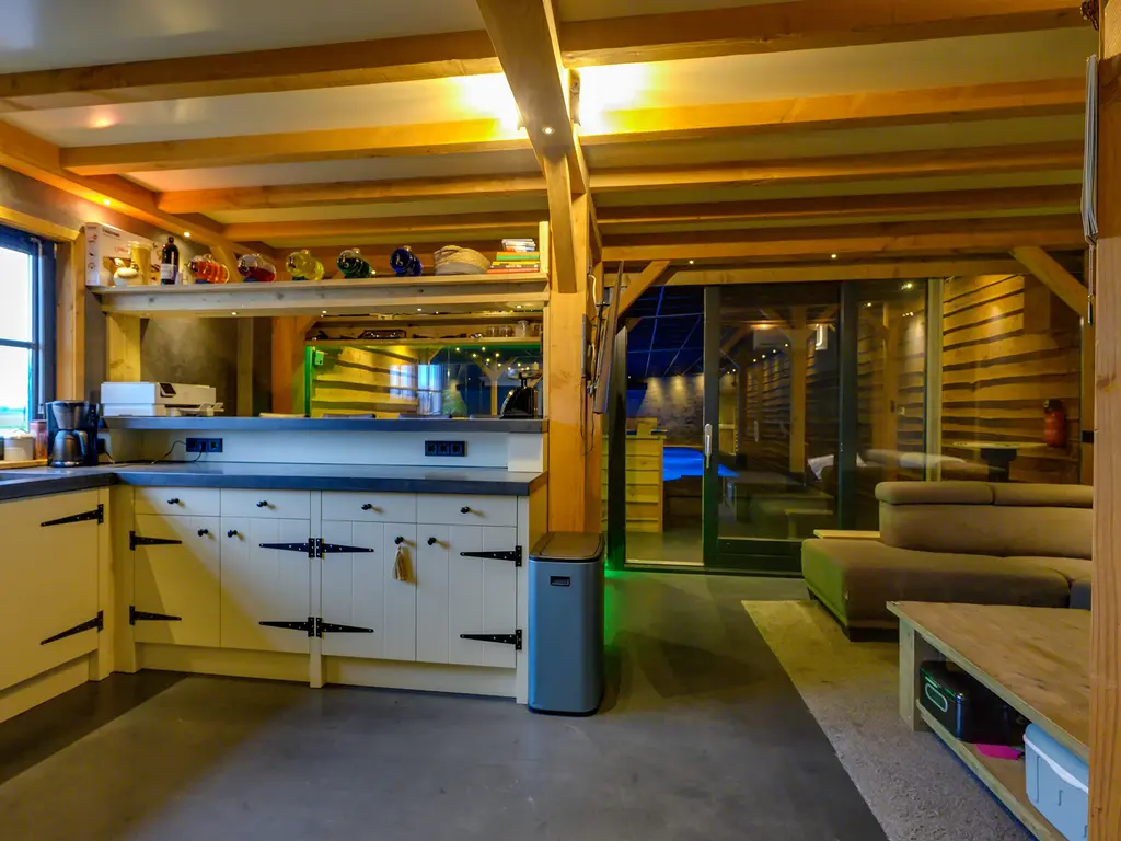Eigen entree/hal met giet betonvloer en systeemplafond. Wasruimte met aansluitpunten wasapparatuur en unit vloerverwarming. Slaapkamer met betonvloer met vloerverwarming, systeemplafond, houten kozijnen met dubbel glas en airco unit. Slaapkamer 2 met giet betonvloer met vloerverwarming, systeemplafond en houten kozijnen met dubbel glas. Geheel betegelde badkamer met vloerverwarming, inloopdouche, hangend toilet, wastafelmeubel en houten kozijnen met dubbel glas. Woonkeuken met giet betonvloer met vloerverwarming en een U-vormig keukenblok met betonlook aanrechtblad met een 5-pits gaskookplaat, afzuigkap, combimagnetron, koel-/vriescombinatie, dubbele spoelbak en airco unit. Zwembad met loungeruimte. Jacuzzi ruimte met grote jacuzzi voor meerdere personen. Technische ruimte met de pomp van het zwembad, unit vloerverwarming en CV-combiketel. Geheel betegelde doucheruimte met inloopdouche. Multifunctionele ruimte 1 met laminaatvloer en designradiator. Multifunctionele ruimte 2 met laminaatvloer, designradiator en eigen toiletruimte met hangend toilet met fonteintje.