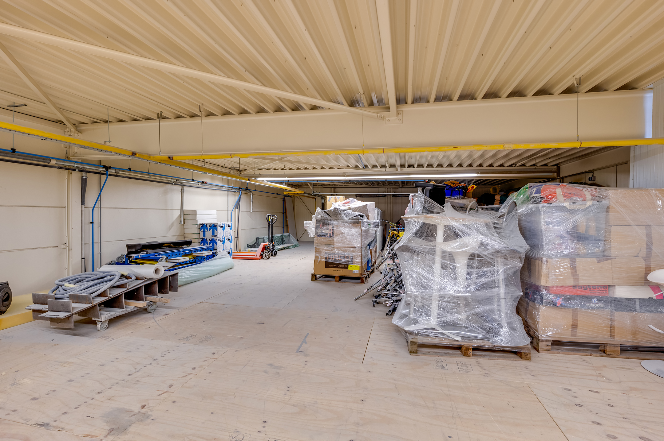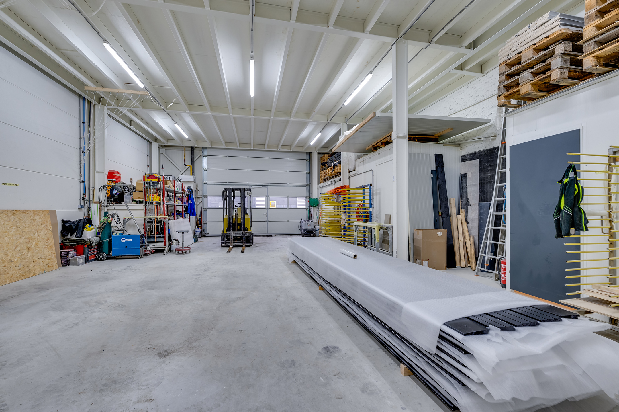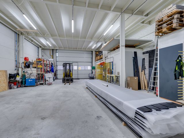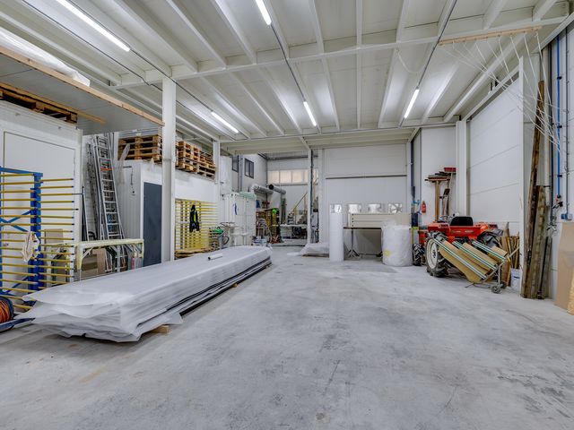 Begane grond: elektrisch bedienbare overheaddeur (ca. 4,3 meter hoog) met aparte loopdeur. Werkplaats met meterkast voor bedrijfshal en vloeistofdichte betonvloer. Werkkamer/multifunctionele ruimte met betonvloer, 3 designradiatoren, geheel betegelde toiletruimte met hangend toilet, geheel betegelde doucheruimte met inloopdouche en wasbak. Geheel betegelde doucheruimte 2 met inloopdouche en wasbak en bergruimte.