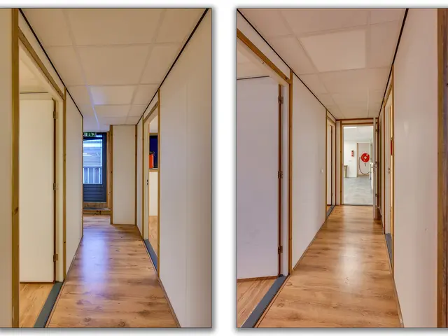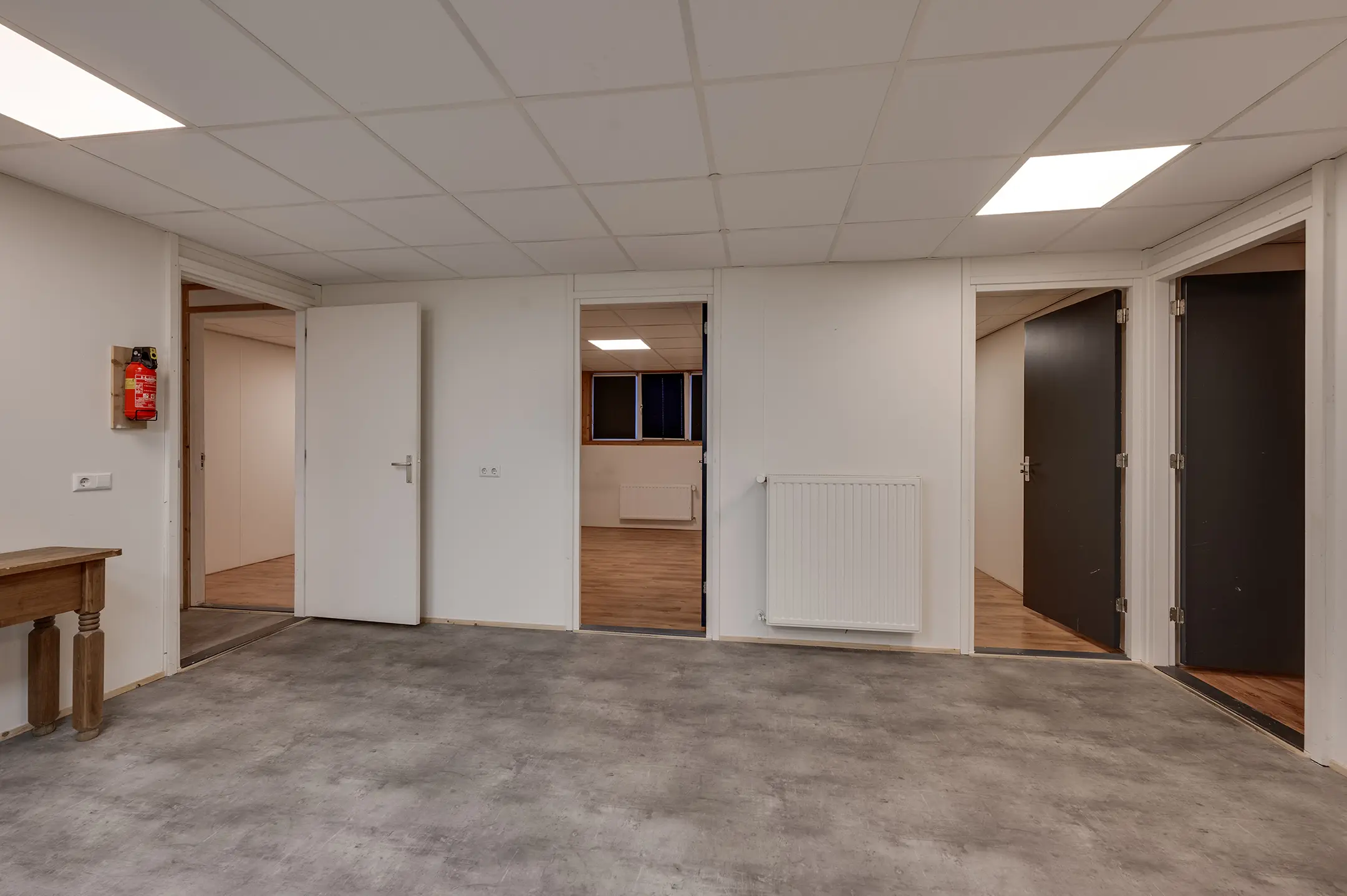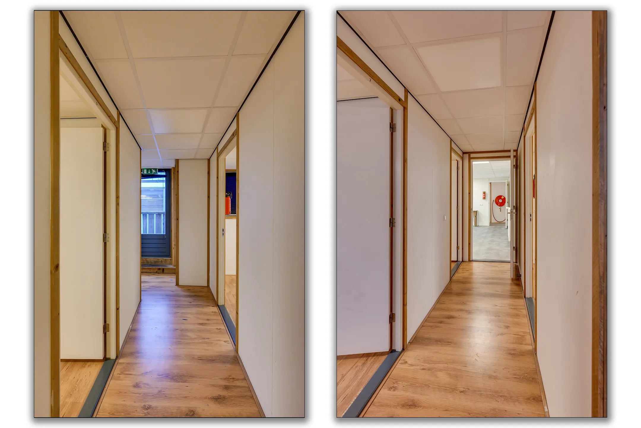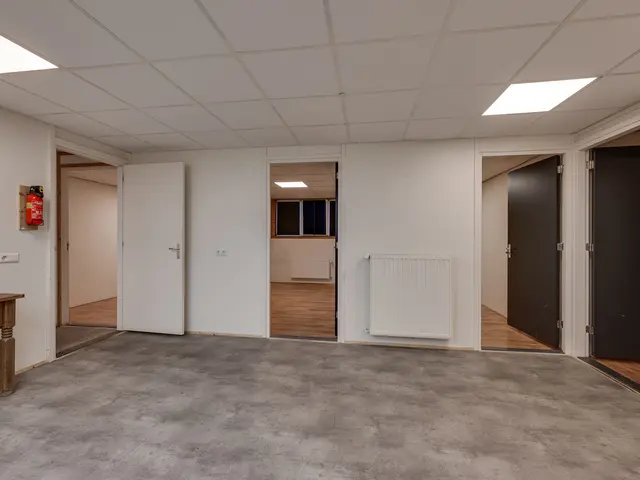 1e verdieping: overloop met zeil en toegang tot een ruime entresol. Wasruimte met laminaatvloer en 4 wasbakken. Opstelplaats CV-combiketel. Geheel betegelde doucheruimte 1 met douchecabine. Geheel betegelde doucheruimte 2 met douchecabine. Geheel betegelde toiletruimte 1 met hangend toilet. Geheel betegelde toiletruimte 2 met hangend toilet. Ruime kantine met zeil en een U-vormig keukenblok met 4-pits gaskookplaat, afzuigkap en koelkast. 8 kantoorruimten met laminaatvloer, systeemplafonds met inbouwarmaturen en radiatoren.