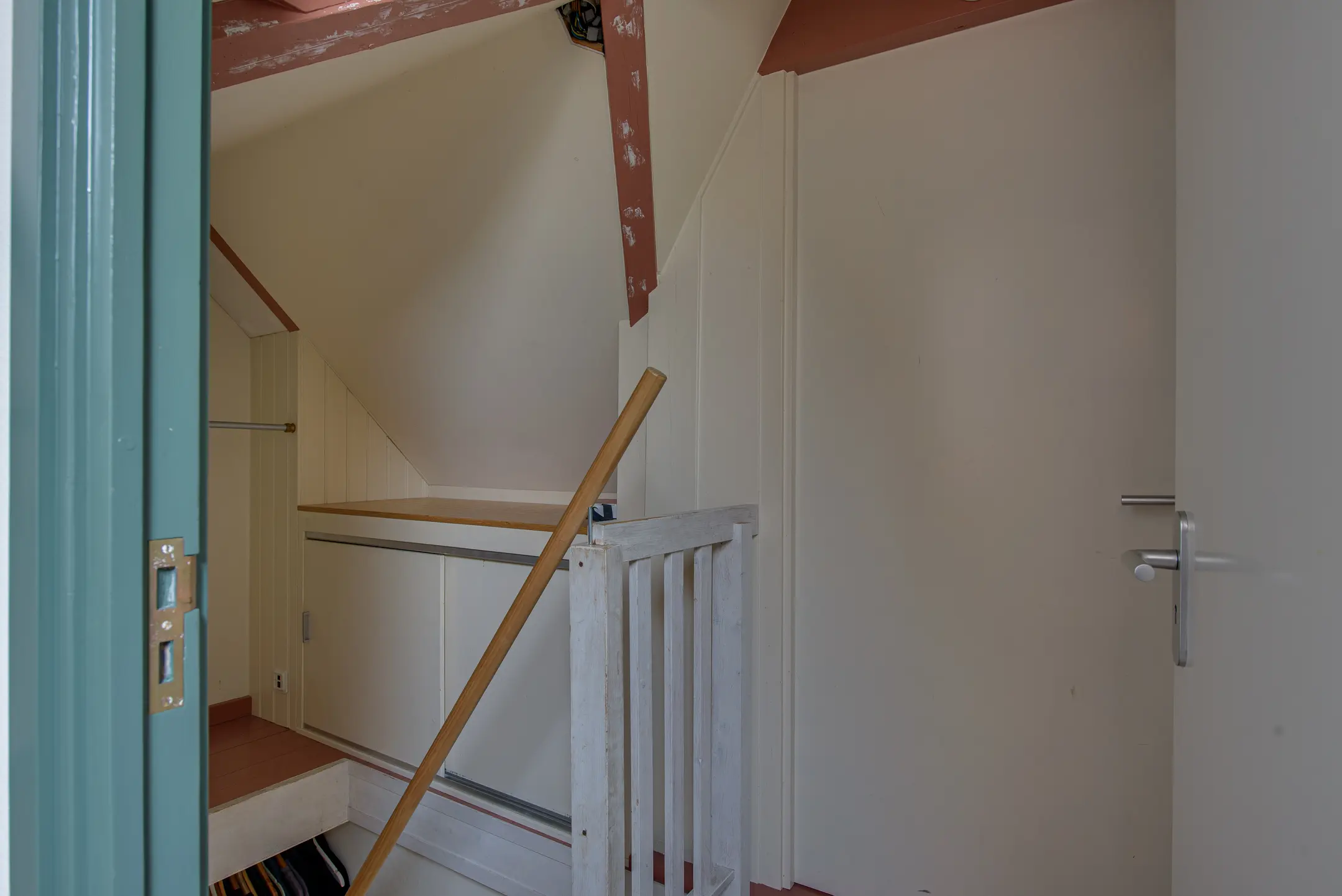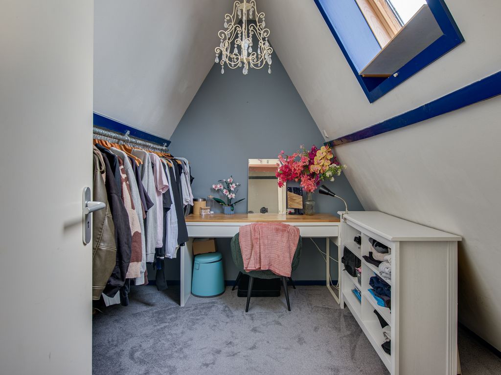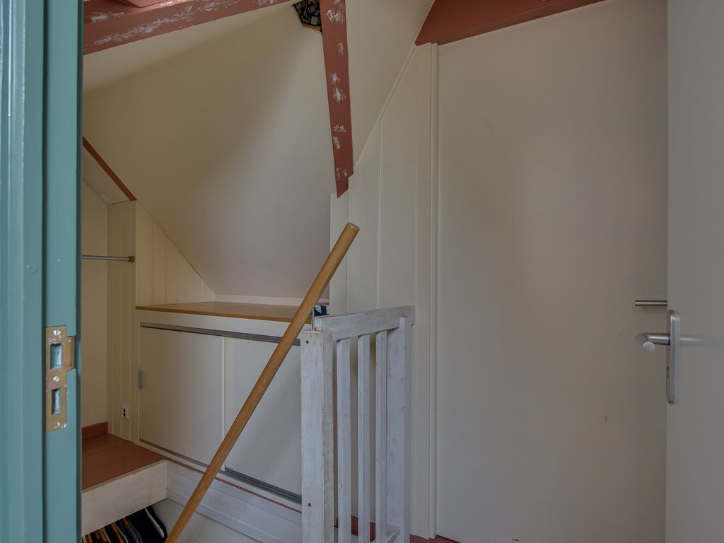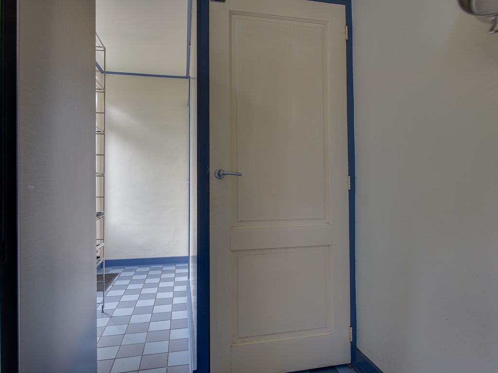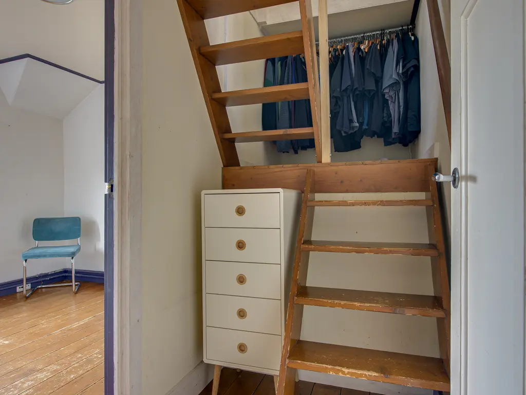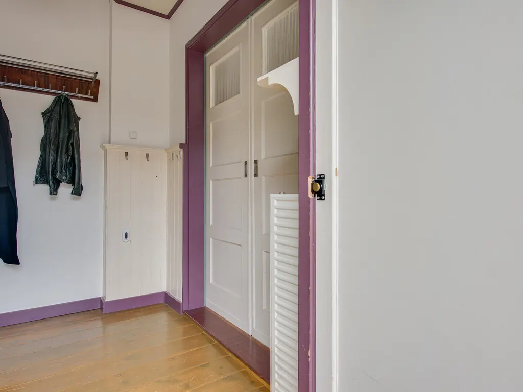 Achter de keuken bevindt zich nog een hal met toegang tot een ruime vliering – perfect voor extra opslagruimte.