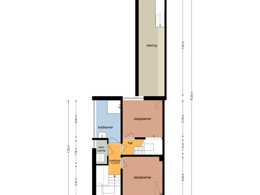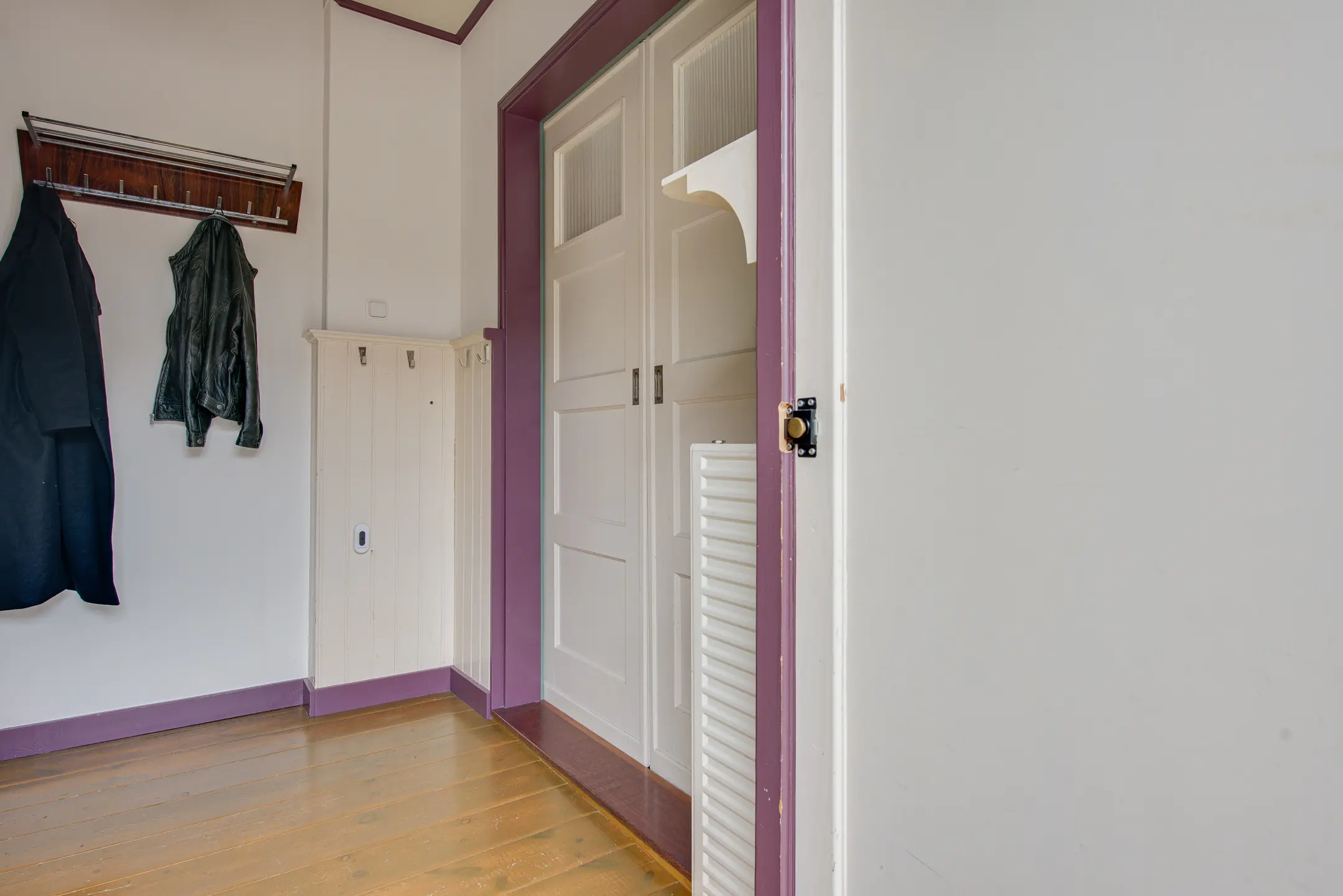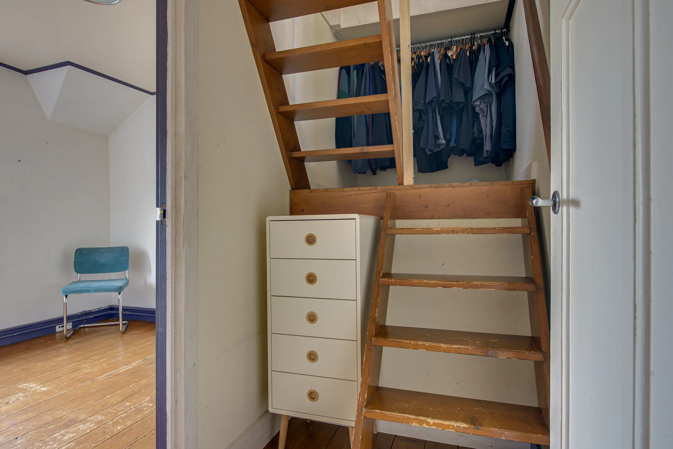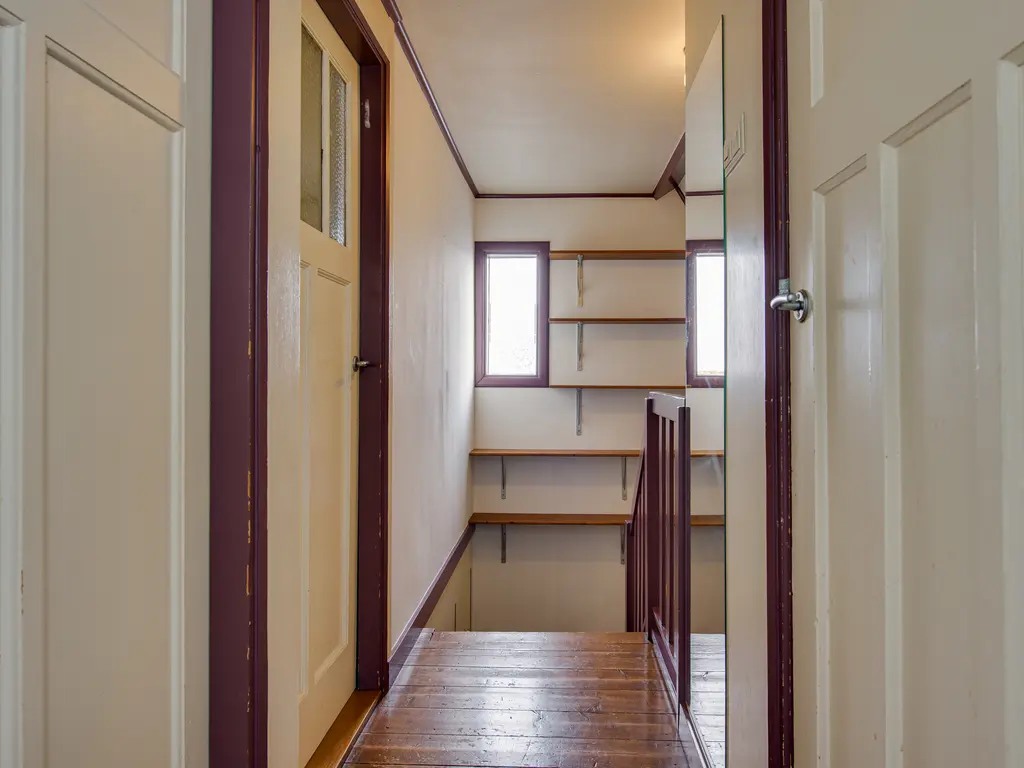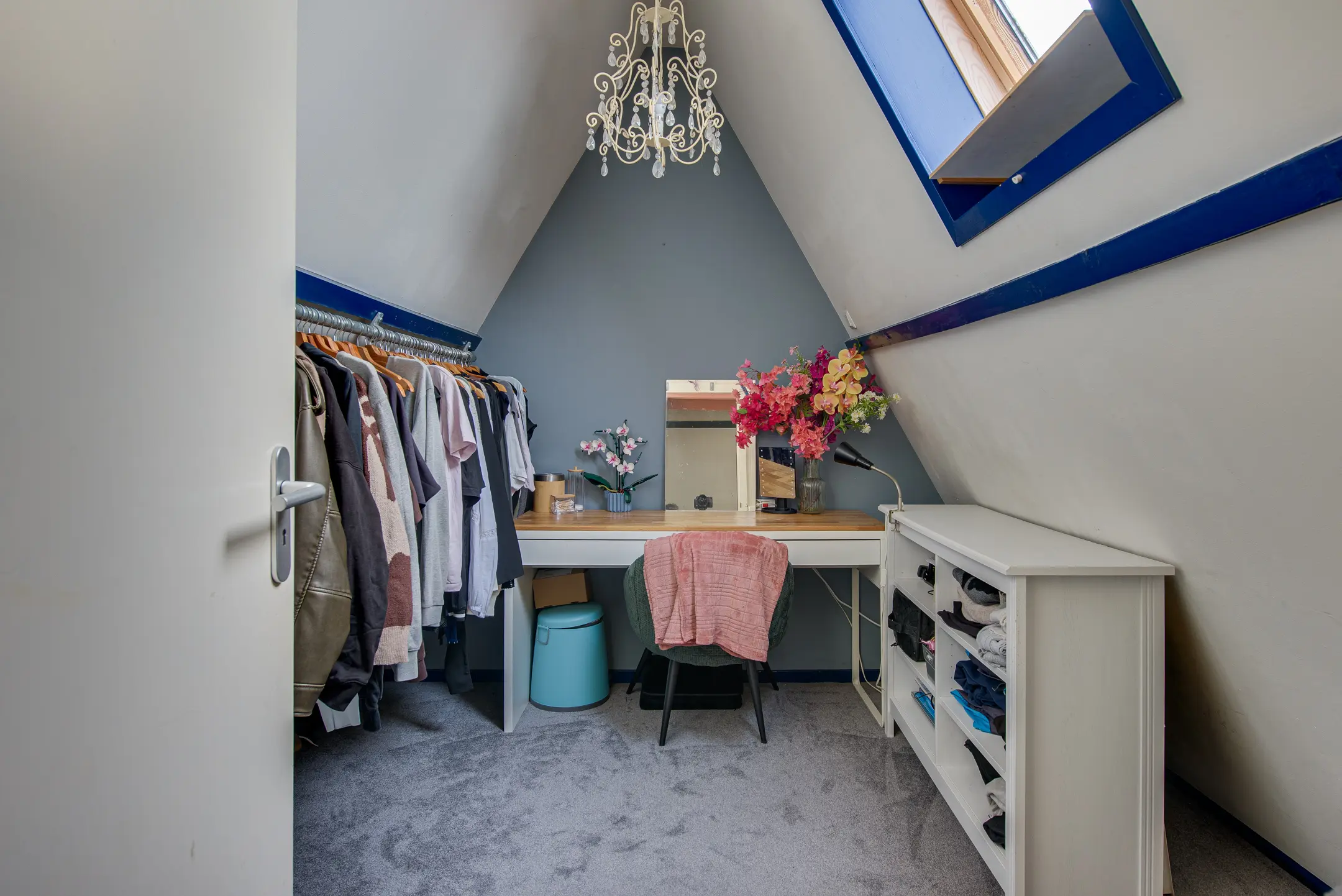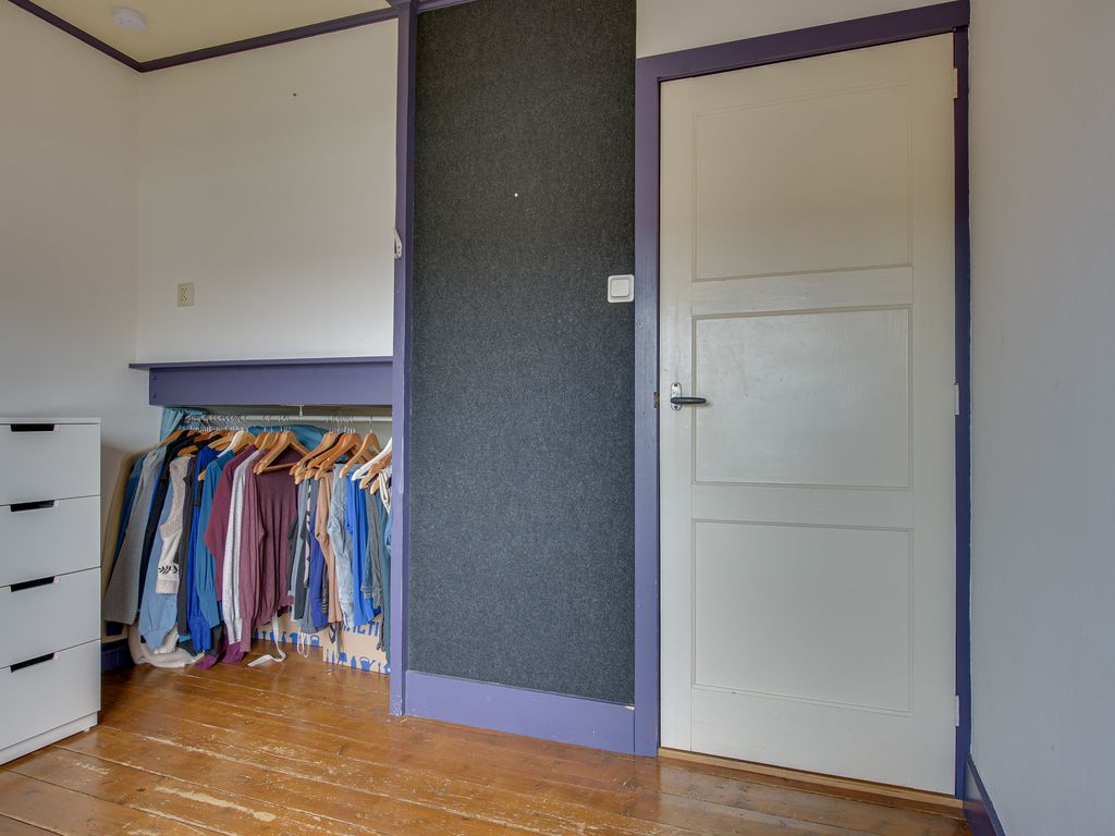 Achter de keuken bevindt zich nog een hal met toegang tot een ruime vliering – perfect voor extra opslagruimte.