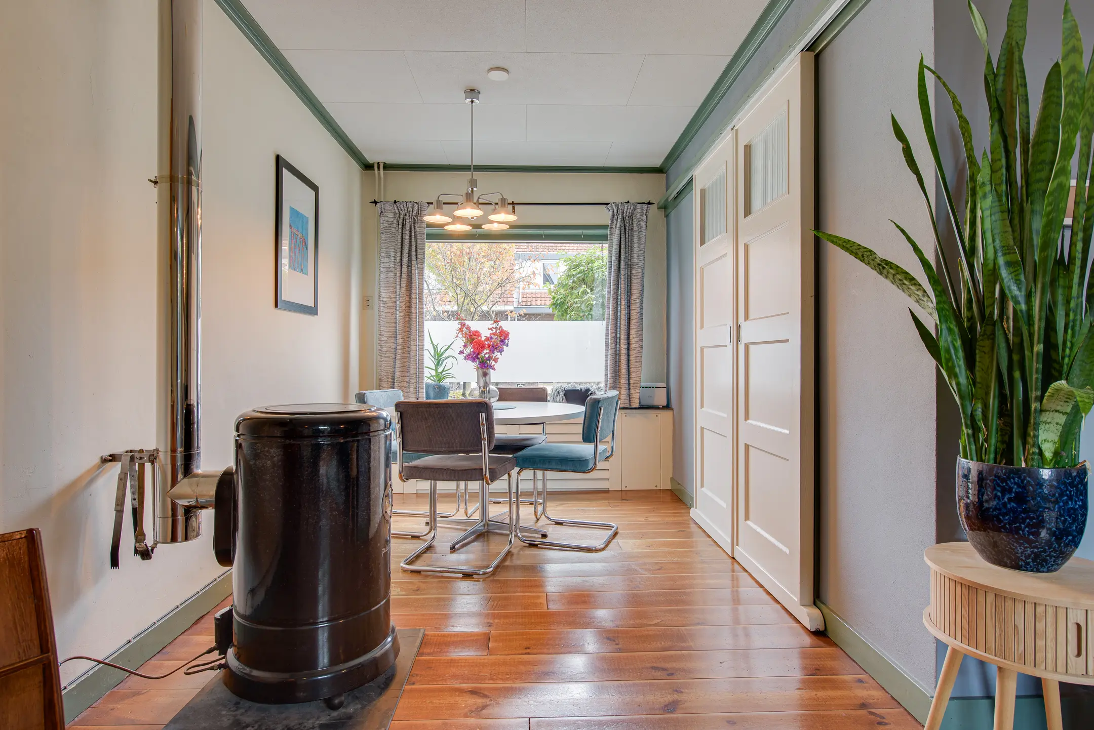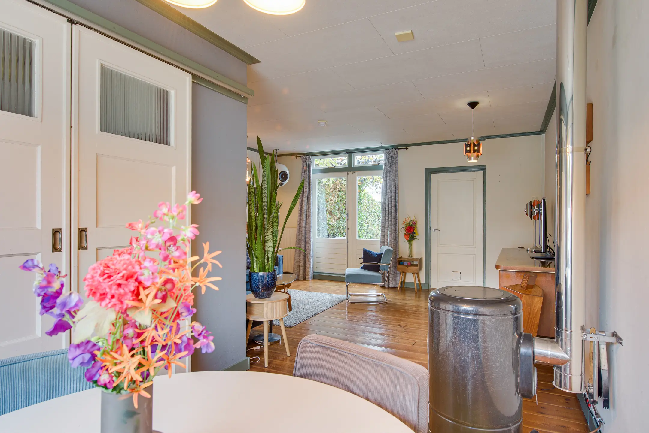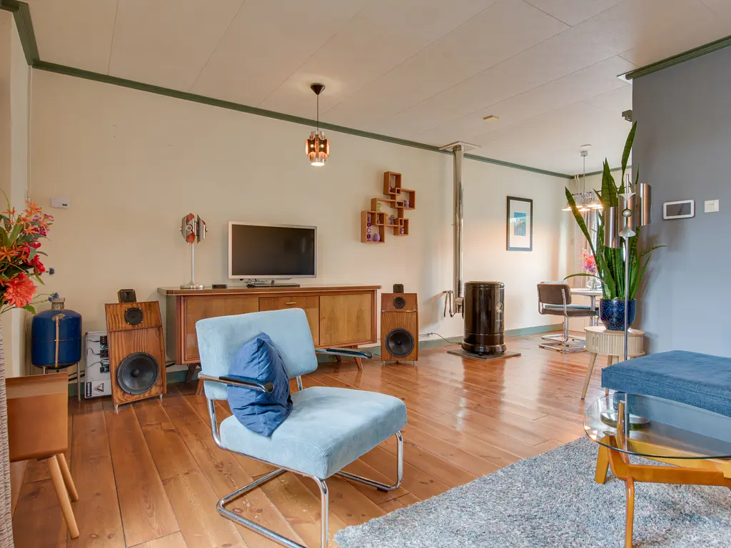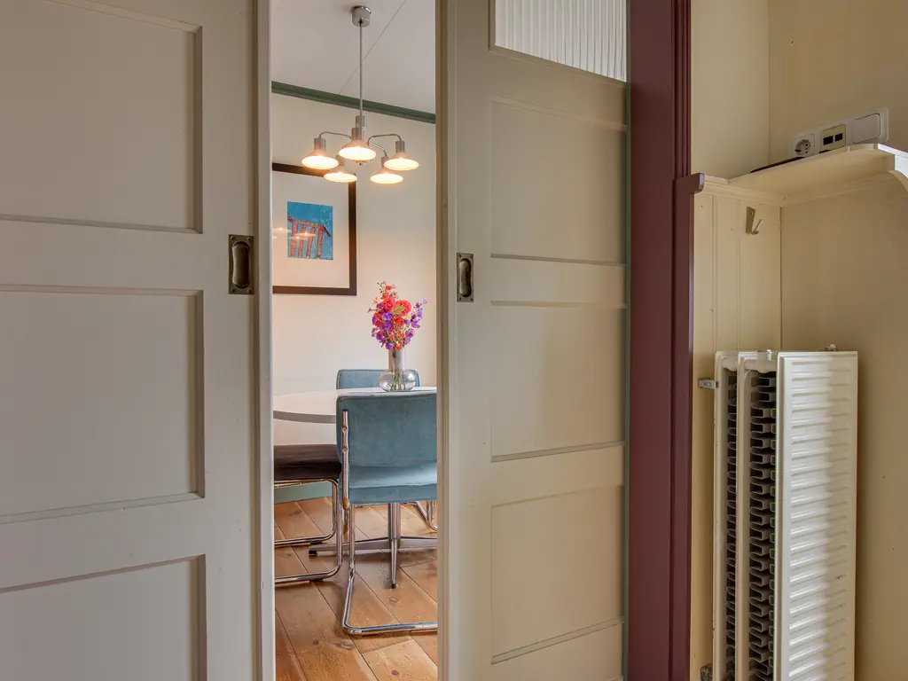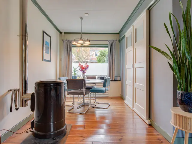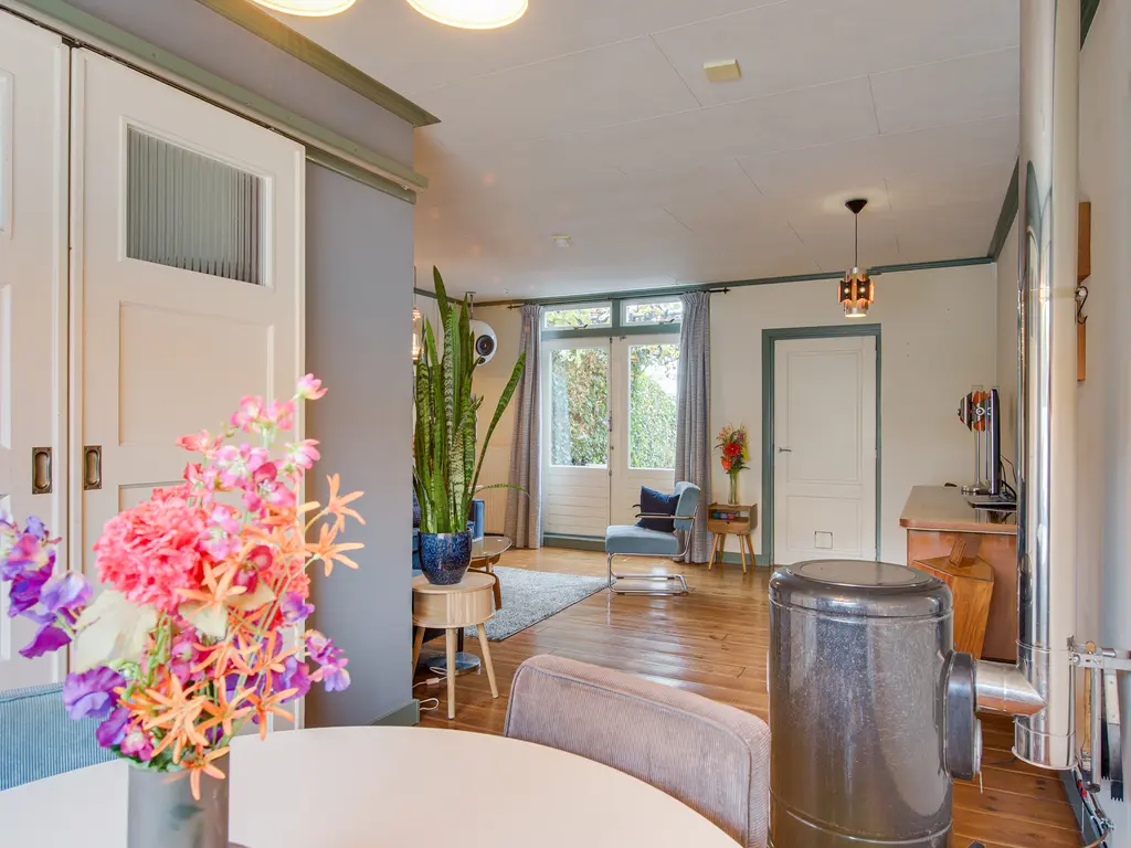 Je stapt binnen in de hal met een apart toilet. Van hier bereik je via schuifdeuren de gezellige woon- en eetkamer. Dankzij het grote raam aan de voorzijde en de openslaande deuren naar de tuin is de ruimte heerlijk licht. De sfeervolle petroleumkachel (blijft achter) zorgt voor extra warmte en charme – het rookkanaal is pas twee jaar geleden geplaatst.