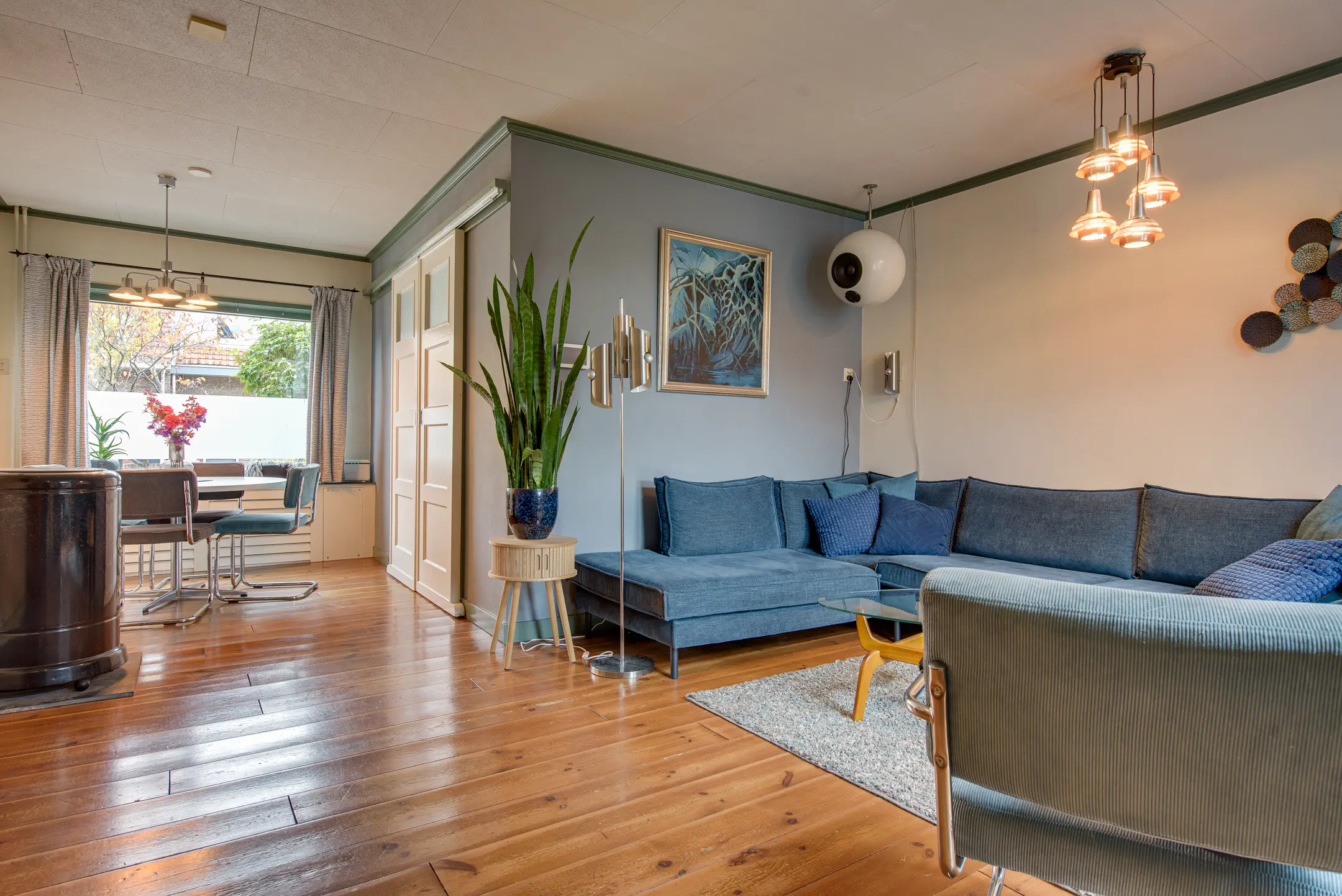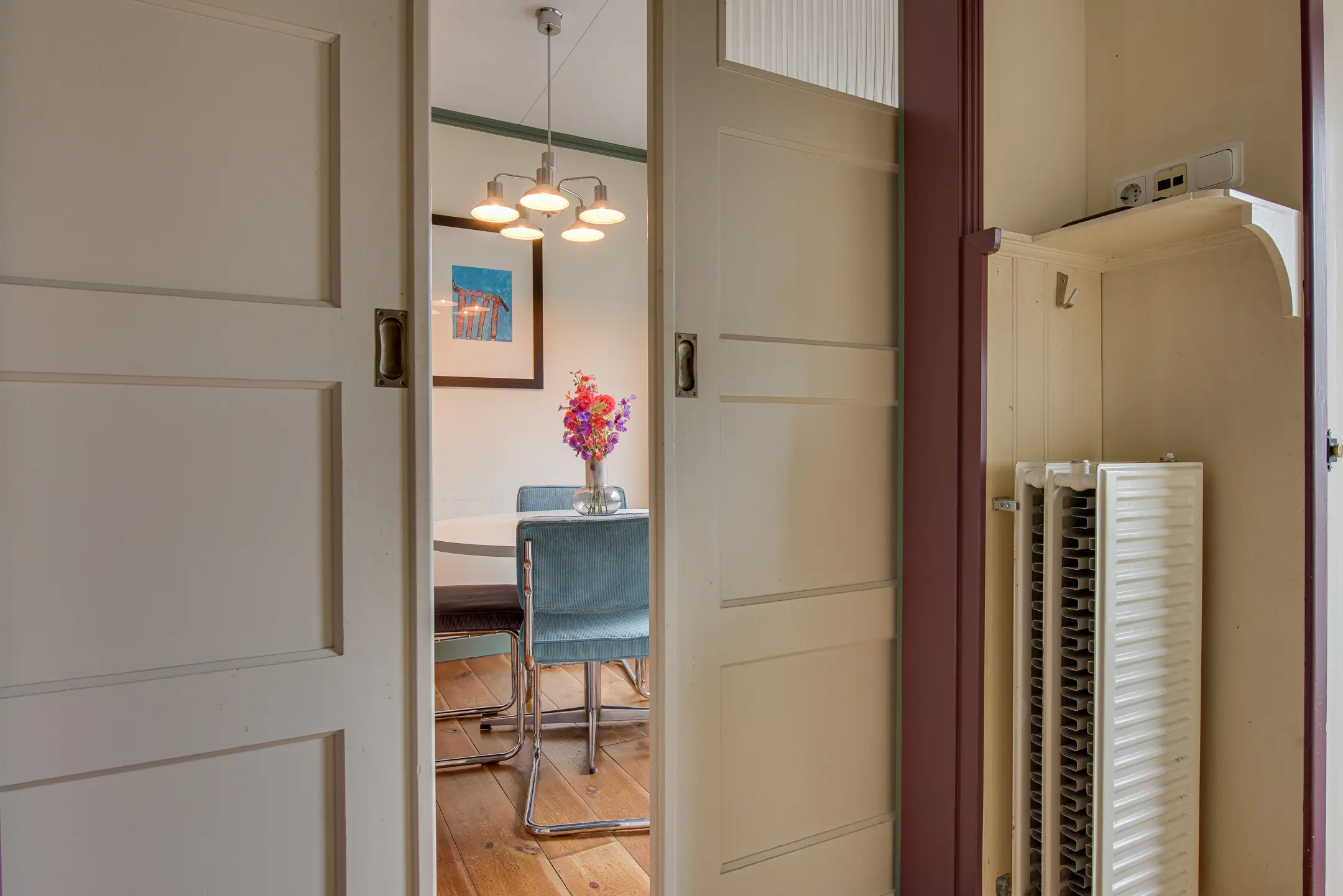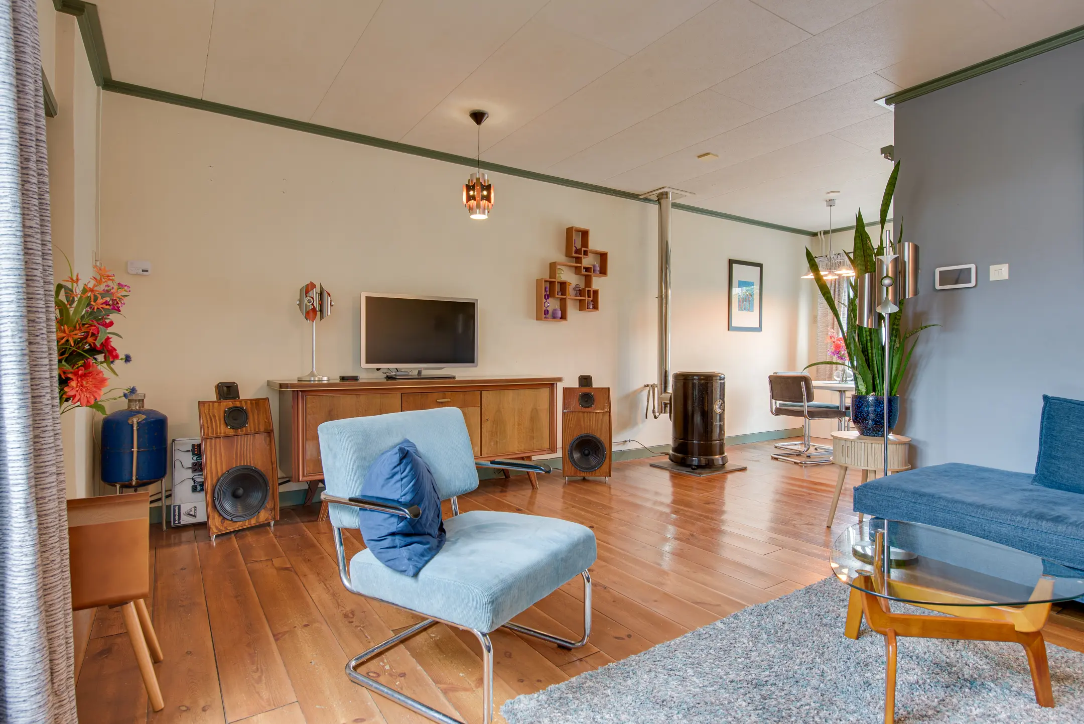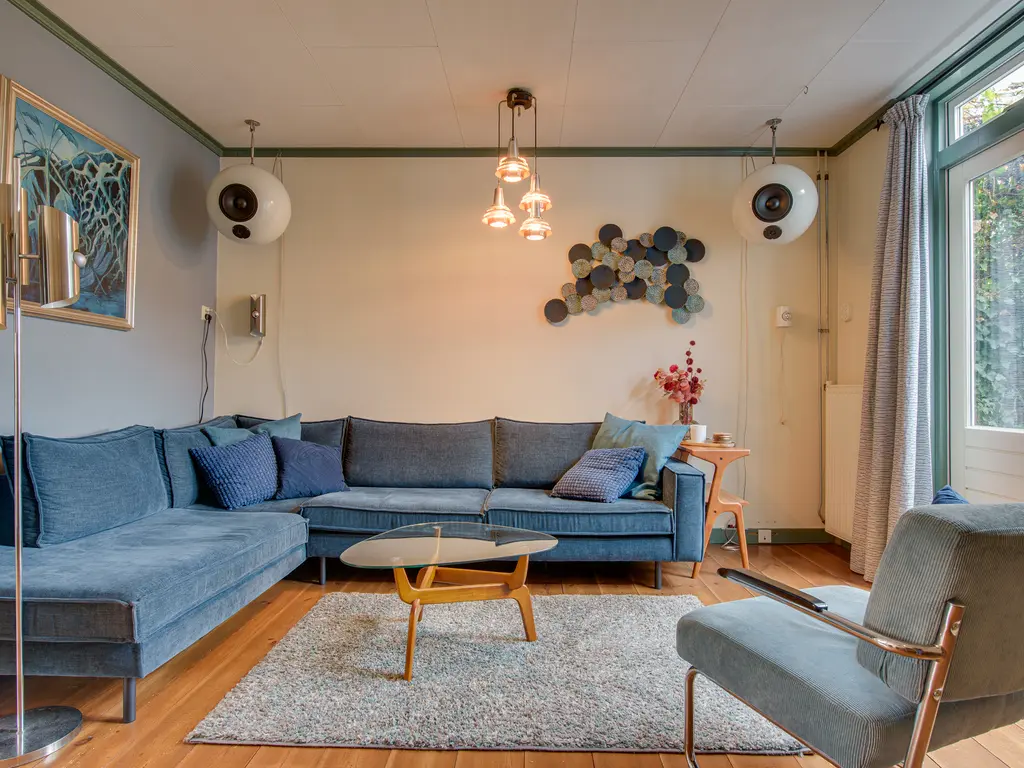 Je stapt binnen in de hal met een apart toilet. Van hier bereik je via schuifdeuren de gezellige woon- en eetkamer. Dankzij het grote raam aan de voorzijde en de openslaande deuren naar de tuin is de ruimte heerlijk licht. De sfeervolle petroleumkachel (blijft achter) zorgt voor extra warmte en charme – het rookkanaal is pas twee jaar geleden geplaatst.
