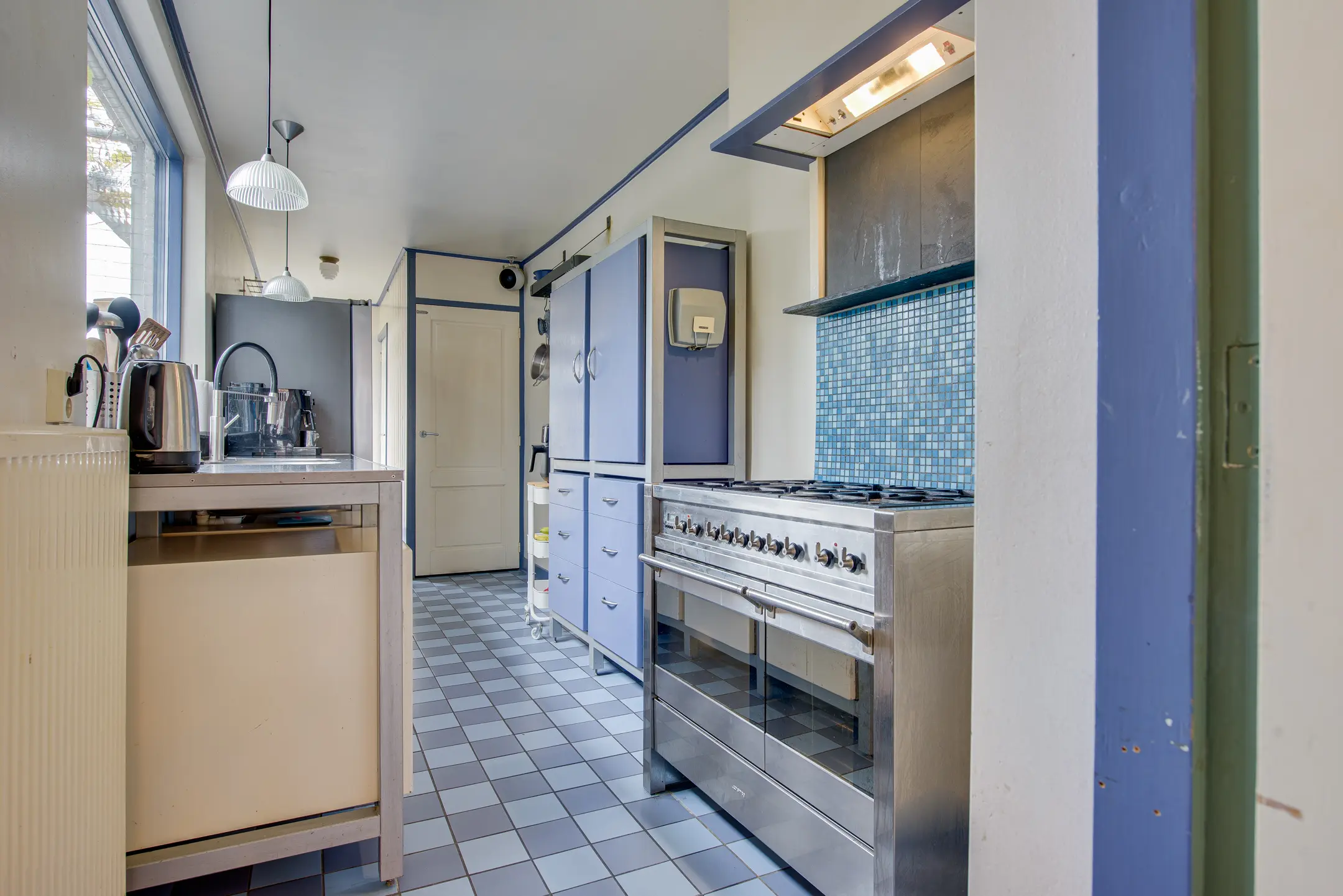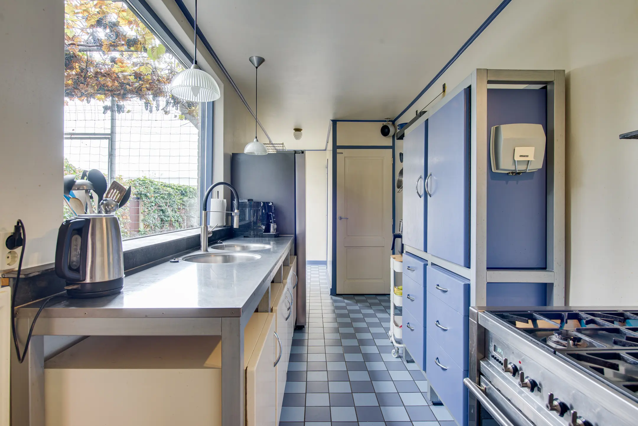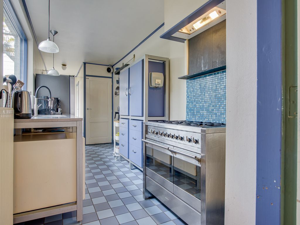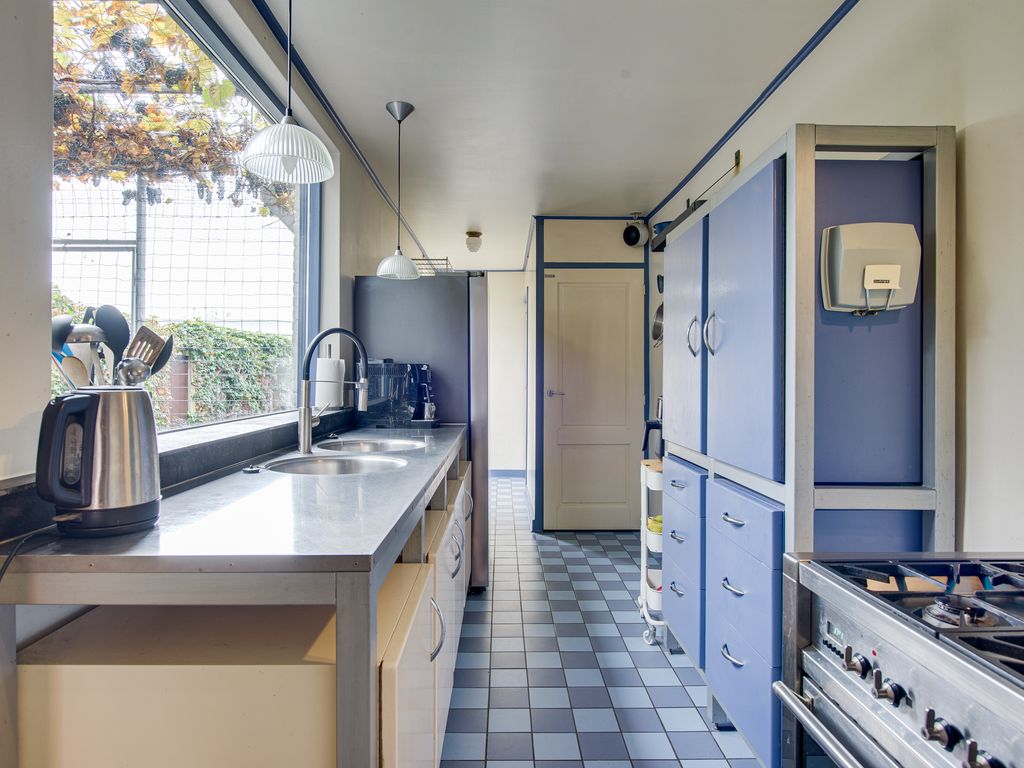 De keuken grenst aan de woonkamer en is een paradijs voor kookliefhebbers. Hier vind je onder andere twee spoelbakken, een 6-pits gasfornuis, twee ovens en een afzuigkap. Het grote raam biedt een prachtig uitzicht op de tuin, zodat je tijdens het koken of borrelen contact houdt met wat er buiten gebeurt.