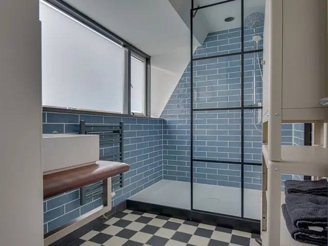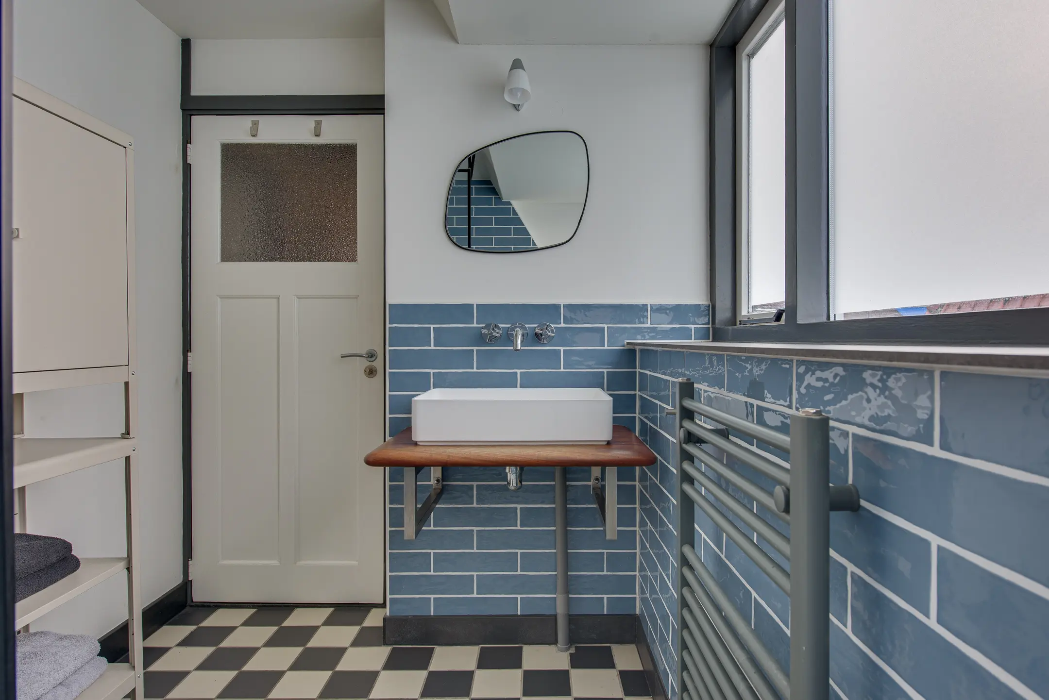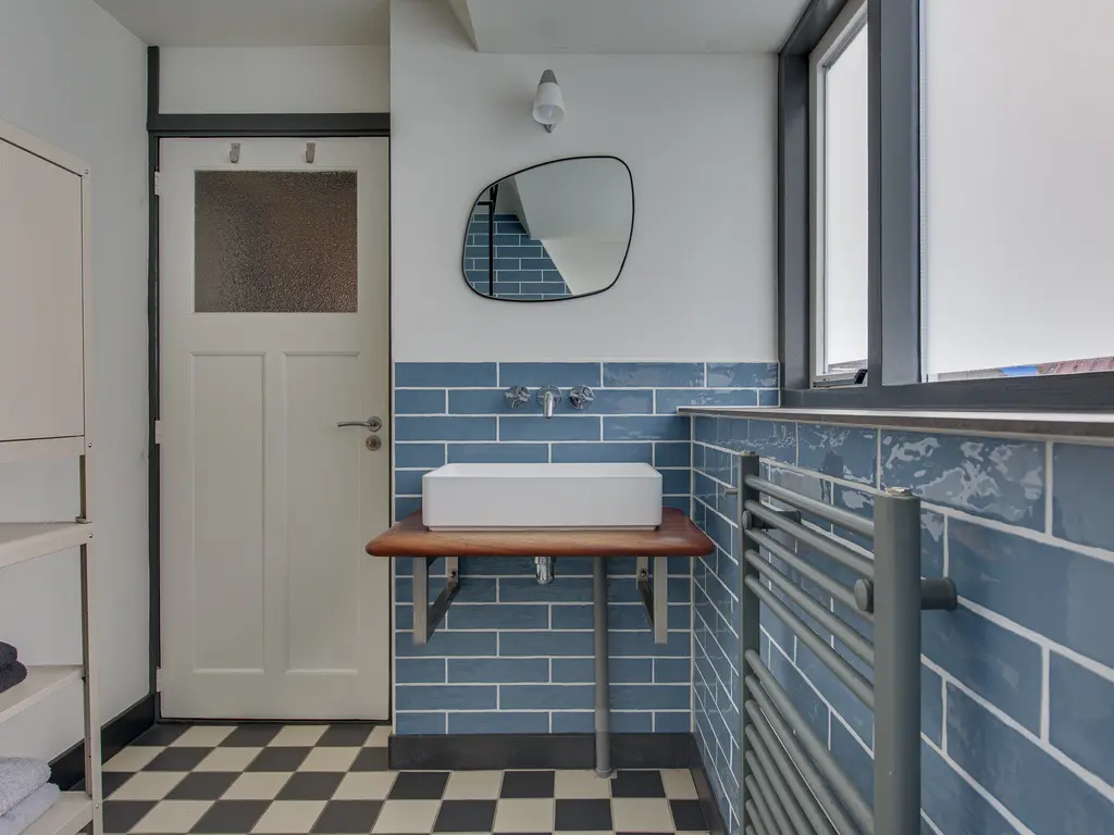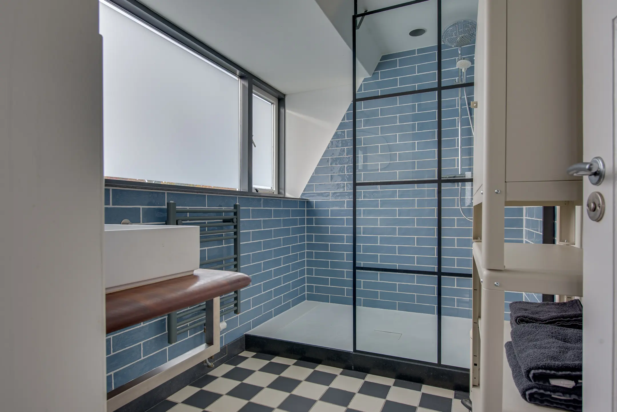 De moderne badkamer is voorzien van een wastafelmeubel, een handdoekradiator en een ruime inloopdouche.