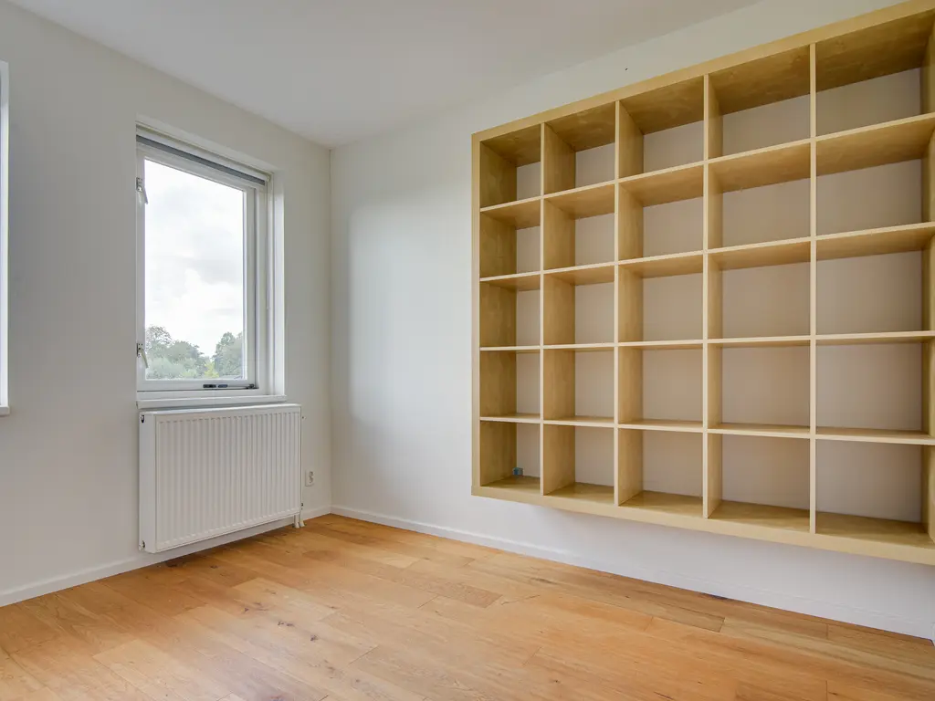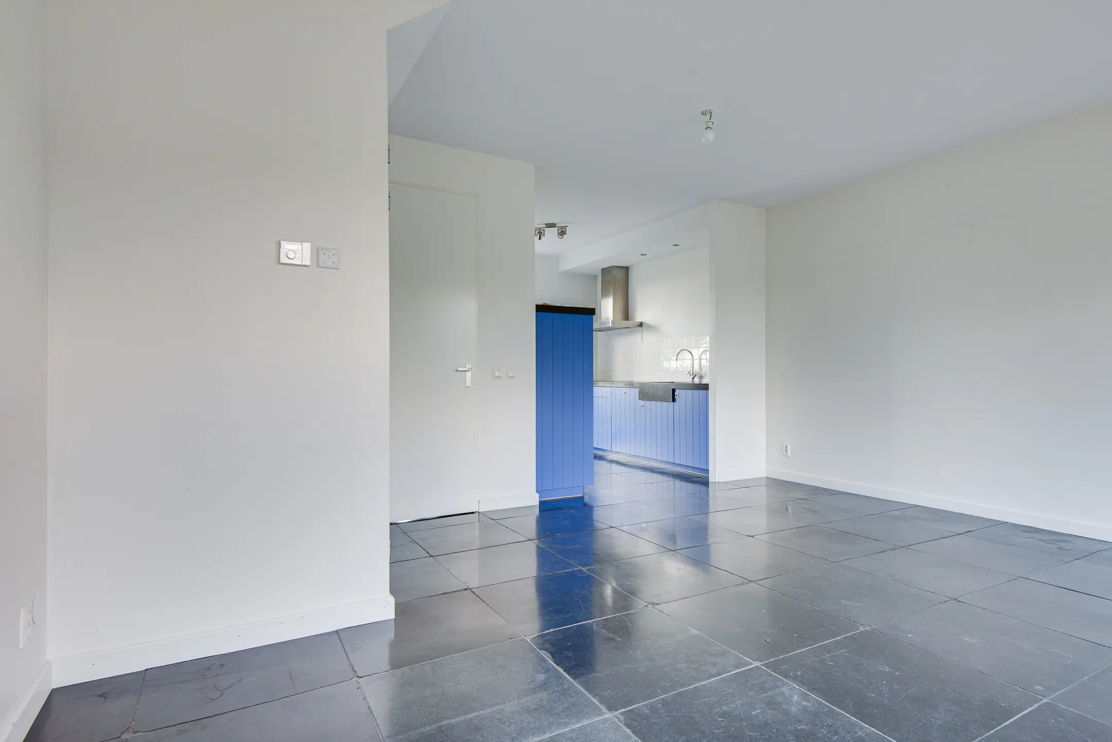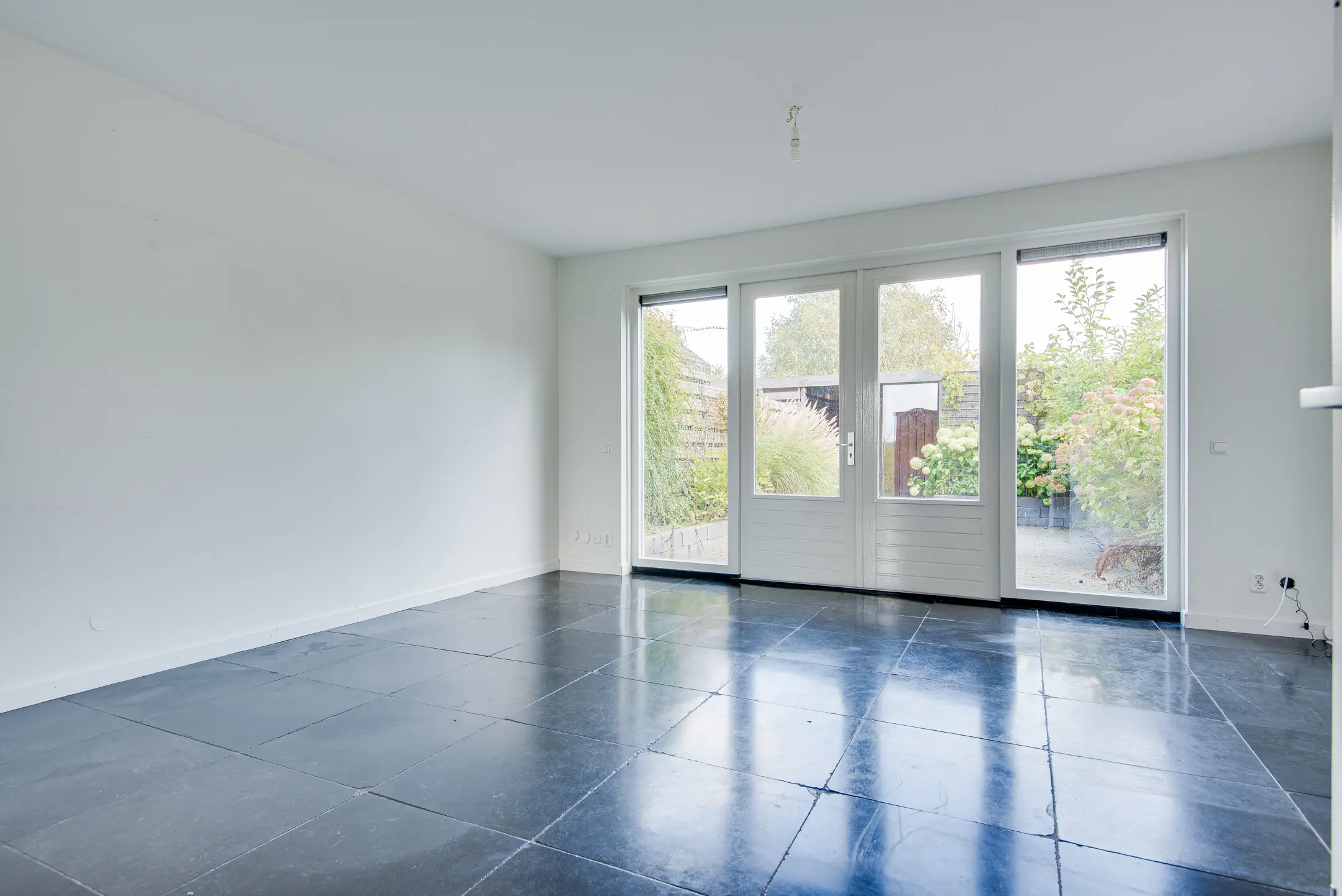 De woonkamer bevindt zich aan de tuinzijde en is lekker licht dankzij de openslaande tuindeuren naar de achtertuin. Ook hier ligt een tegelvloer met vloerverwarming. Onder de trap is een handige provisiekast met daarin de vloerverwarmingsunit.