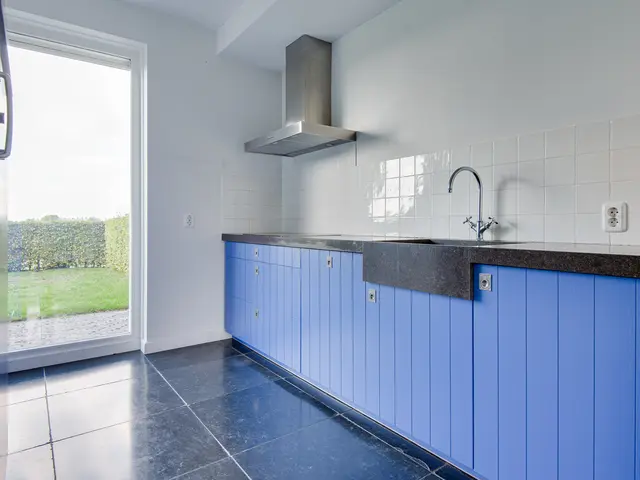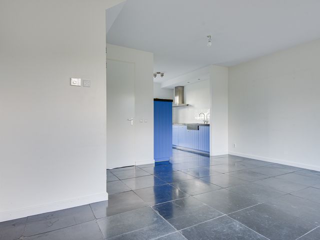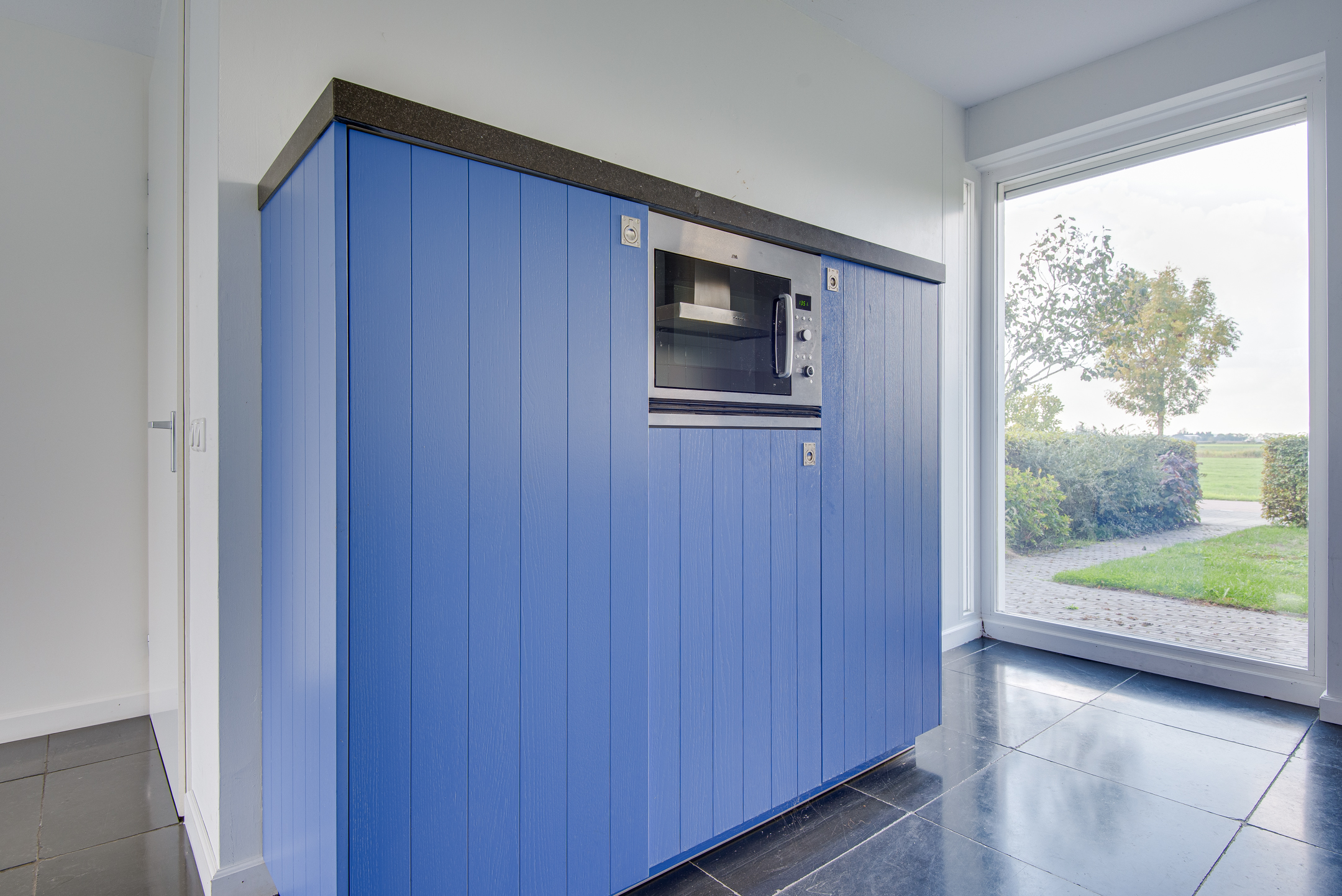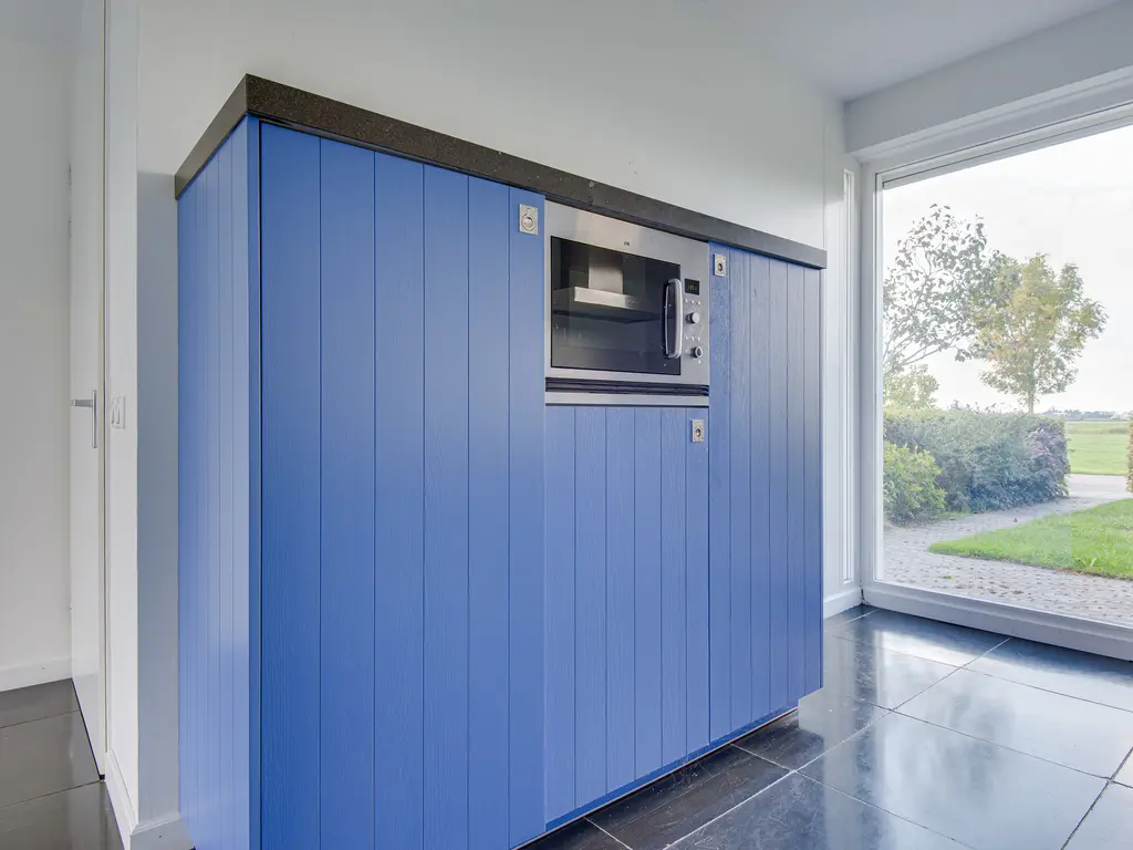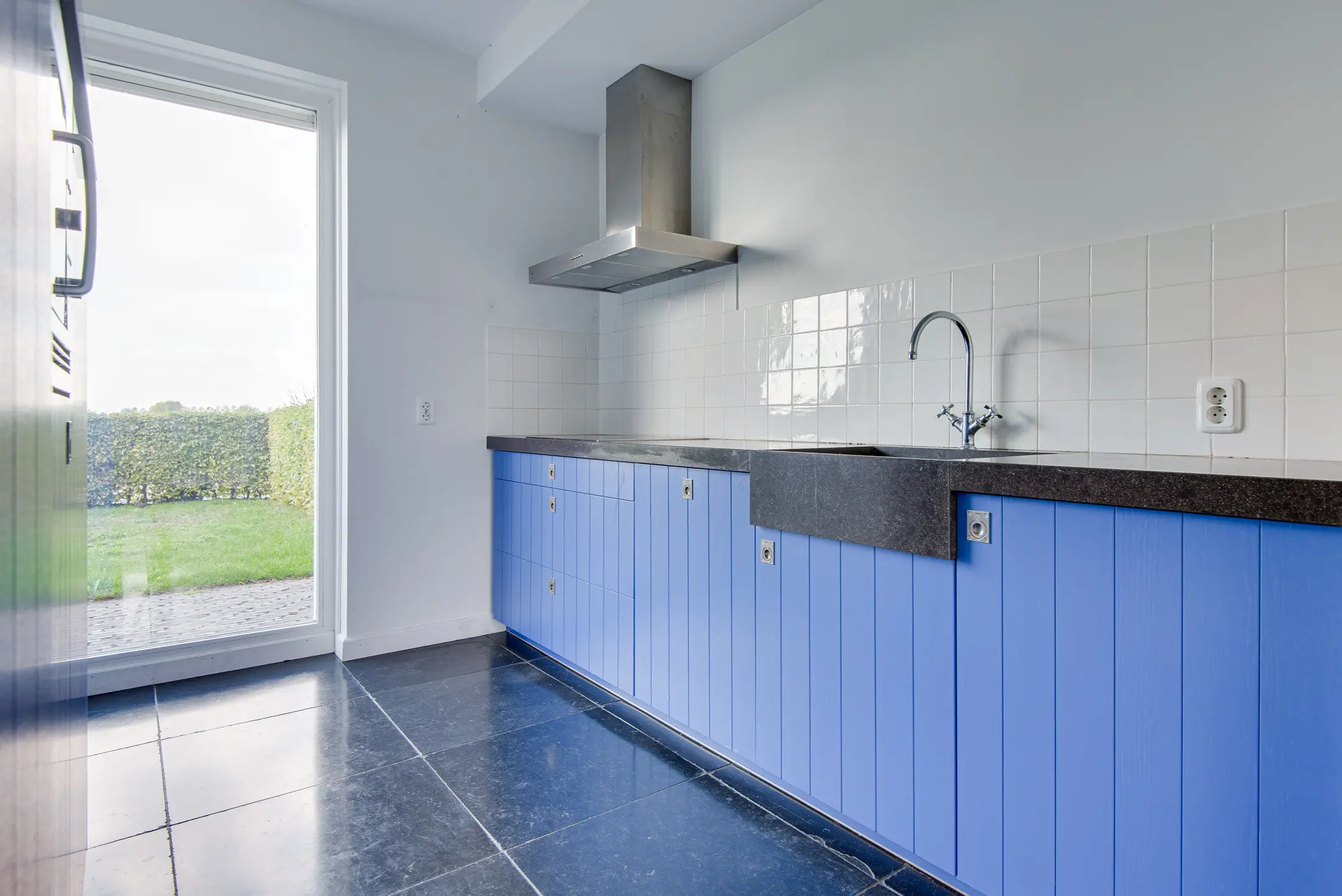 Aan de voorzijde ligt de open keuken, met uitzicht op het groen. De keuken is voorzien van een natuurstenen aanrechtblad en uitgerust met moderne inbouwapparatuur: koelkast, inductiekookplaat, afzuigkap, vaatwasser en combimagnetron.