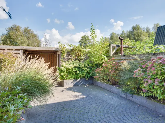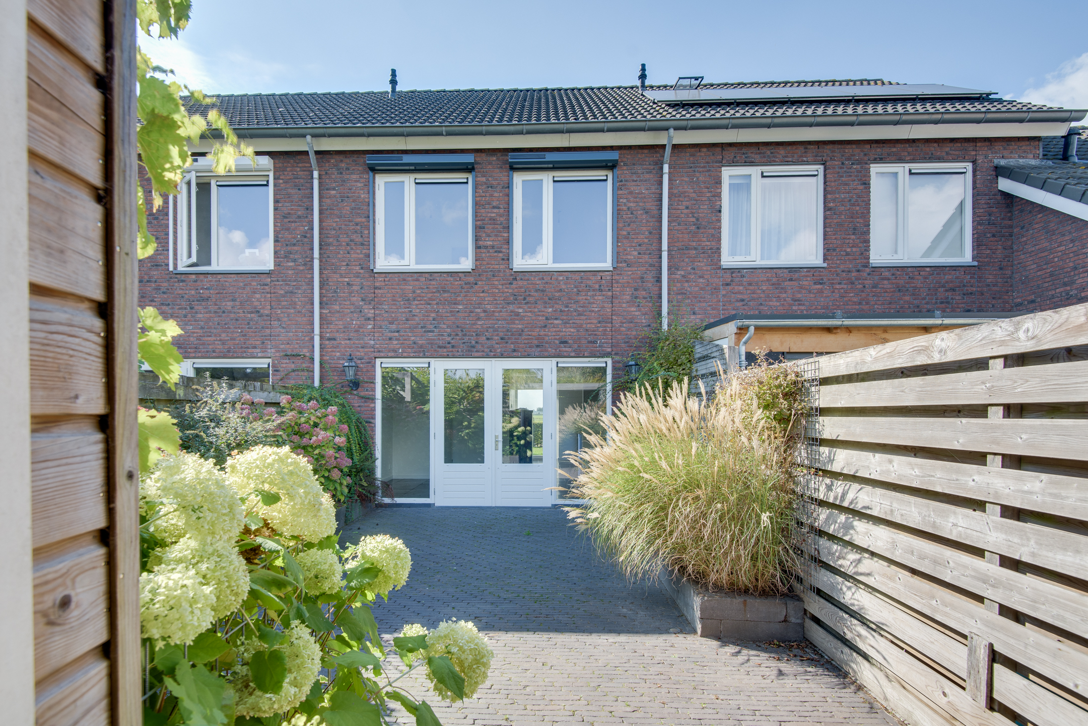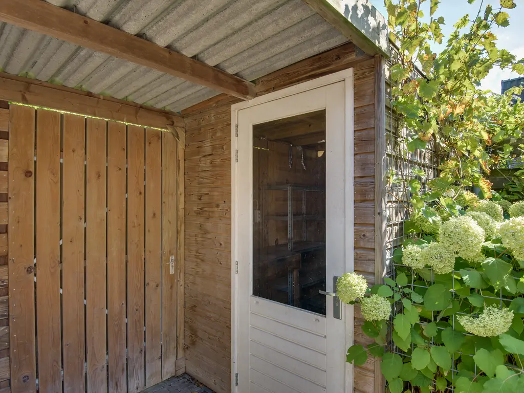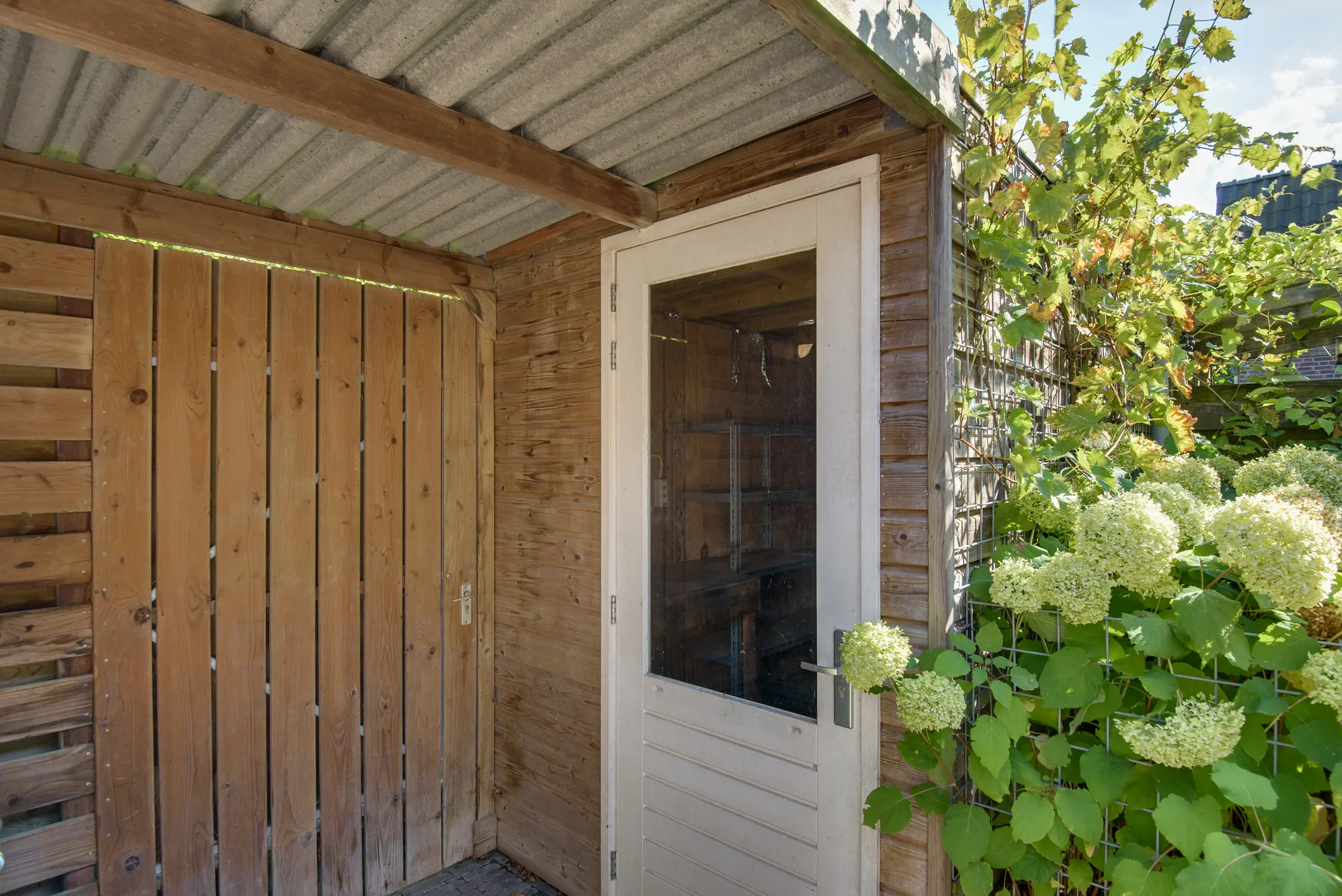 De onderhoudsvriendelijke achtertuin ligt op het oosten en is sfeervol aangelegd met sierbestrating, borders en diverse beplantingen. Achter in de tuin staat een praktische houten berging en via de achterom heb je extra gemak.