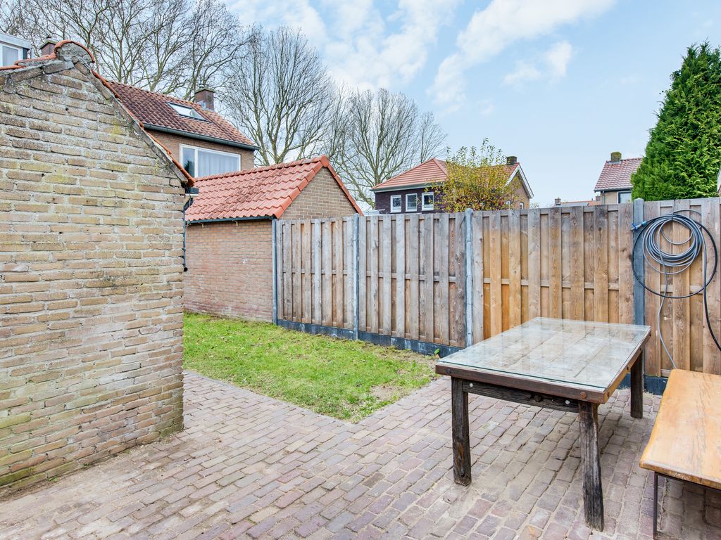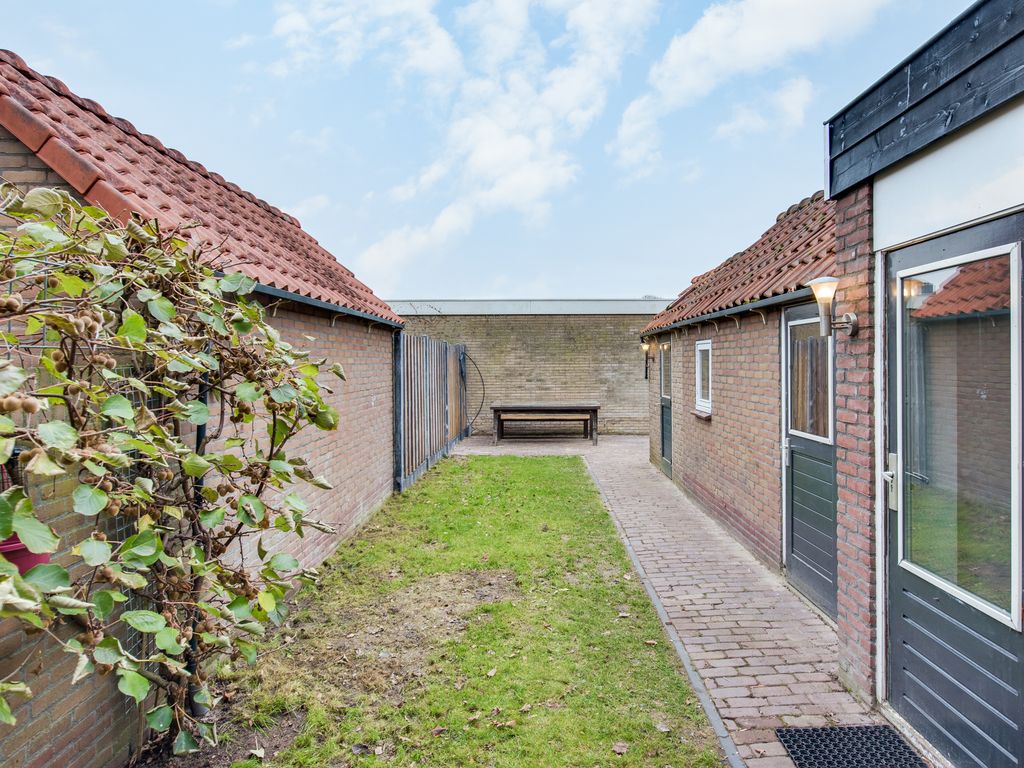 Via de keuken stap je zo de tuin in. Direct achter de woning ligt een gezellig terrasje om heerlijk buiten te zitten, verder een gazon en groene erfafscheiding.