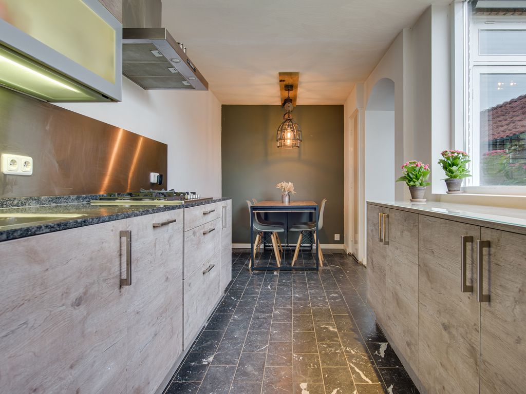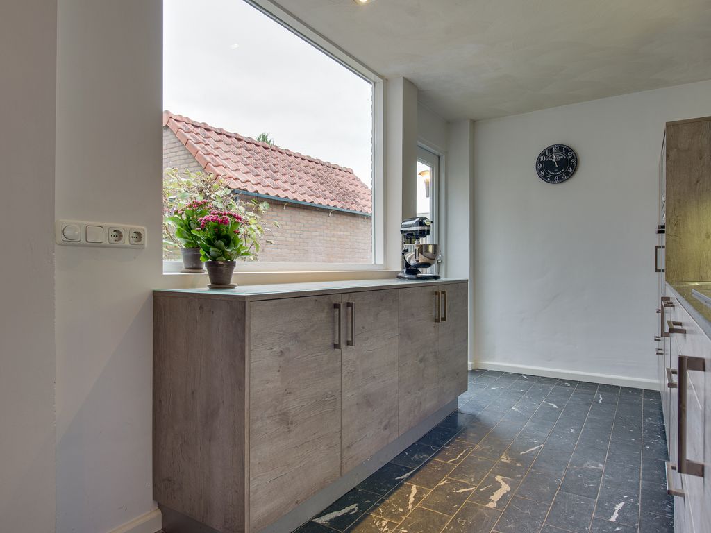 De keuken in de aanbouw is een fijne plek voor kookliefhebbers, compleet met diverse inbouwapparatuur zoals een 5-pits gasstel, oven, magnetron en vaatwasser. Er is ruimte voor een eethoek, maar ook in de woonkamer kun je heerlijk tafelen.
