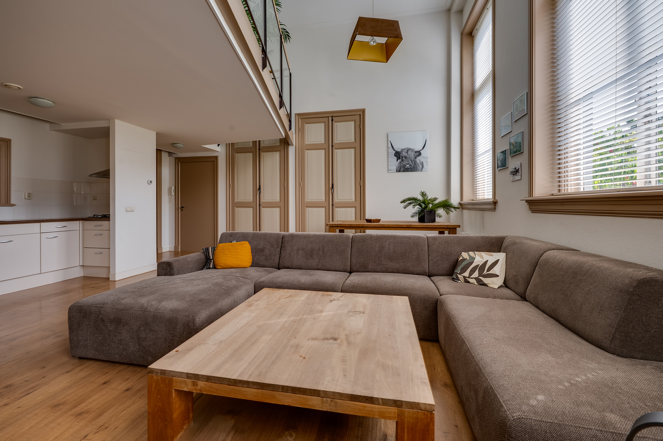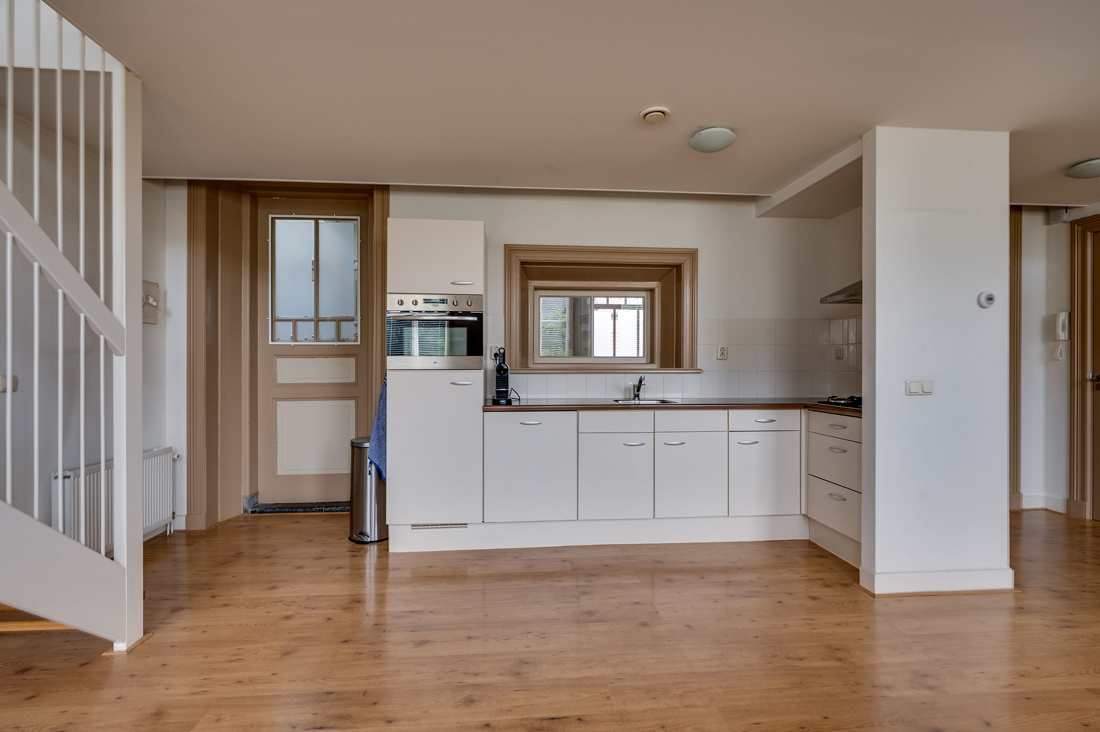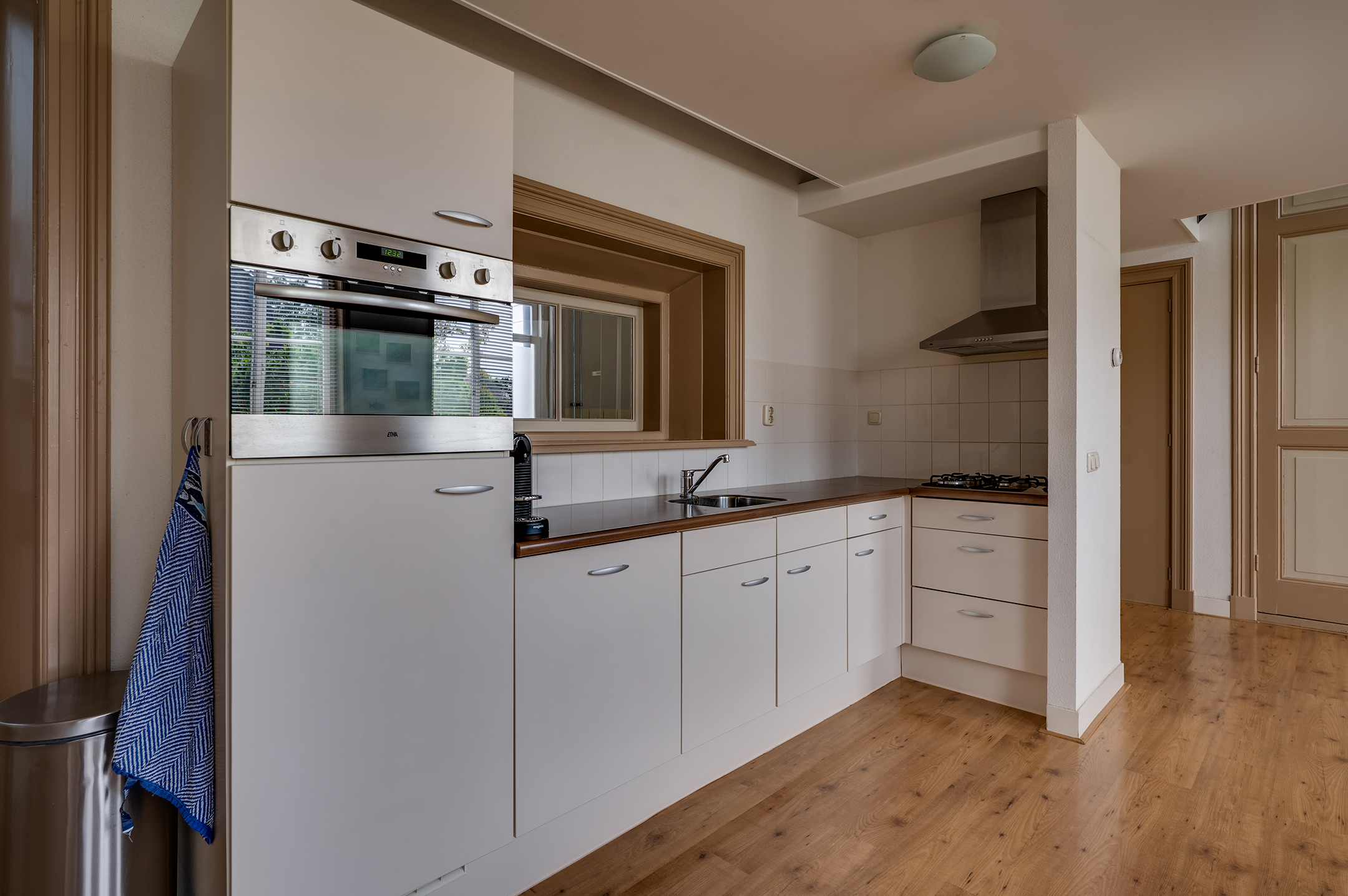 Via de entree van de woning kom je bij de hal met het toilet en de woonkamer. De ruime woonkamer verwelkomt je met prachtige hoge ramen en deuren die voor een bijzondere uitstraling zorgen. De hoge plafonds geven een extra gevoel van licht en ruimte. Aan de woonkamer grenst de open keuken, compleet uitgerust met een combi-oven, koelkast, vaatwasser, 4-pits gasfornuis en afzuigkap.