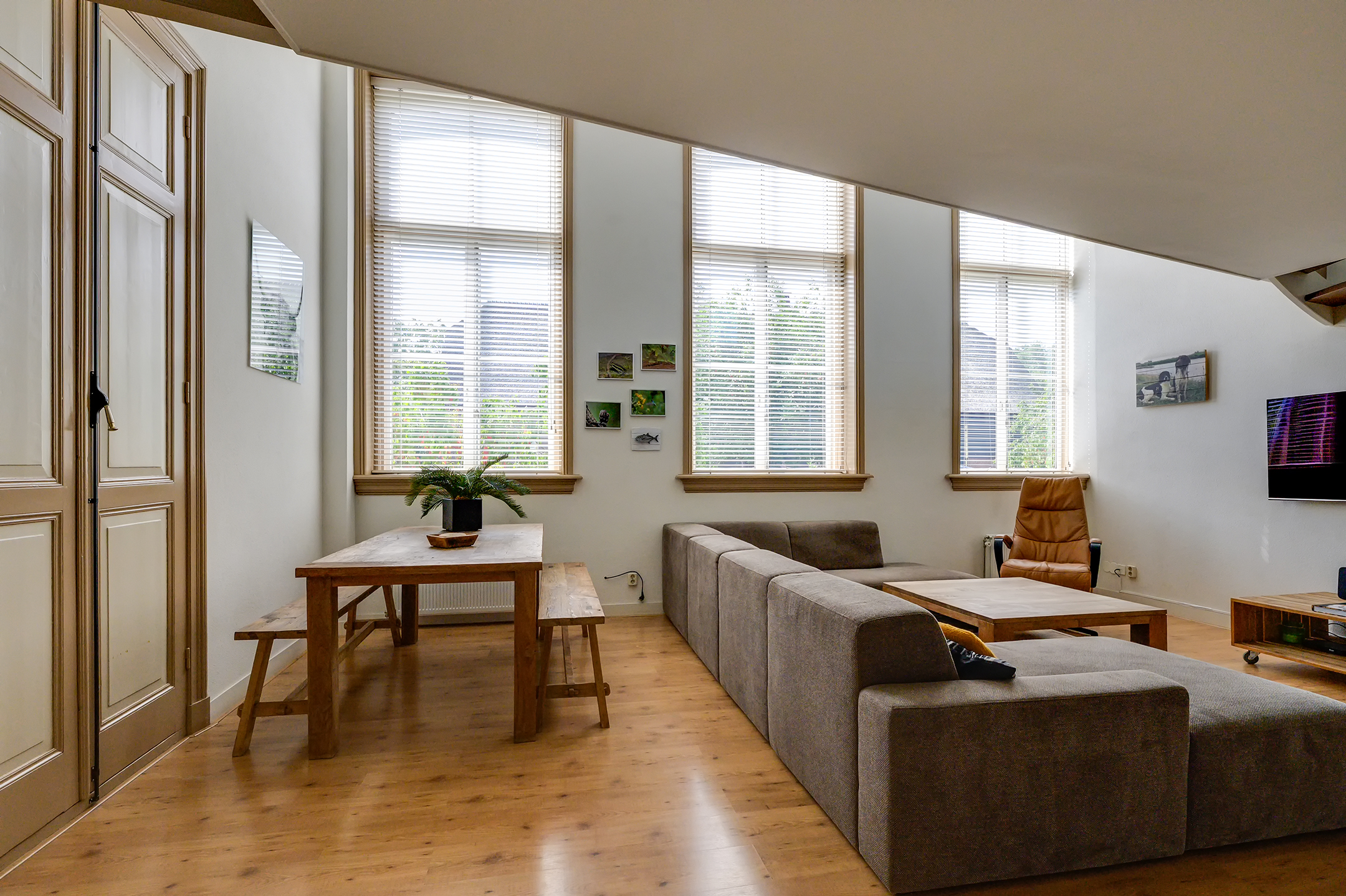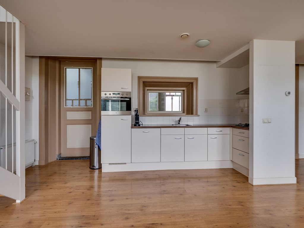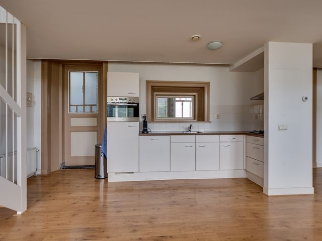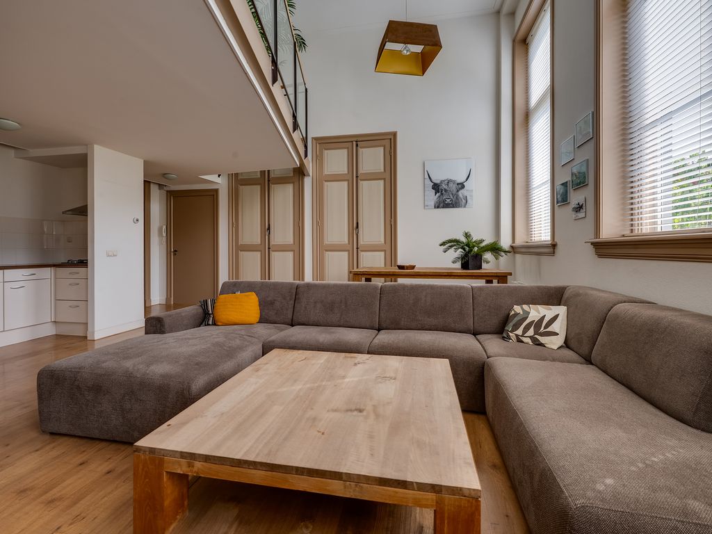 Via de entree van de woning kom je bij de hal met het toilet en de woonkamer. De ruime woonkamer verwelkomt je met prachtige hoge ramen en deuren die voor een bijzondere uitstraling zorgen. De hoge plafonds geven een extra gevoel van licht en ruimte. Aan de woonkamer grenst de open keuken, compleet uitgerust met een combi-oven, koelkast, vaatwasser, 4-pits gasfornuis en afzuigkap.