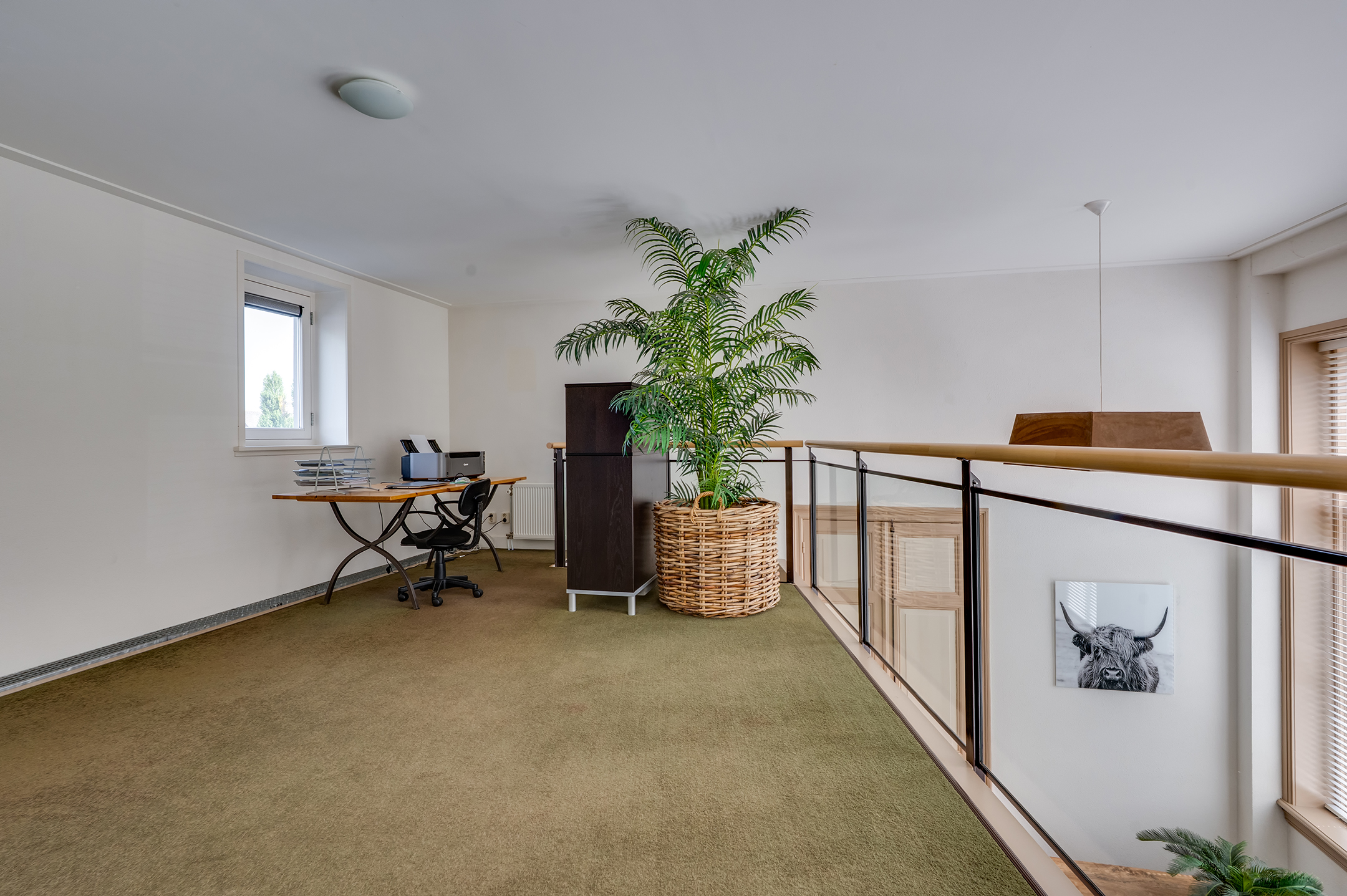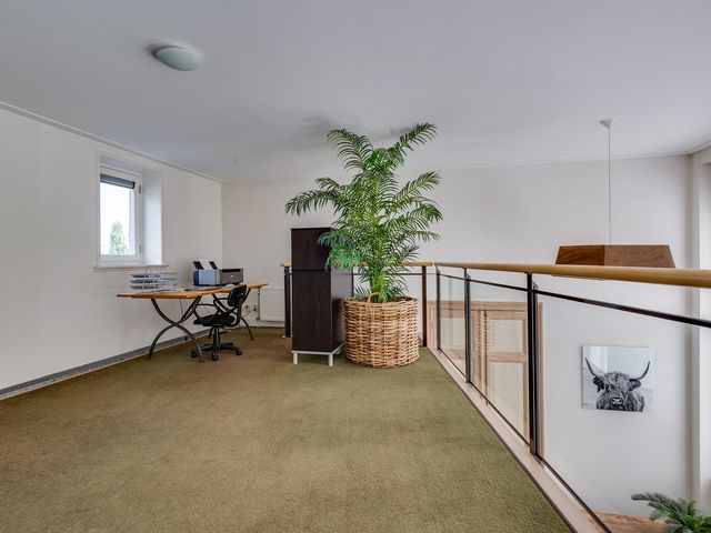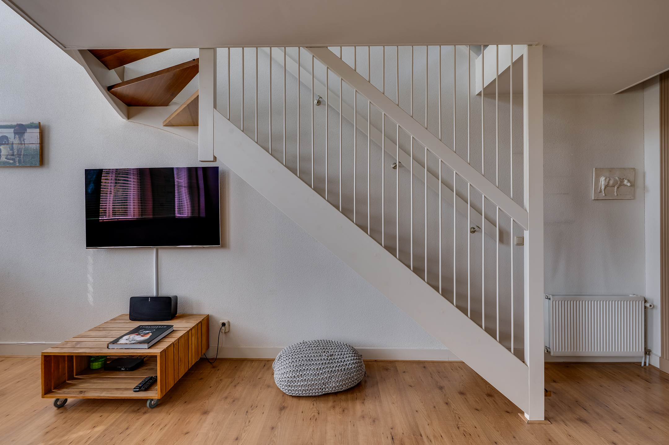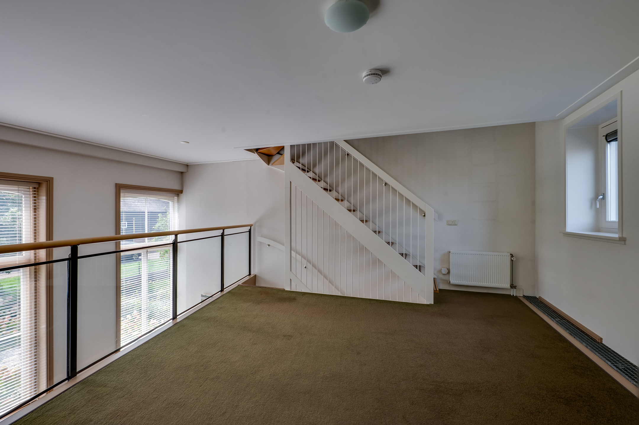 Vanuit de woonkamer bereik je de eerste verdieping – een soort binnen balkon dat je helemaal naar wens kunt inrichten. Denk aan een werkplek, een leeshoek of gewoon een fijne extra zitruimte.