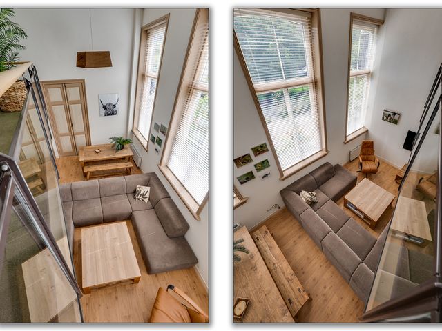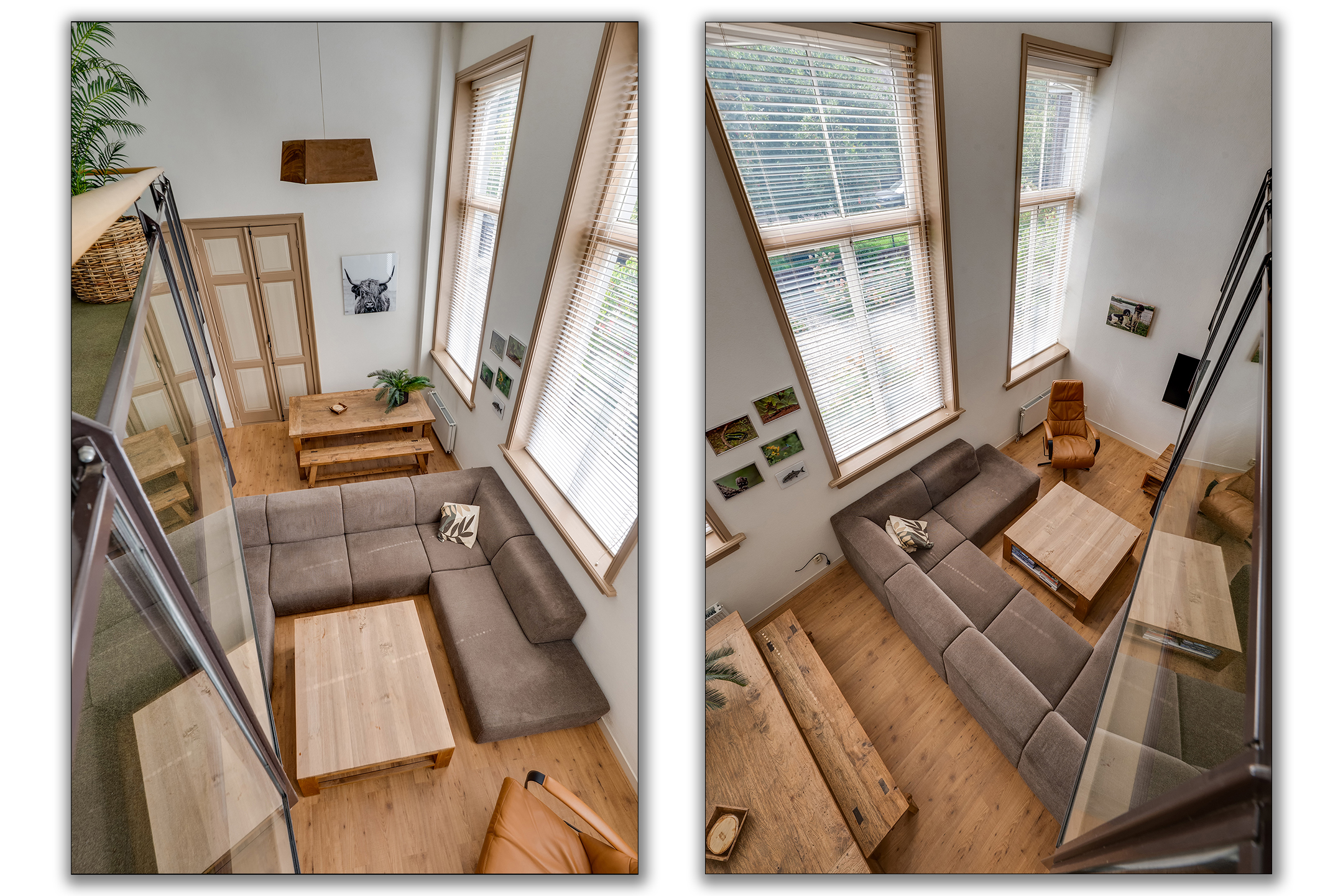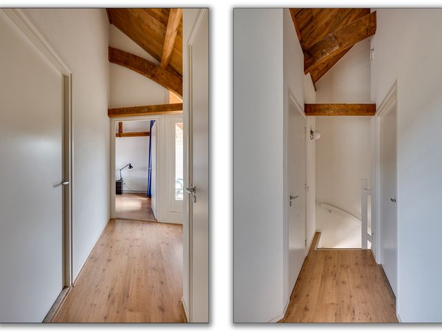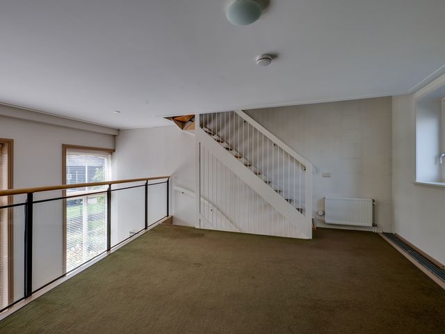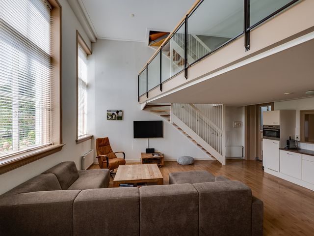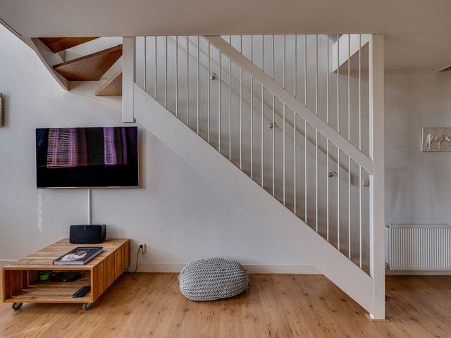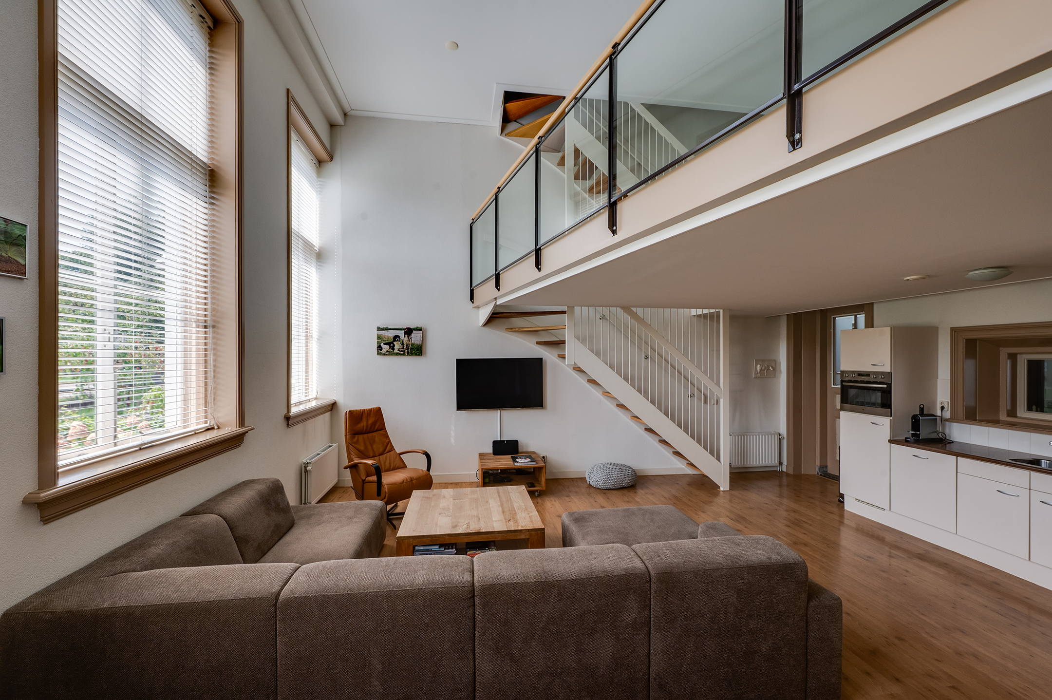 Vanuit de woonkamer bereik je de eerste verdieping – een soort binnen balkon dat je helemaal naar wens kunt inrichten. Denk aan een werkplek, een leeshoek of gewoon een fijne extra zitruimte.