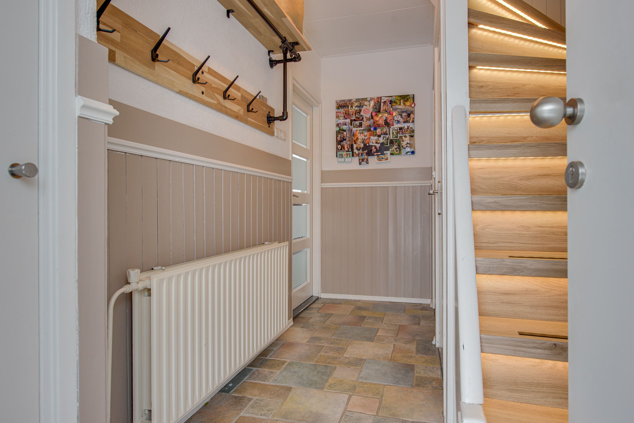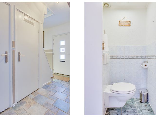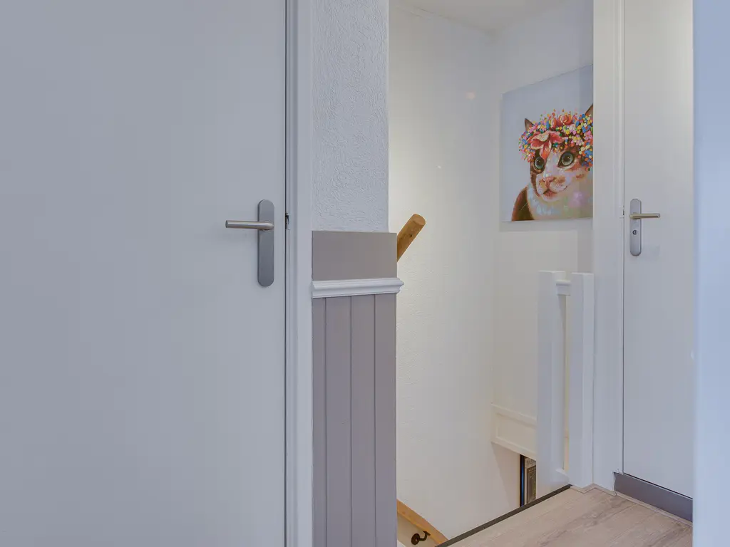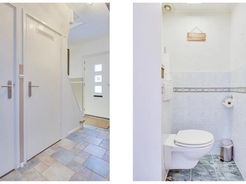 Via de nette hal met tegelvloer en lichte lambrisering kom je binnen. Hier vind je het toilet, de trapopgang en een handige trapkast.