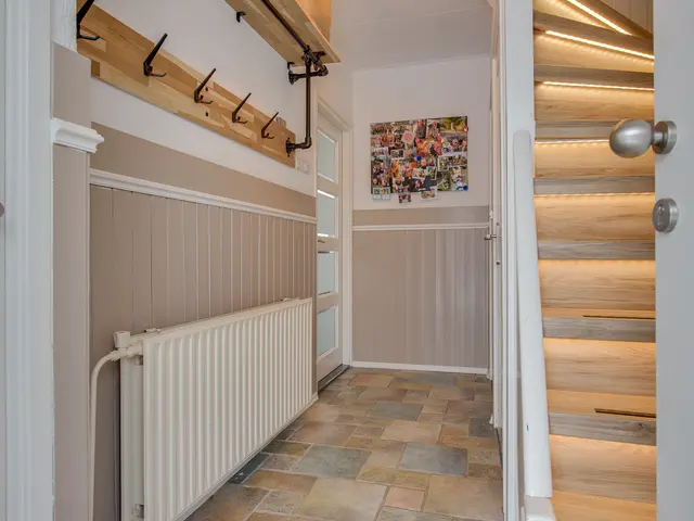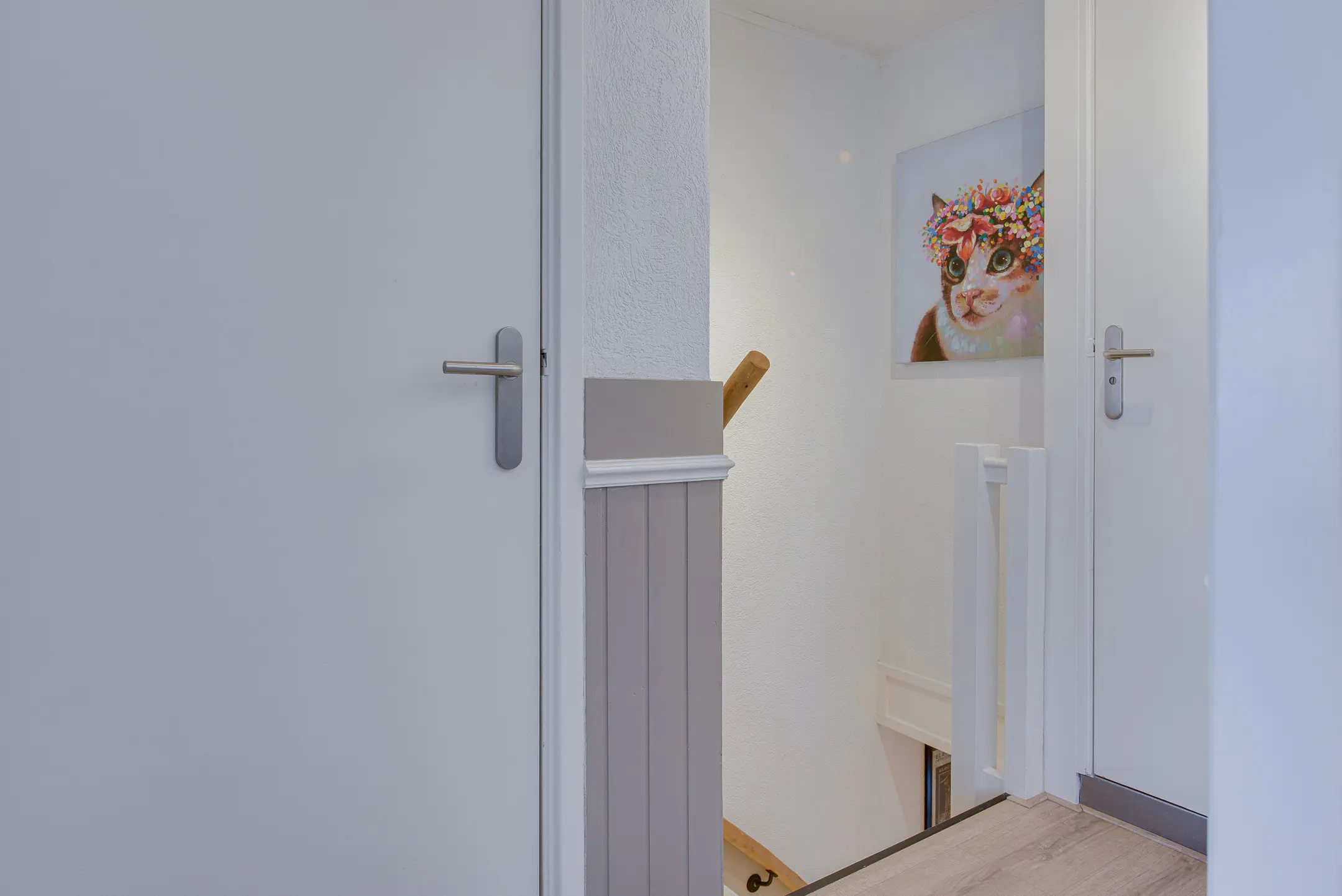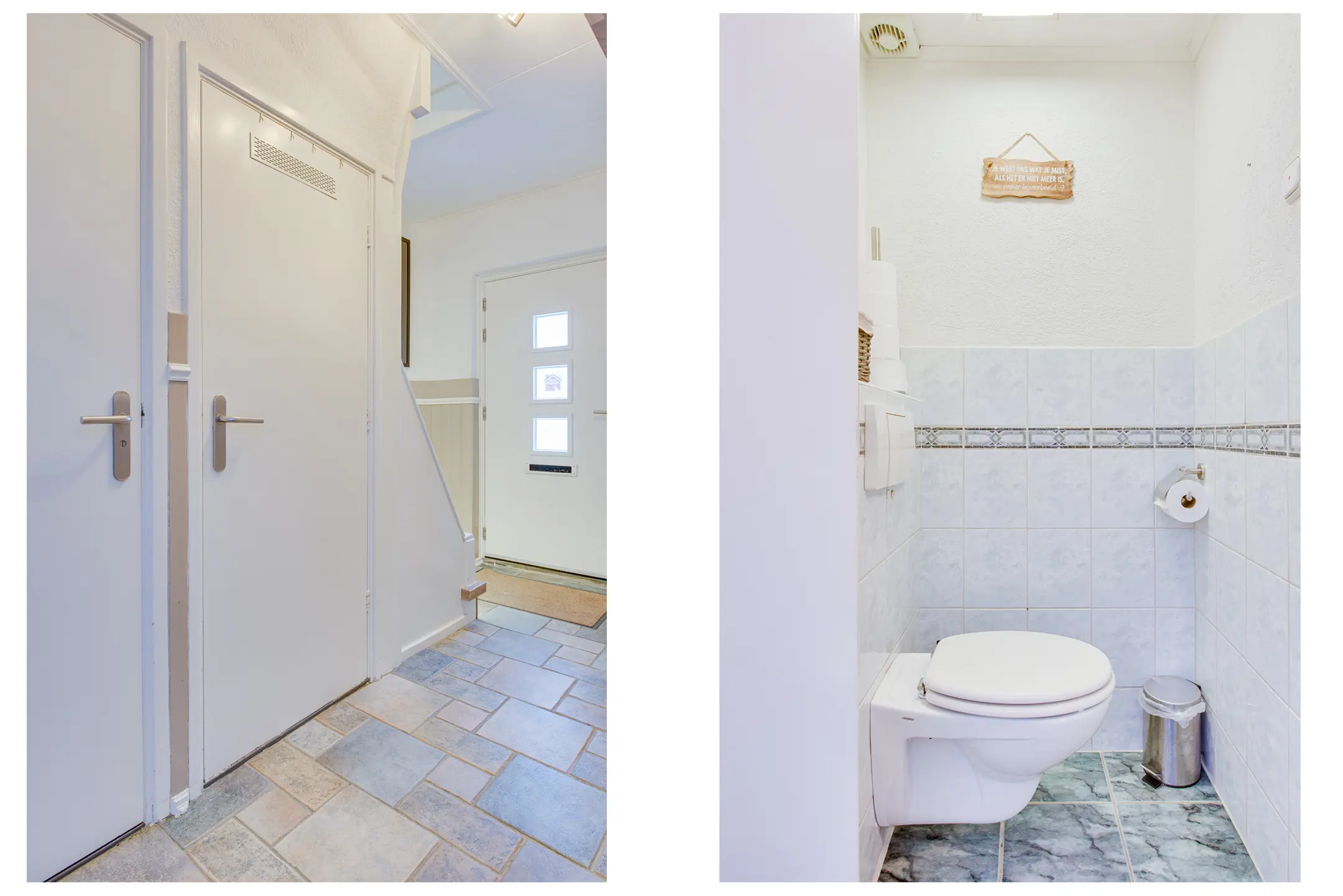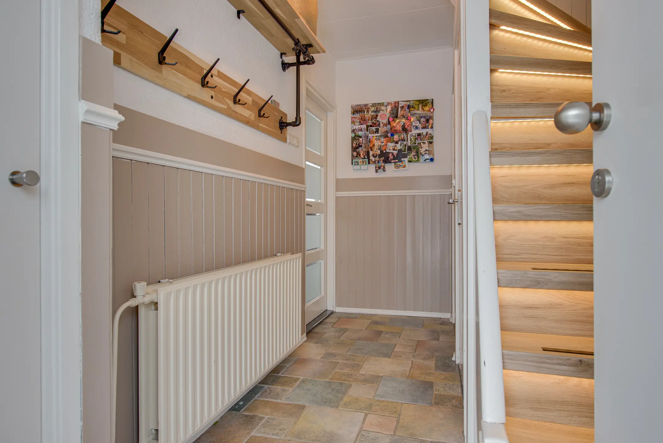 Via de nette hal met tegelvloer en lichte lambrisering kom je binnen. Hier vind je het toilet, de trapopgang en een handige trapkast.