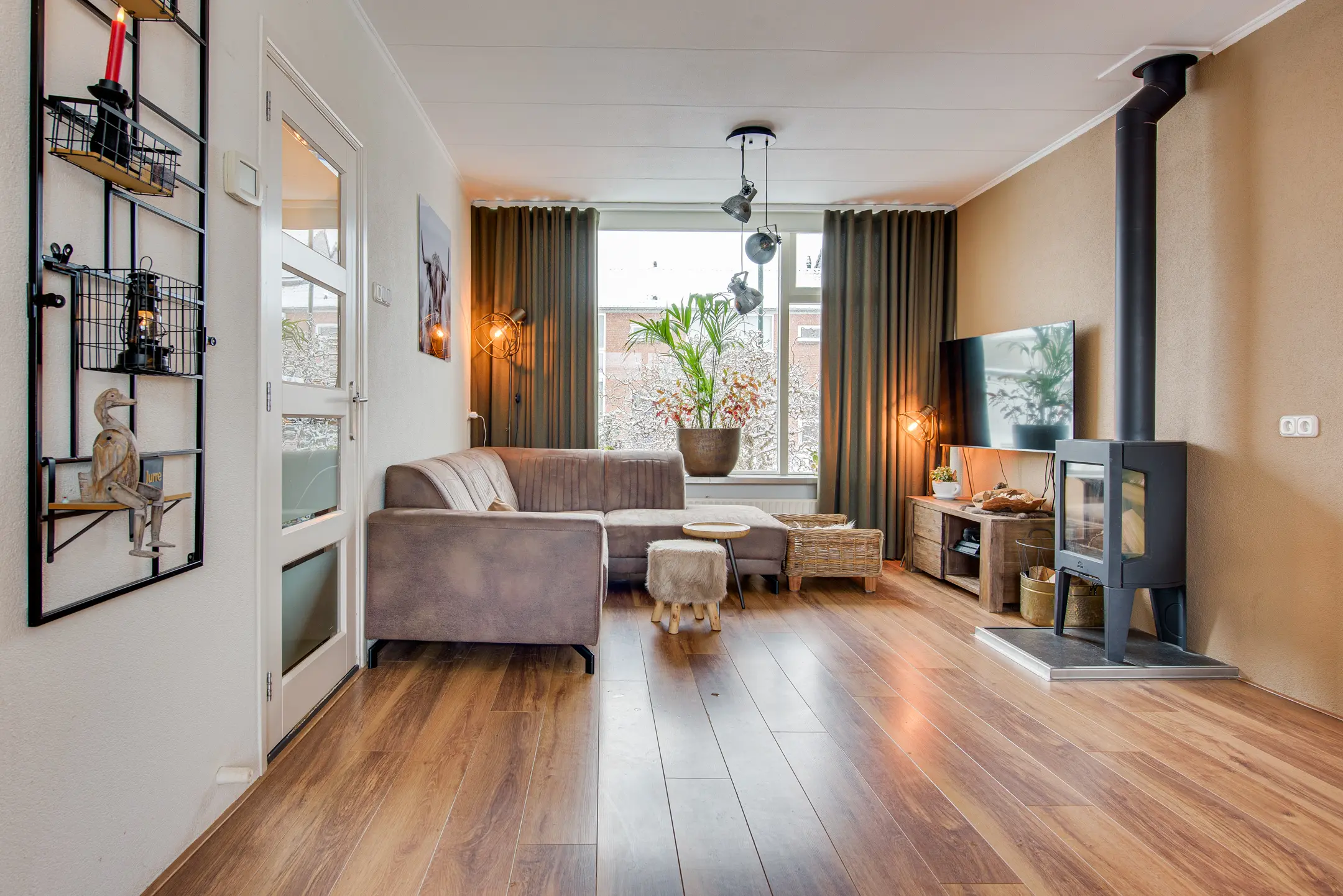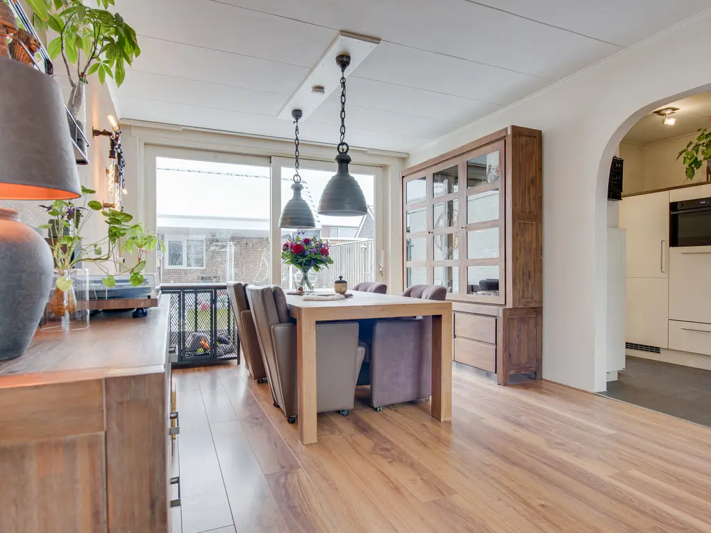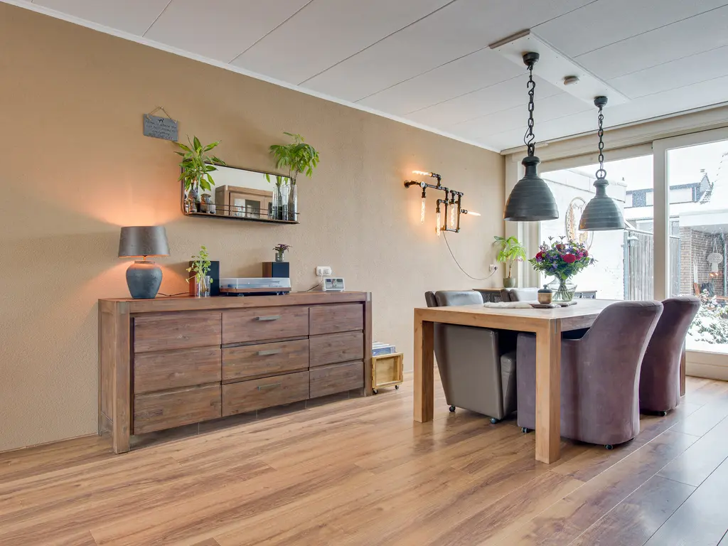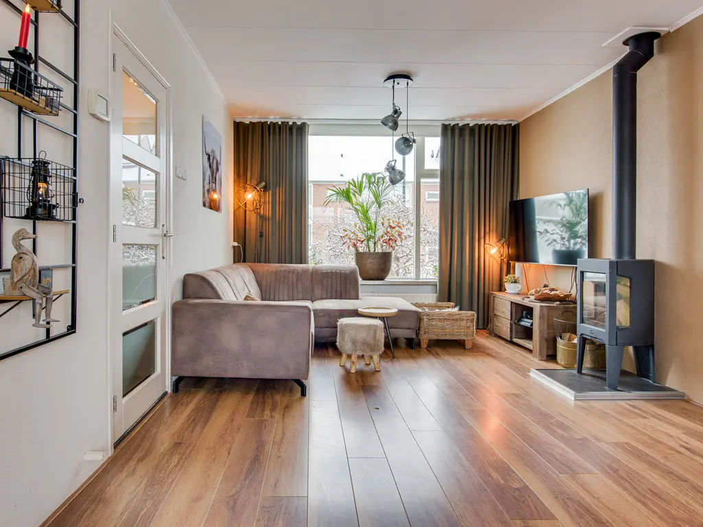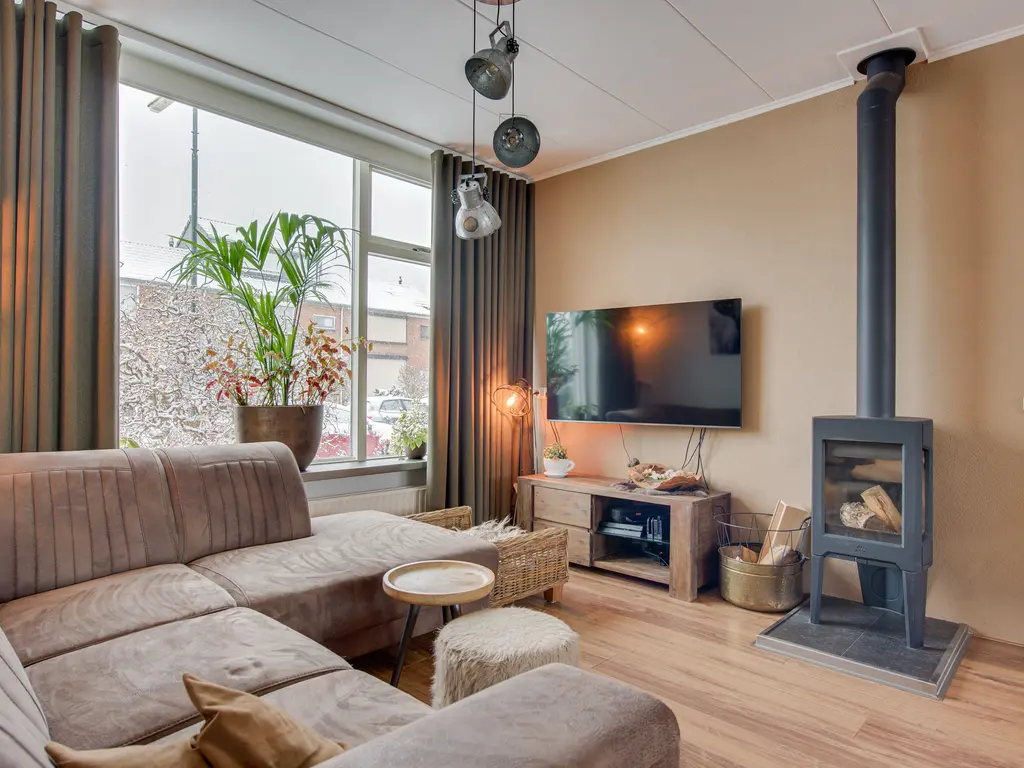 De lichte woonkamer is ruim opgezet en verdeeld in een gezellig zitgedeelte aan de voorzijde en een eetgedeelte aan de achterzijde. De houtkachel zorgt voor extra sfeer en warmte. Via de schuifpui loop je zo de achtertuin in – perfect voor binnen-buitenleven.