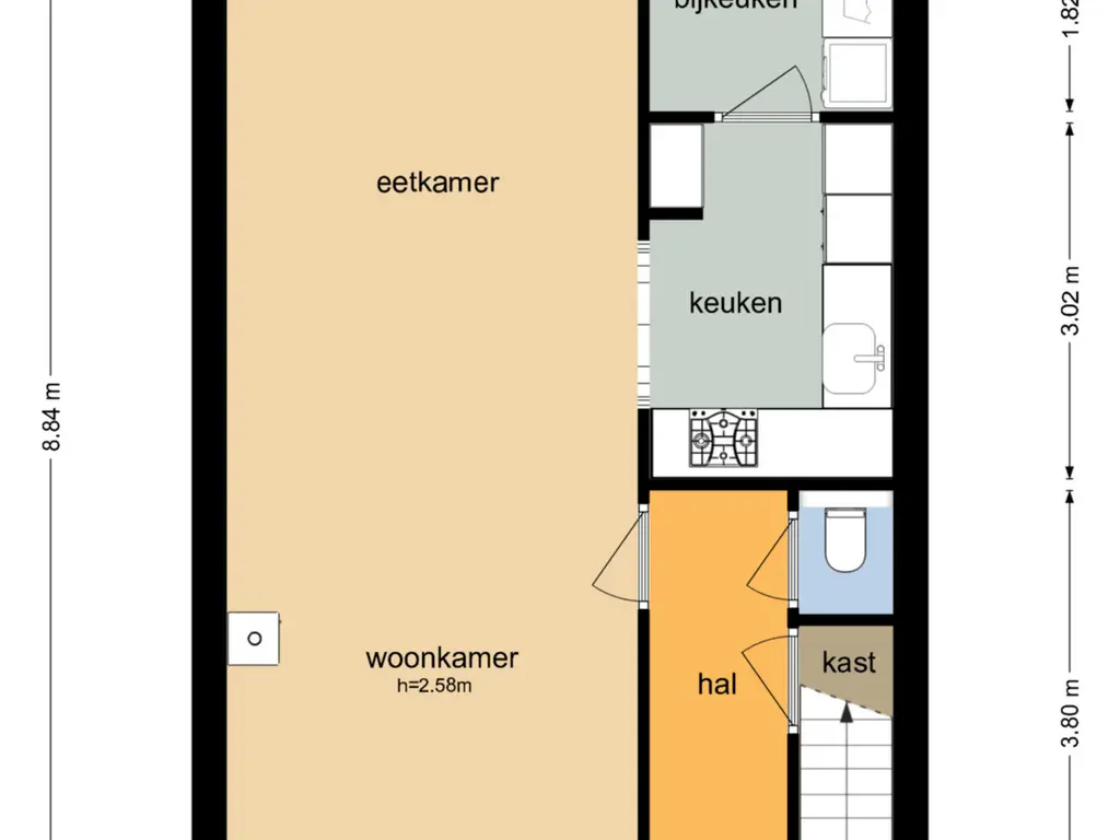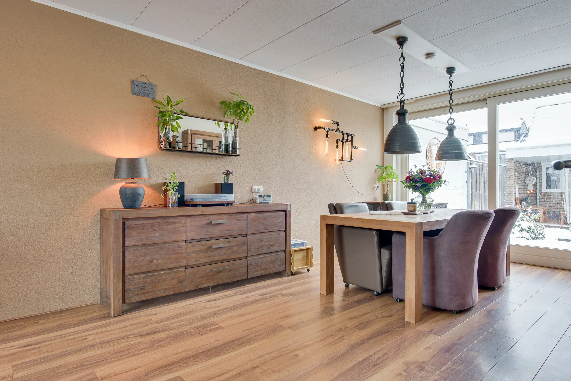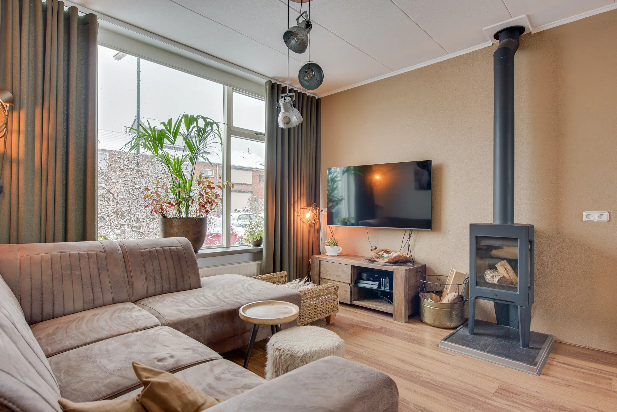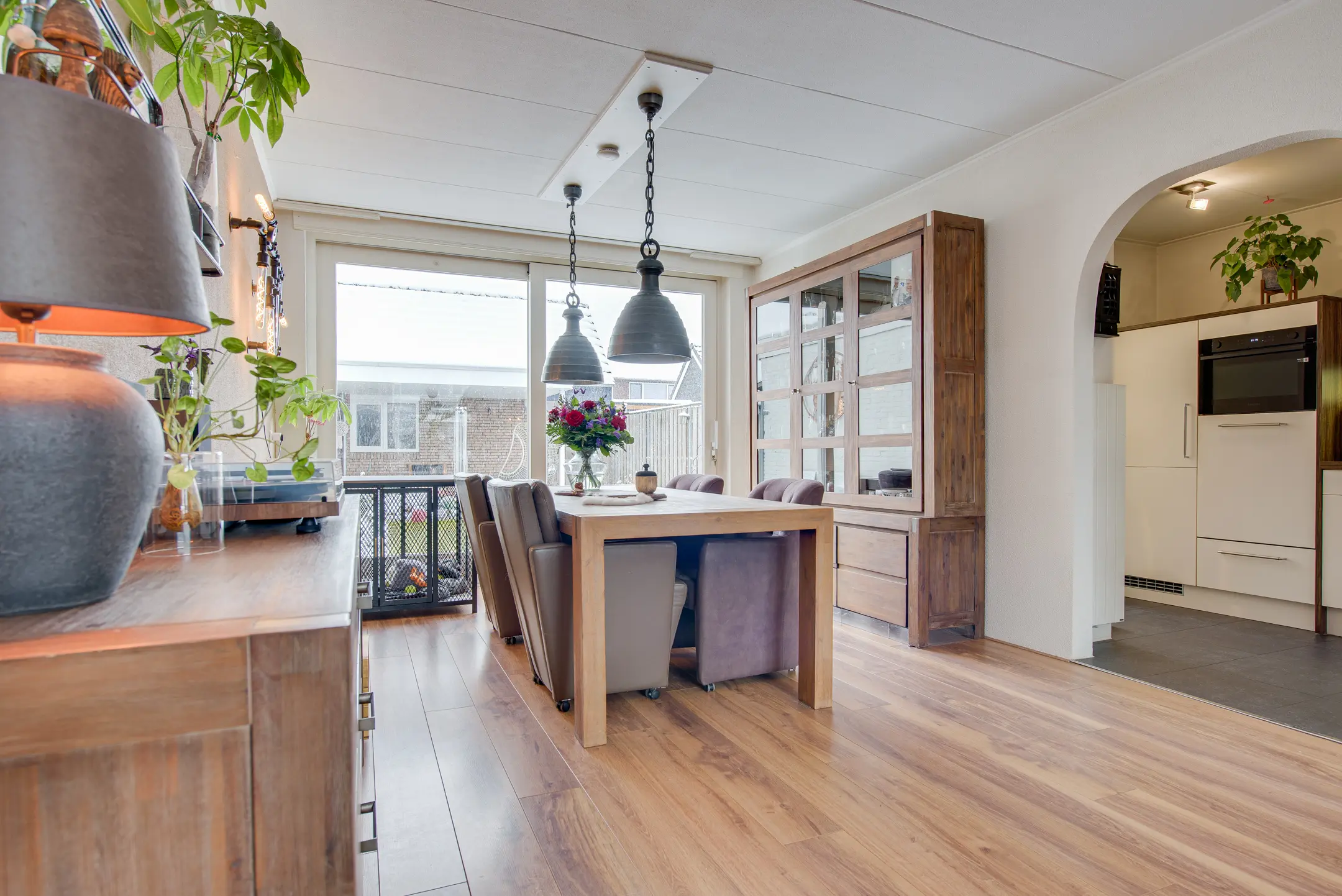 De lichte woonkamer is ruim opgezet en verdeeld in een gezellig zitgedeelte aan de voorzijde en een eetgedeelte aan de achterzijde. De houtkachel zorgt voor extra sfeer en warmte. Via de schuifpui loop je zo de achtertuin in – perfect voor binnen-buitenleven.