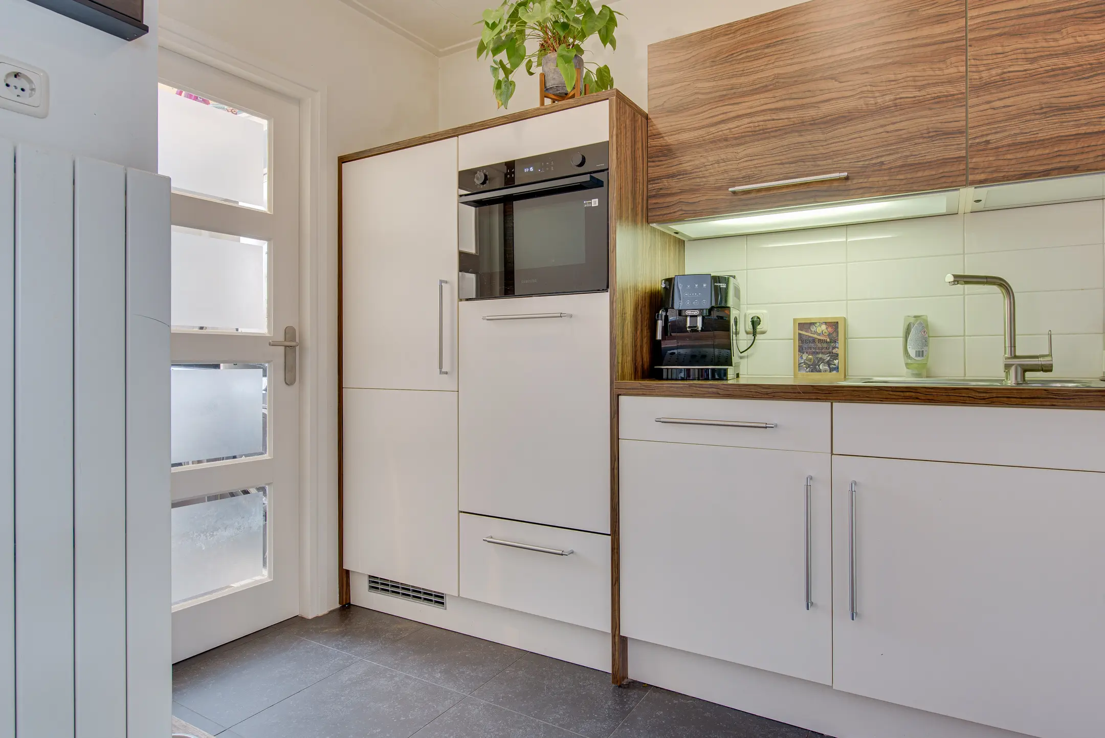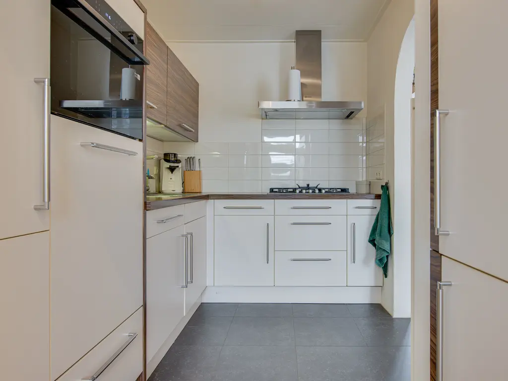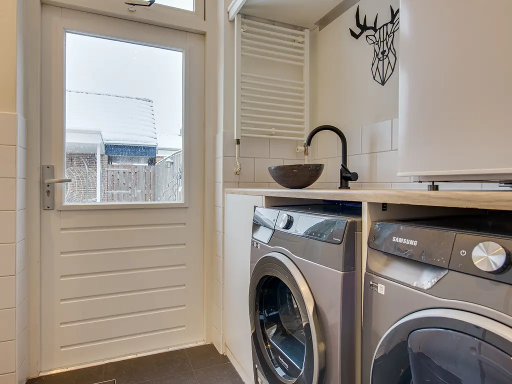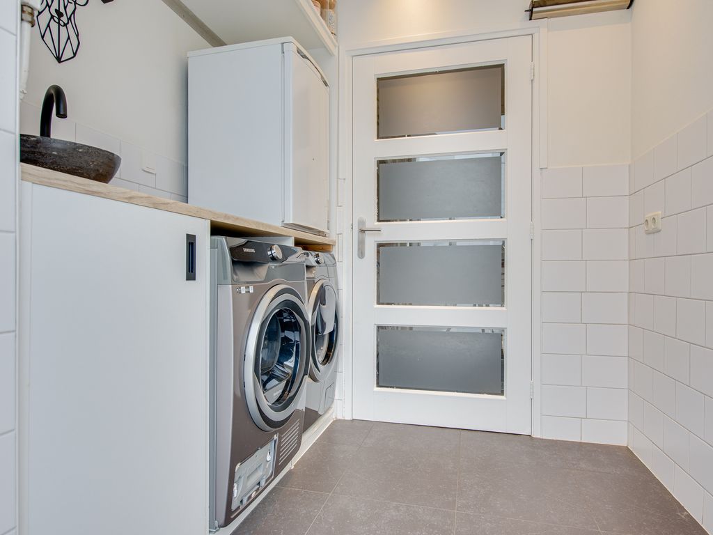 De moderne keuken is uitgevoerd in lichte kleurstellingen en van alle gemakken voorzien, waaronder een koelkast, vaatwasser (2025), combi-oven (2025), 5-pits gasstel, afzuigkap en een praktische magic corner. Aansluitend bevindt zich de bijkeuken met witgoedaansluitingen, extra werkblad en wastafel. Ook vanuit hier is de tuin bereikbaar.