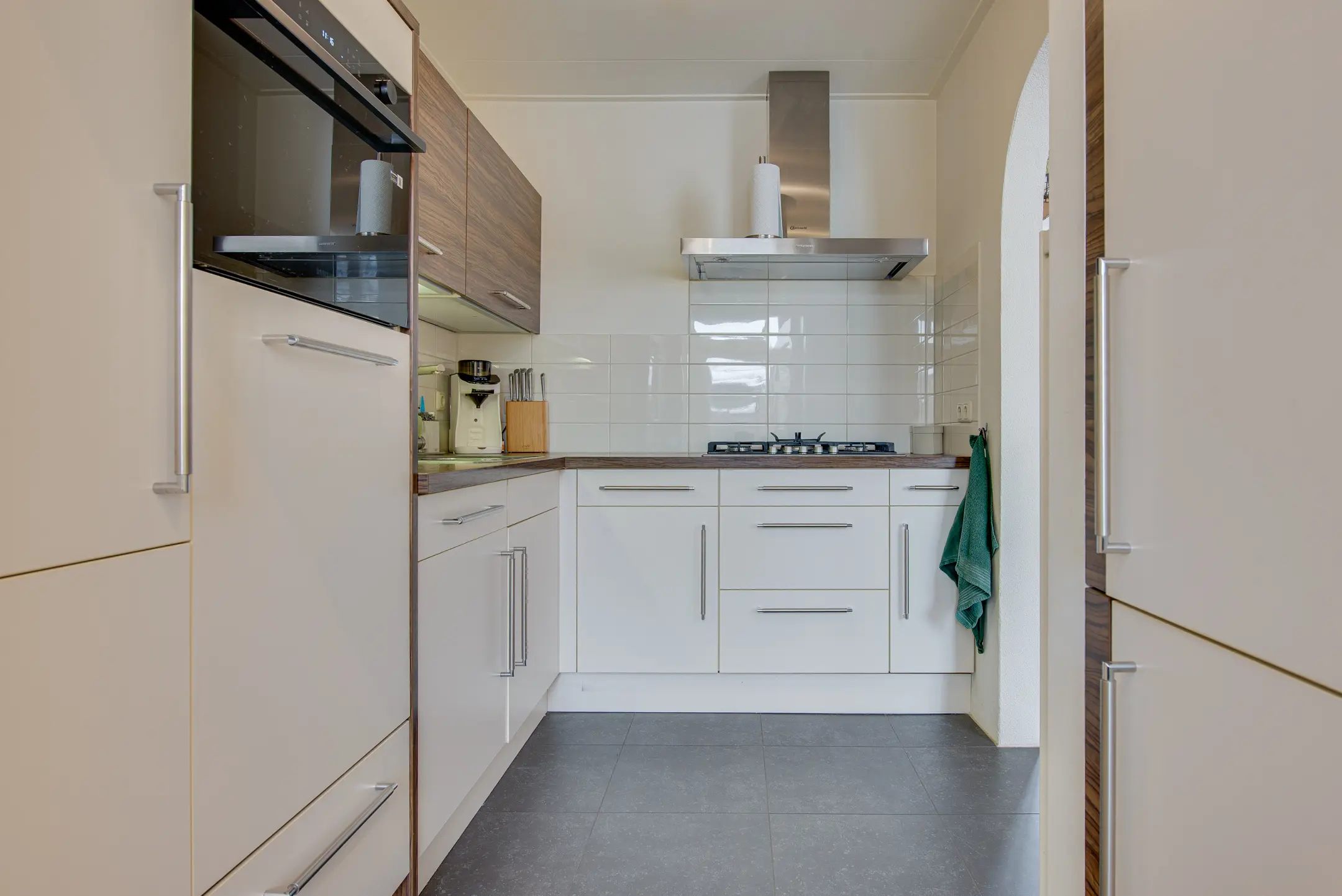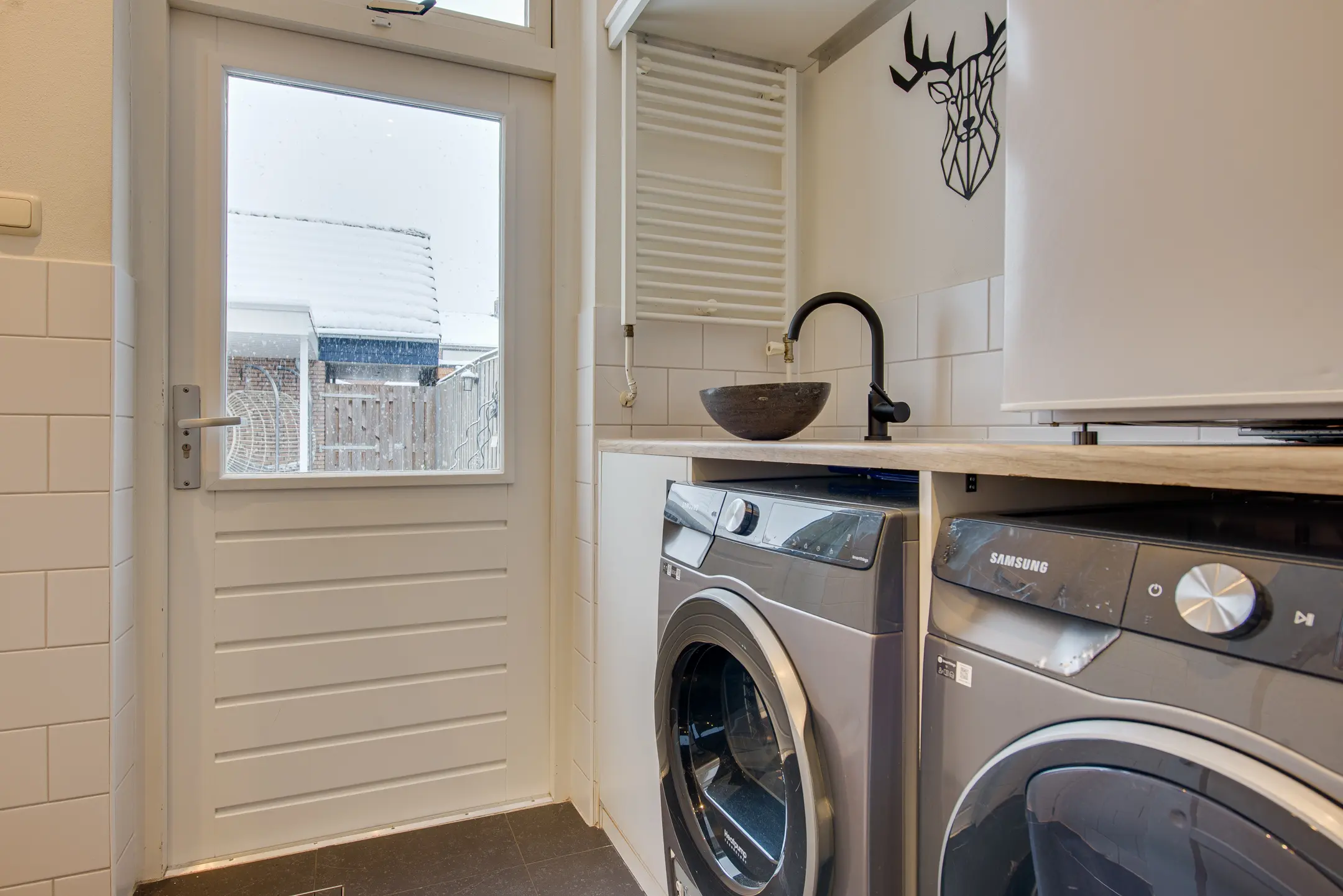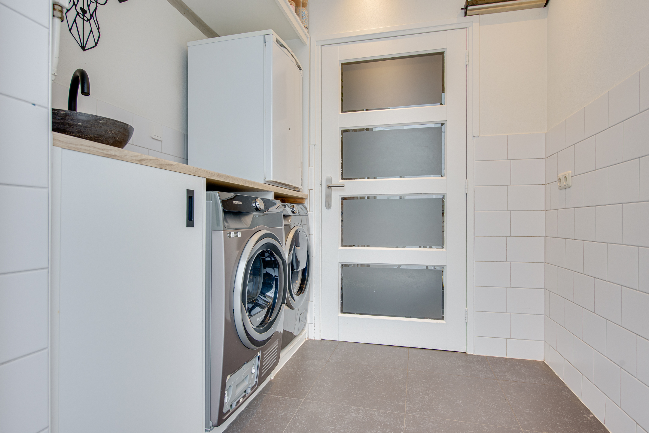 De moderne keuken is uitgevoerd in lichte kleurstellingen en van alle gemakken voorzien, waaronder een koelkast, vaatwasser (2025), combi-oven (2025), 5-pits gasstel, afzuigkap en een praktische magic corner. Aansluitend bevindt zich de bijkeuken met witgoedaansluitingen, extra werkblad en wastafel. Ook vanuit hier is de tuin bereikbaar.