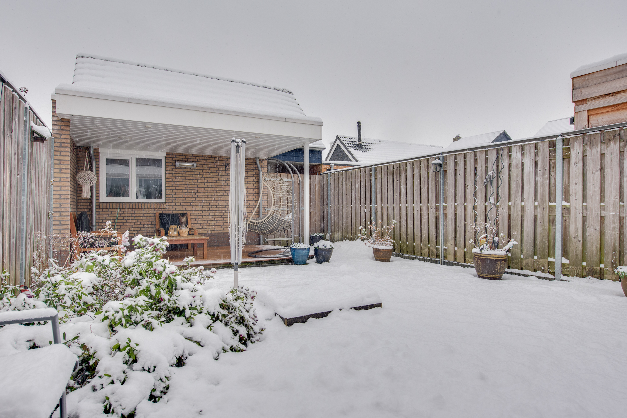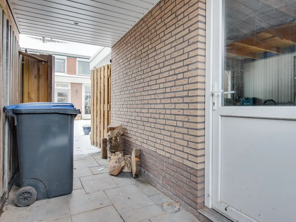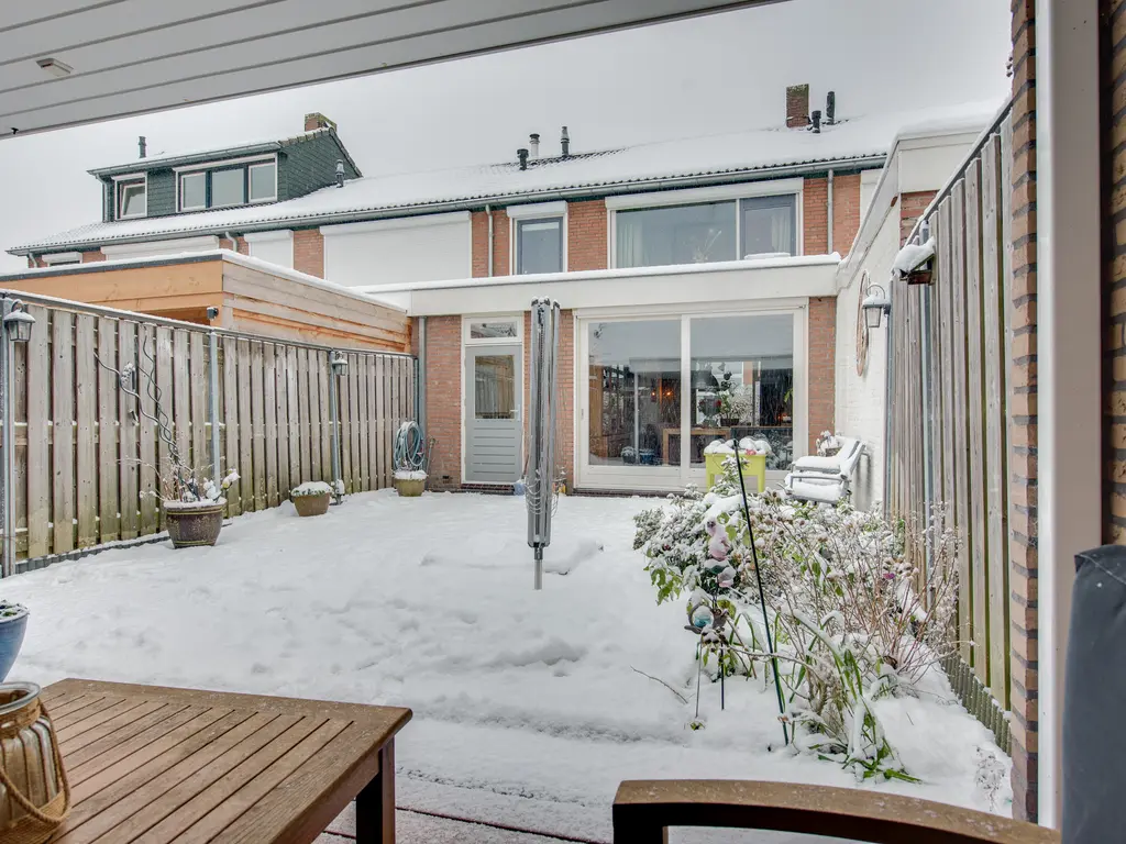 De verzorgde achtertuin ligt op het oosten en biedt volop privacy dankzij de houten erfafscheiding. Onder de overkapping zit je ook op minder zonnige dagen heerlijk buiten. De ruime schuur is voorzien van elektra én een vliering, waardoor je hier verrassend veel bergruimte hebt.