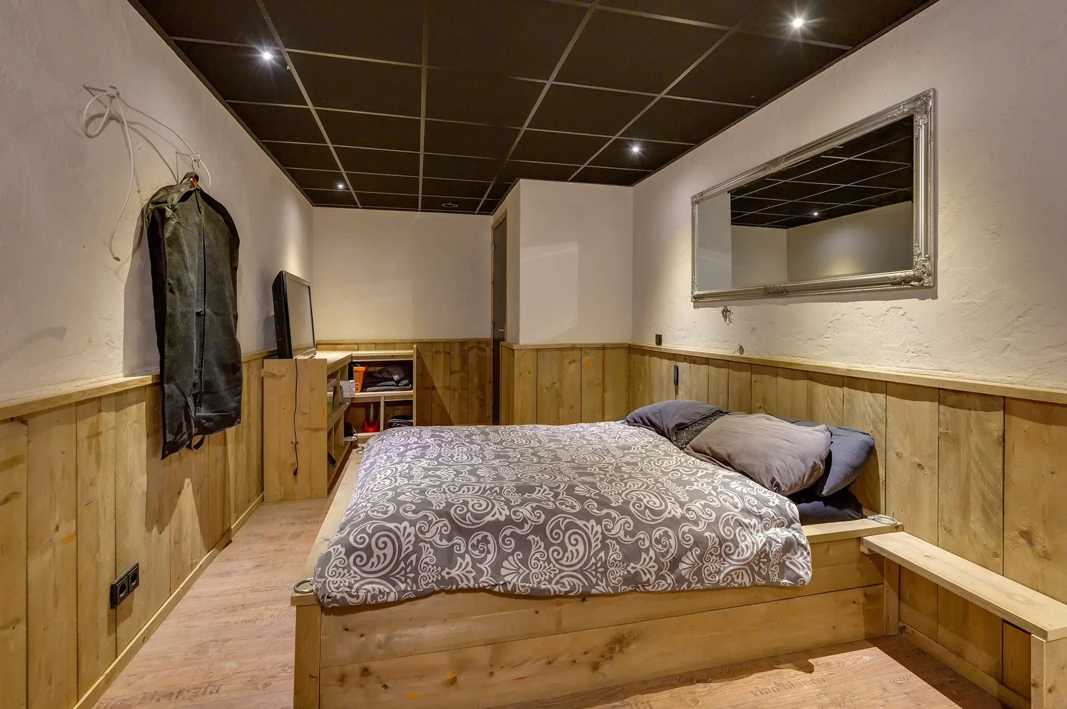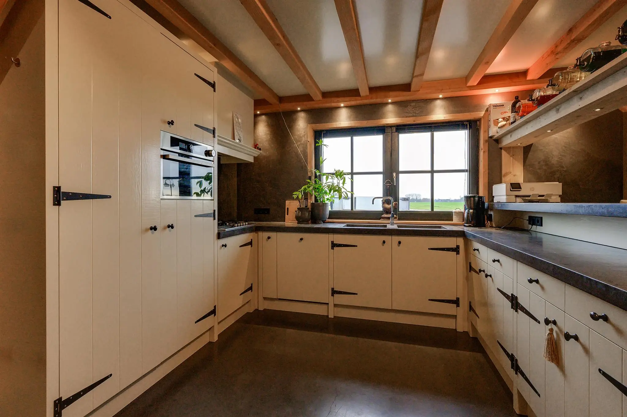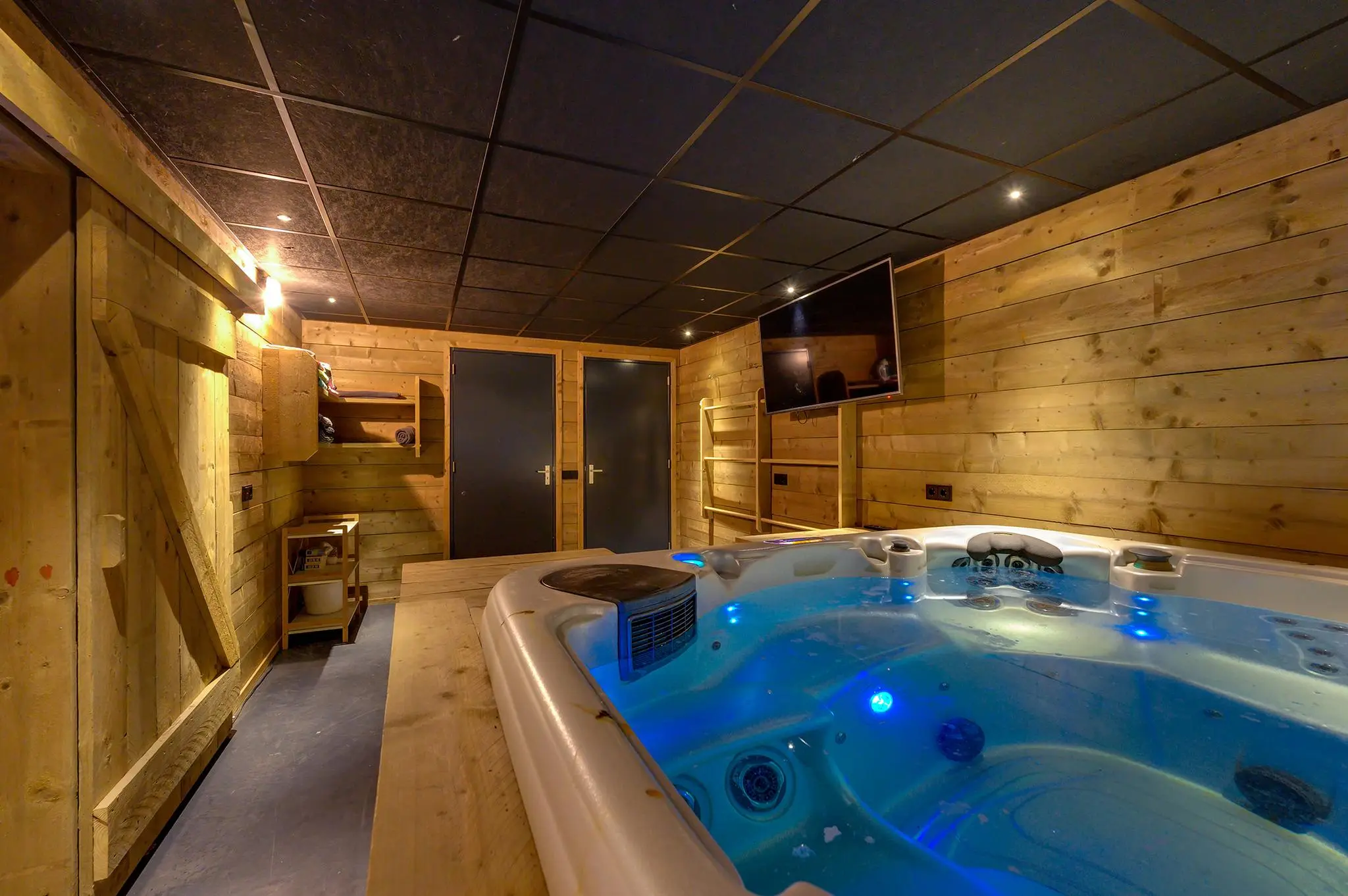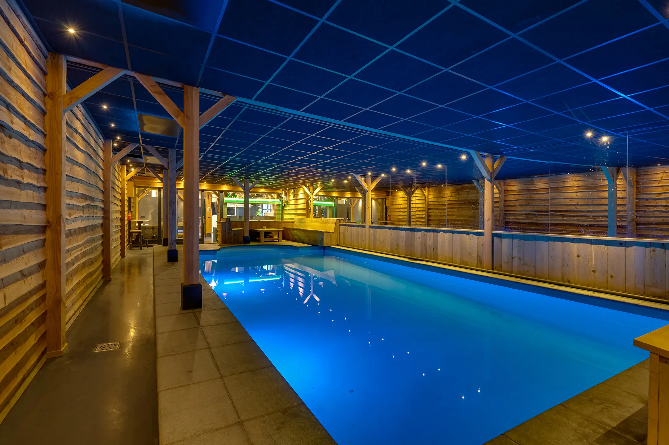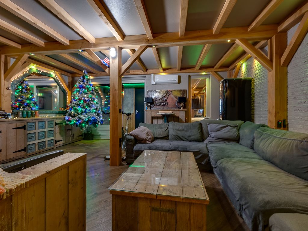 Eigen entree/hal met giet betonvloer en systeemplafond. Wasruimte met aansluitpunten wasapparatuur en unit vloerverwarming. Slaapkamer met betonvloer met vloerverwarming, systeemplafond, houten kozijnen met dubbel glas en airco unit. Slaapkamer 2 met giet betonvloer met vloerverwarming, systeemplafond en houten kozijnen met dubbel glas. Geheel betegelde badkamer met vloerverwarming, inloopdouche, hangend toilet, wastafelmeubel en houten kozijnen met dubbel glas. Woonkeuken met giet betonvloer met vloerverwarming en een U-vormig keukenblok met betonlook aanrechtblad met een 5-pits gaskookplaat, afzuigkap, combimagnetron, koel-/vriescombinatie, dubbele spoelbak en airco unit. Zwembad met loungeruimte. Jacuzzi ruimte met grote jacuzzi voor meerdere personen. Technische ruimte met de pomp van het zwembad, unit vloerverwarming en CV-combiketel. Geheel betegelde doucheruimte met inloopdouche. Multifunctionele ruimte 1 met laminaatvloer en designradiator. Multifunctionele ruimte 2 met laminaatvloer, designradiator en eigen toiletruimte met hangend toilet met fonteintje.