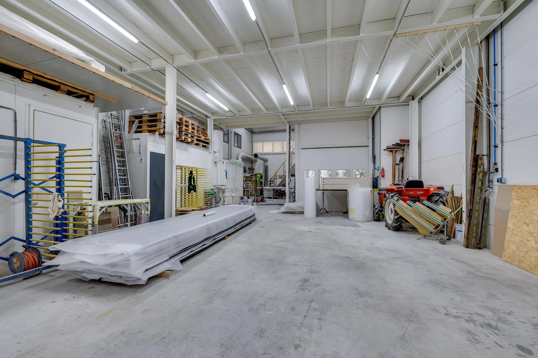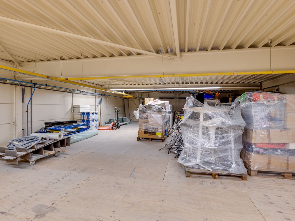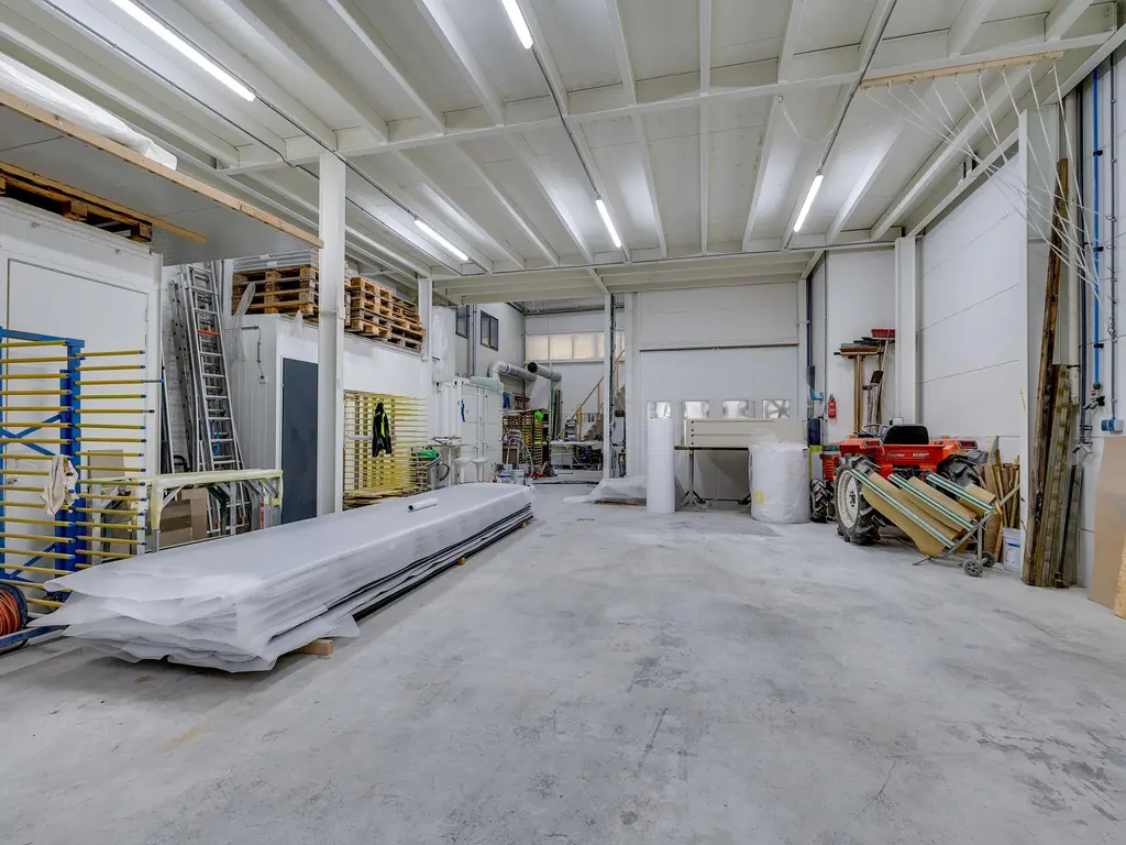 Begane grond: elektrisch bedienbare overheaddeur (ca. 4,3 meter hoog) met aparte loopdeur. Werkplaats met meterkast voor bedrijfshal en vloeistofdichte betonvloer. Werkkamer/multifunctionele ruimte met betonvloer, 3 designradiatoren, geheel betegelde toiletruimte met hangend toilet, geheel betegelde doucheruimte met inloopdouche en wasbak. Geheel betegelde doucheruimte 2 met inloopdouche en wasbak en bergruimte.
