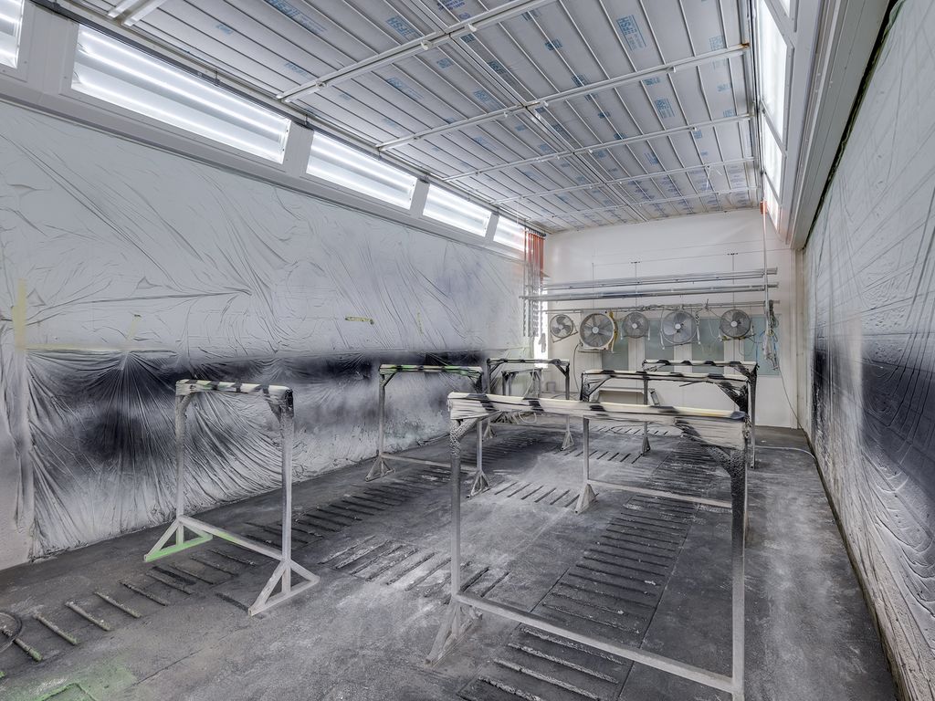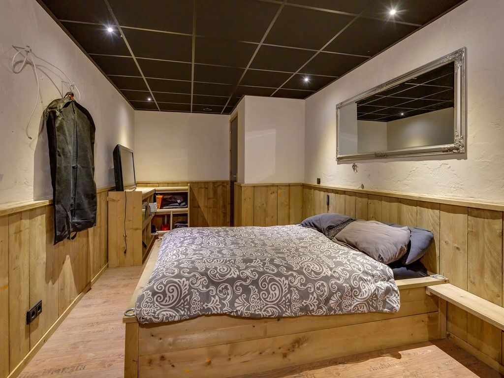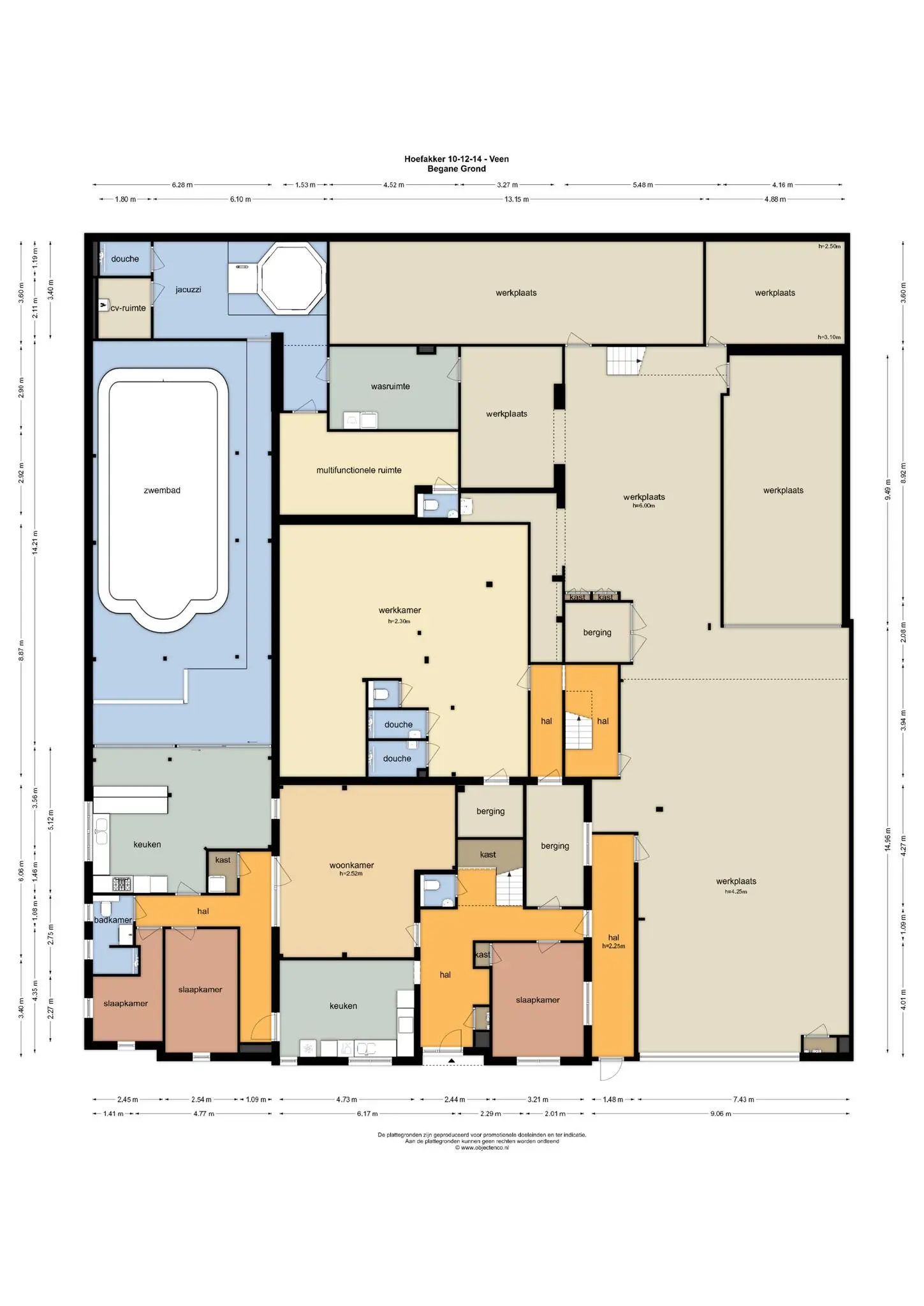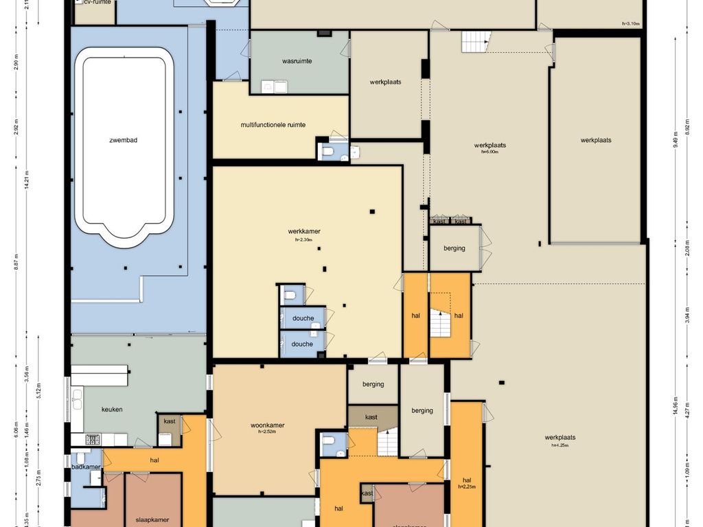Begane grond: elektrisch bedienbare overheaddeur (ca. 4,3 meter hoog) met aparte loopdeur. Werkplaats met meterkast voor bedrijfshal en vloeistofdichte betonvloer. Werkkamer/multifunctionele ruimte met betonvloer, 3 designradiatoren, geheel betegelde toiletruimte met hangend toilet, geheel betegelde doucheruimte met inloopdouche en wasbak. Geheel betegelde doucheruimte 2 met inloopdouche en wasbak en bergruimte.