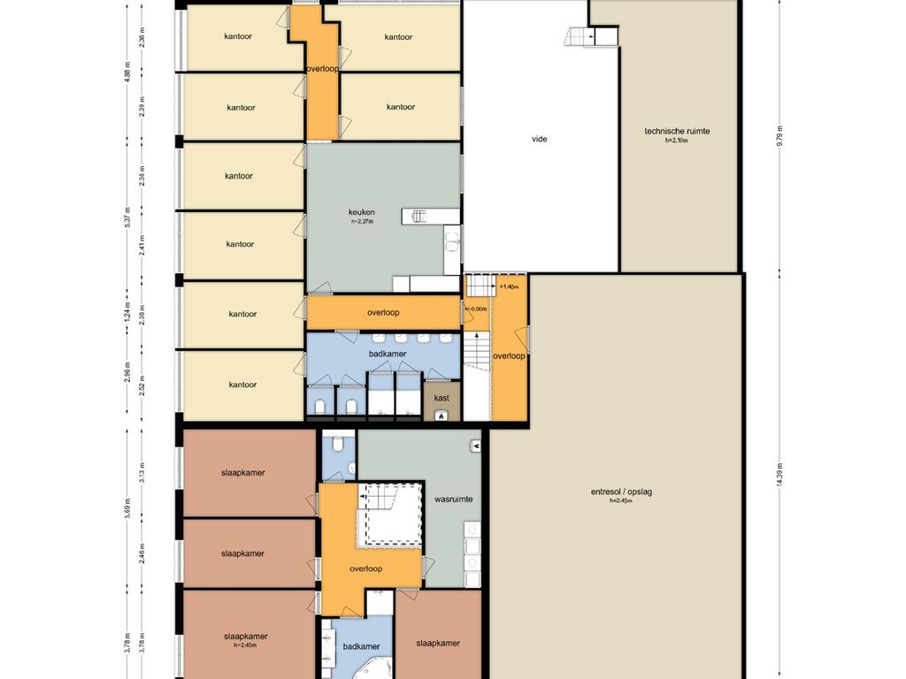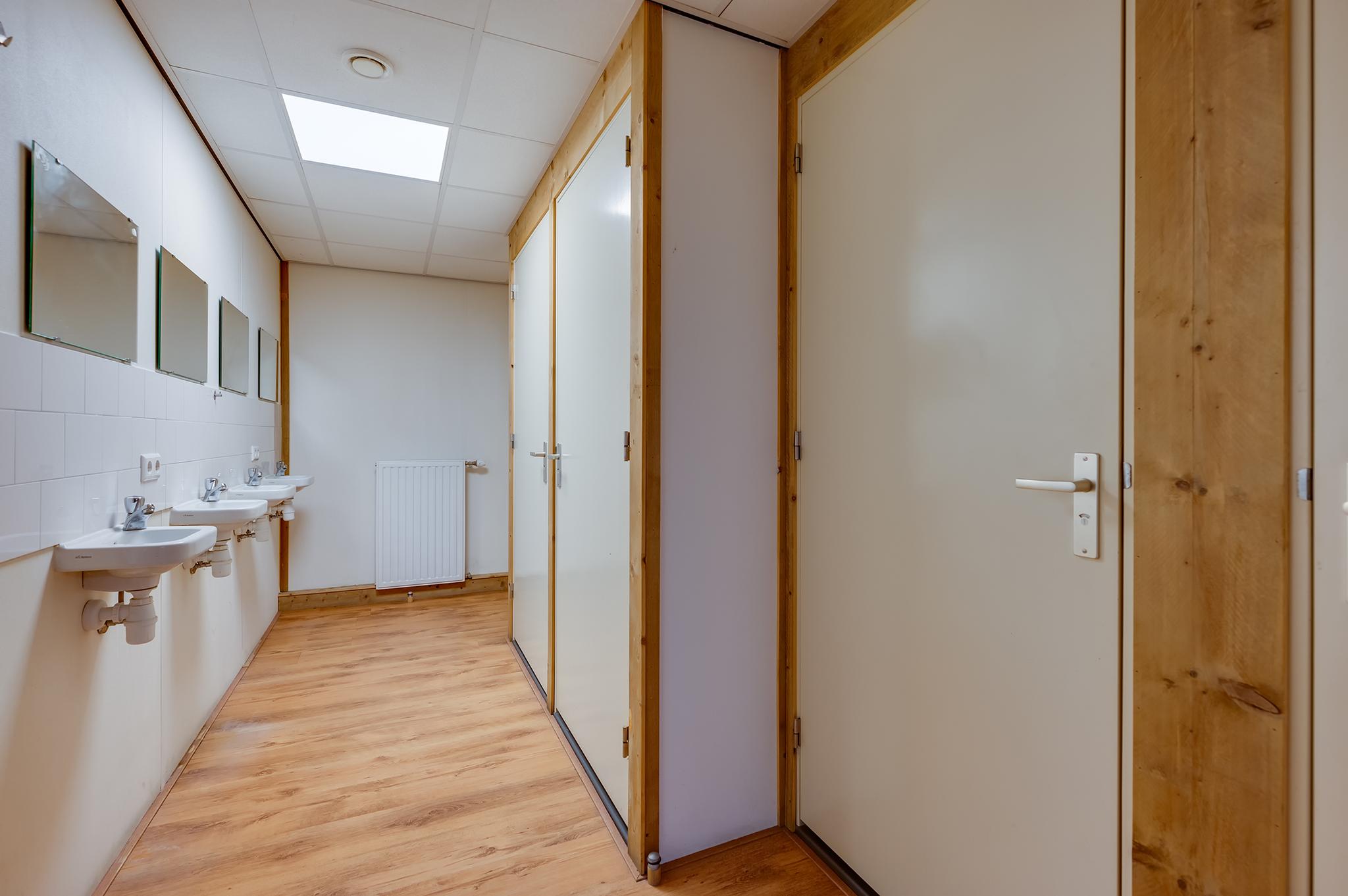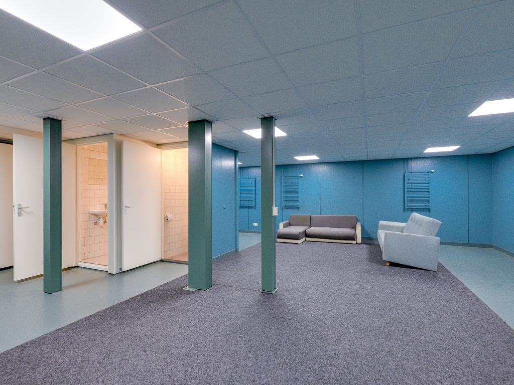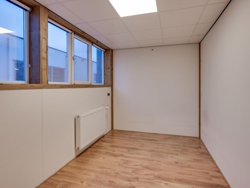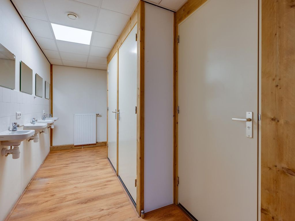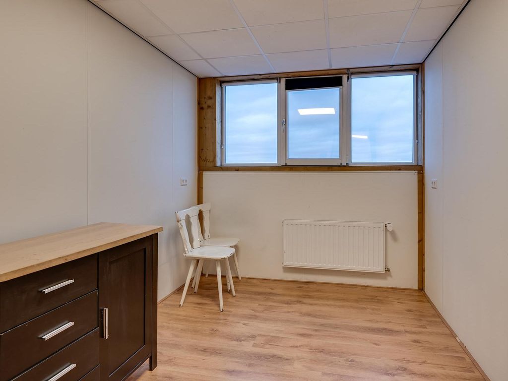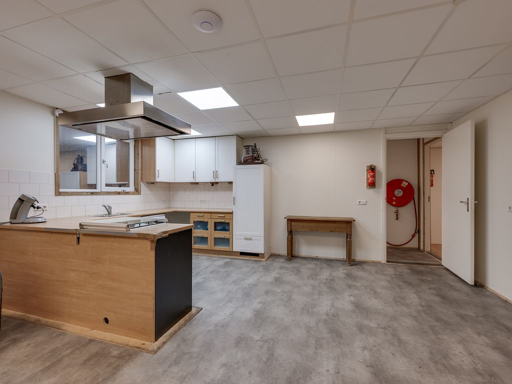 1e verdieping: overloop met zeil en toegang tot een ruime entresol. Wasruimte met laminaatvloer en 4 wasbakken. Opstelplaats CV-combiketel. Geheel betegelde doucheruimte 1 met douchecabine. Geheel betegelde doucheruimte 2 met douchecabine. Geheel betegelde toiletruimte 1 met hangend toilet. Geheel betegelde toiletruimte 2 met hangend toilet. Ruime kantine met zeil en een U-vormig keukenblok met 4-pits gaskookplaat, afzuigkap en koelkast. 8 kantoorruimten met laminaatvloer, systeemplafonds met inbouwarmaturen en radiatoren.