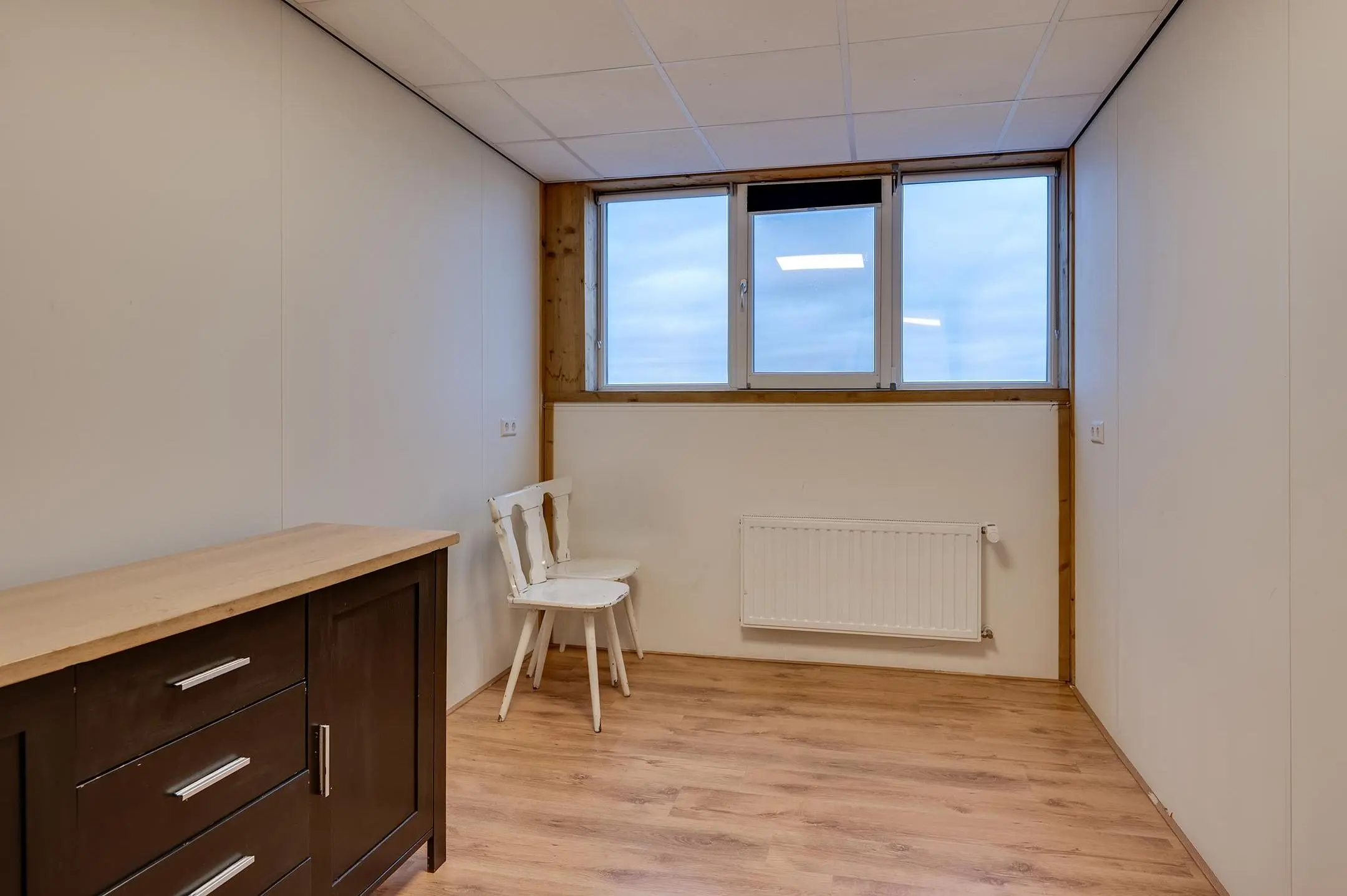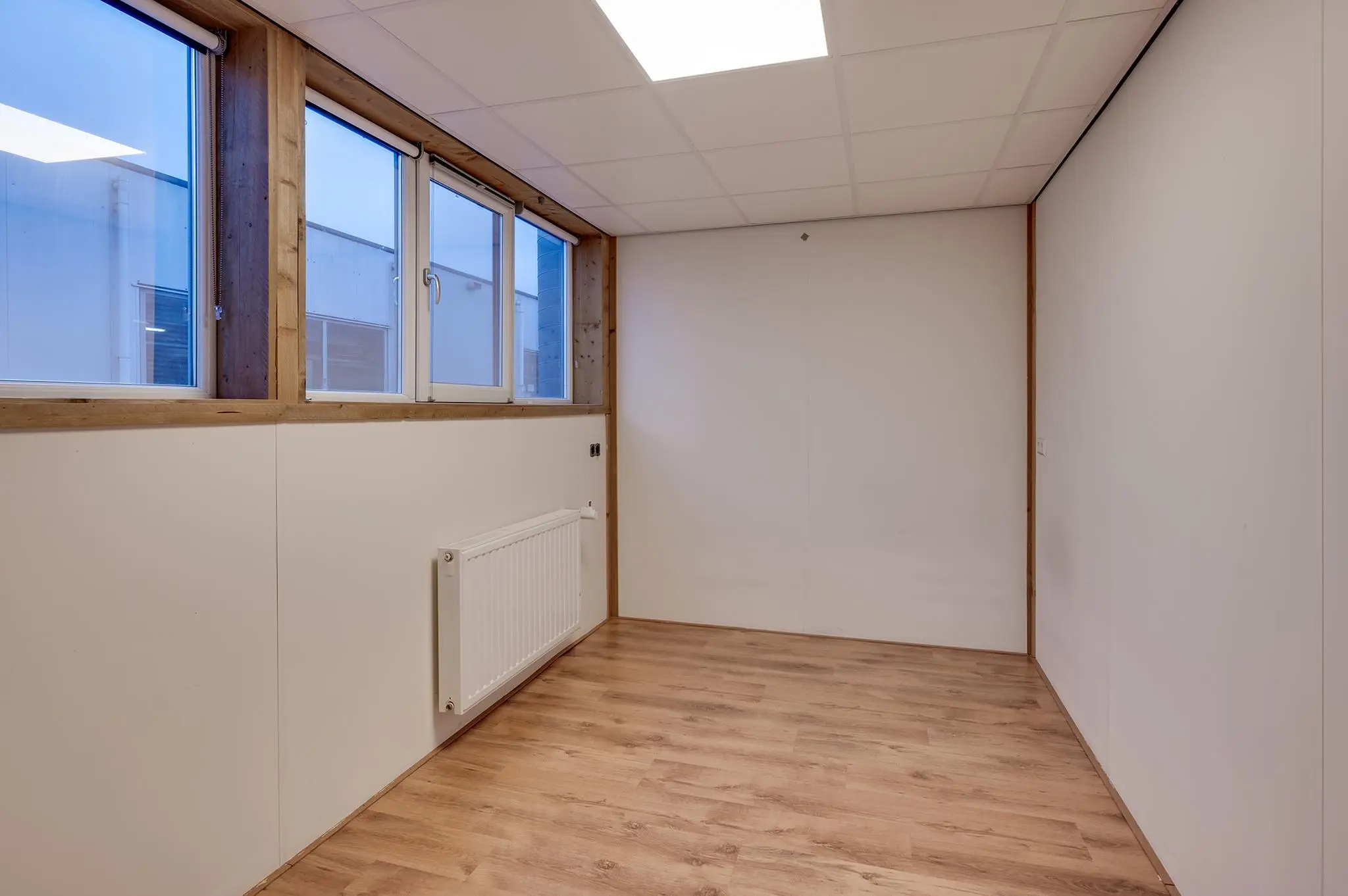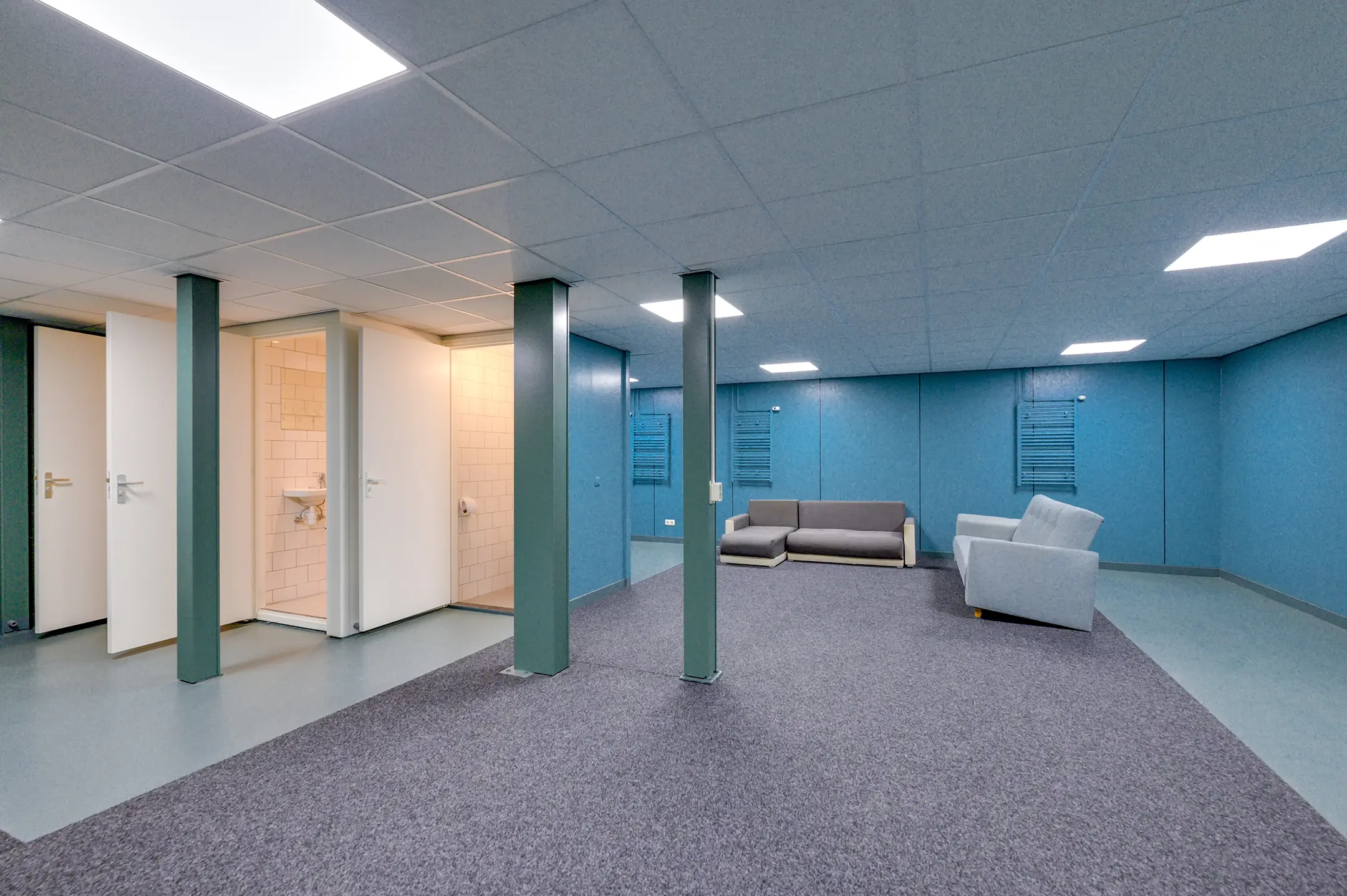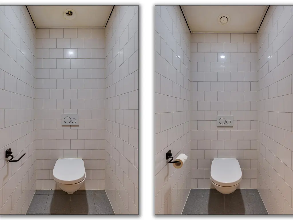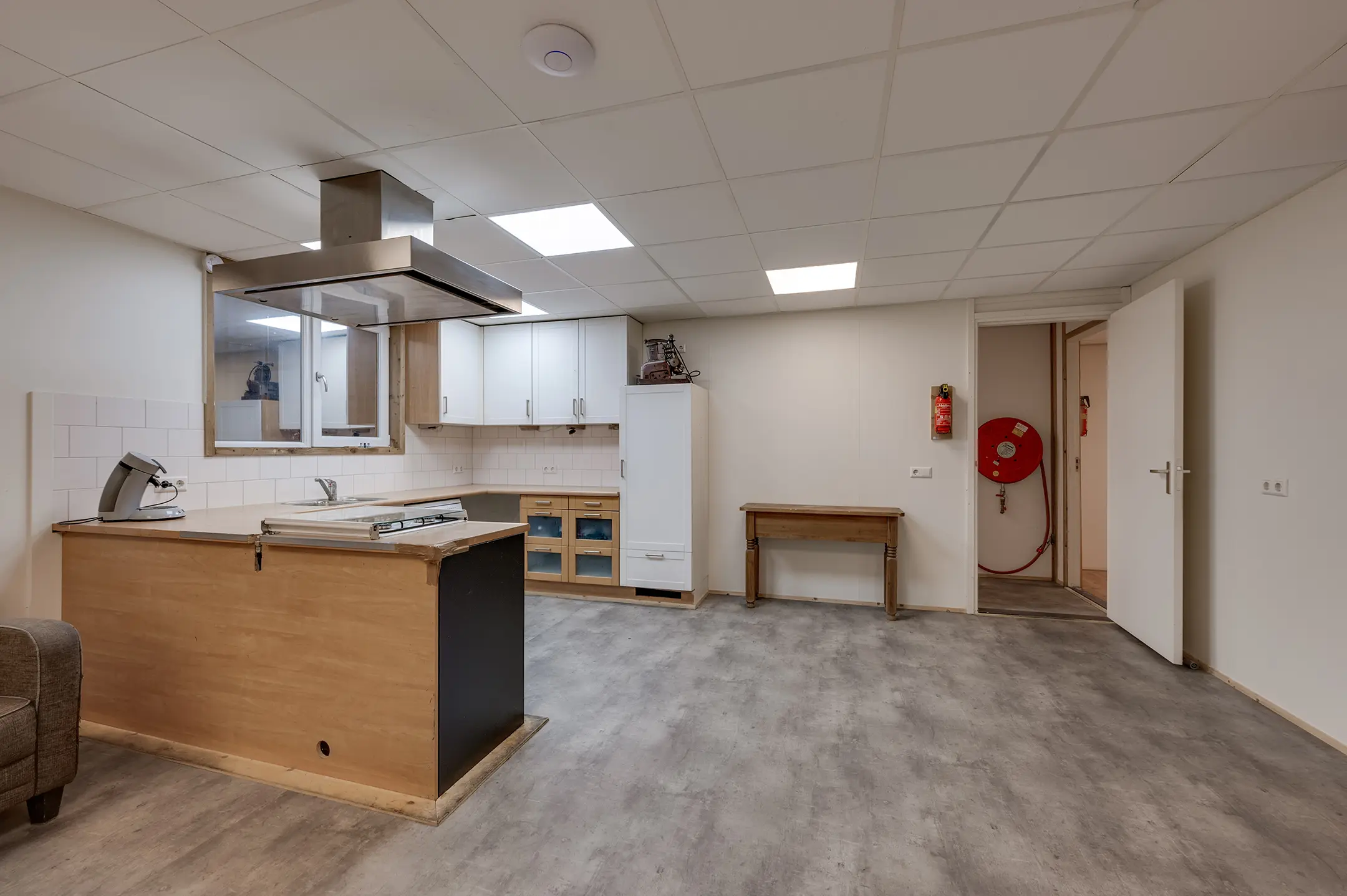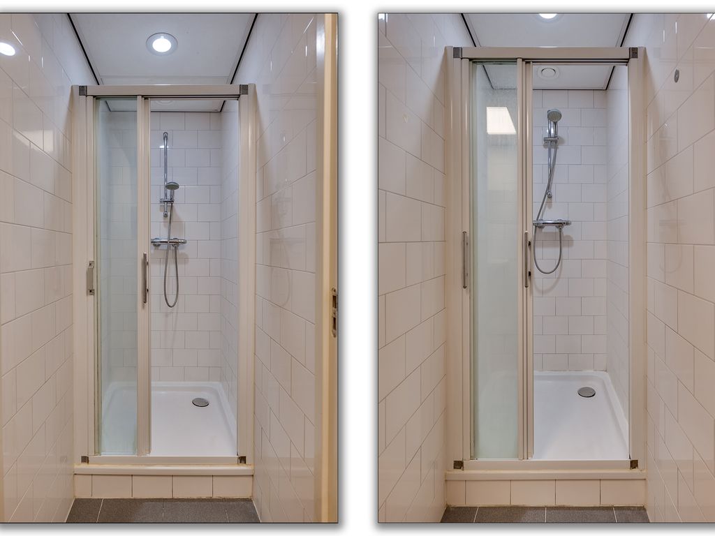 1e verdieping: overloop met zeil en toegang tot een ruime entresol. Wasruimte met laminaatvloer en 4 wasbakken. Opstelplaats CV-combiketel. Geheel betegelde doucheruimte 1 met douchecabine. Geheel betegelde doucheruimte 2 met douchecabine. Geheel betegelde toiletruimte 1 met hangend toilet. Geheel betegelde toiletruimte 2 met hangend toilet. Ruime kantine met zeil en een U-vormig keukenblok met 4-pits gaskookplaat, afzuigkap en koelkast. 8 kantoorruimten met laminaatvloer, systeemplafonds met inbouwarmaturen en radiatoren.