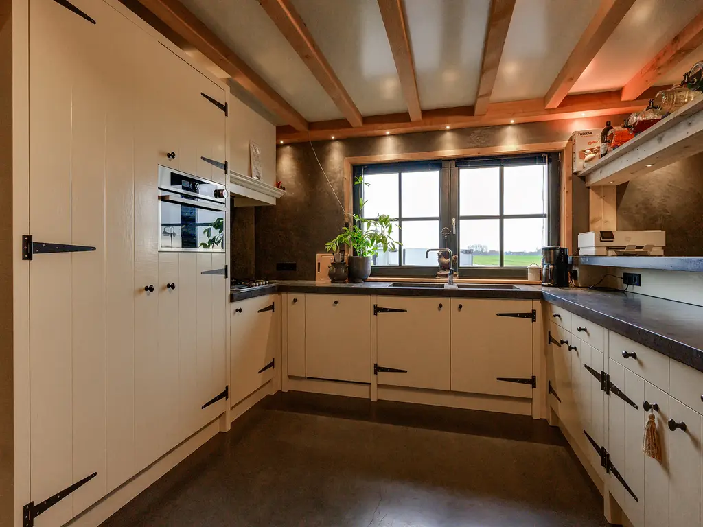 Begane grond: entree/hal met tegelvloer en schoonmetselwerk, meterkast (nieuwe groepenkast met 9 groepen, 3 aardlekschakelaars en krachtstroom), woonkeuken met tegelvloer en kunststof kozijnen met dubbel glas. De keuken is voorzien van een L-vormig keukenblok met keramische kookplaat, afzuigkap, combimagnetron en koelkast. Woonkamer met laminaatvloer, airco unit en balken plafond. Geheel betegelde toiletruimte met hangend toilet, slaapkamer begane grond met zeil, kunststof kozijnen met dubbel glas en vaste kast. Inpandige berging met tegelvloer.