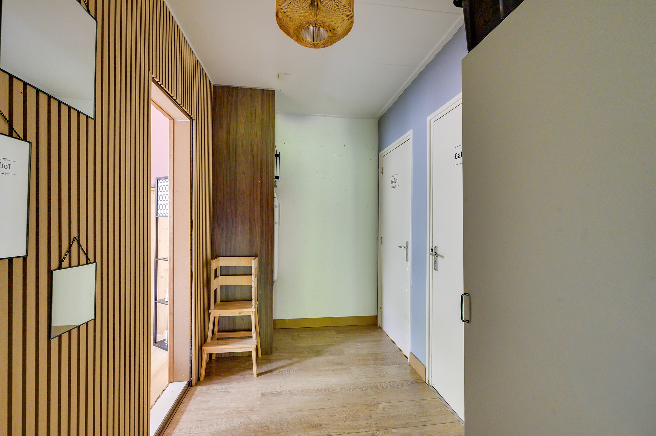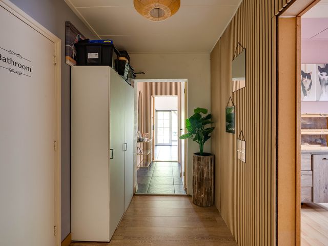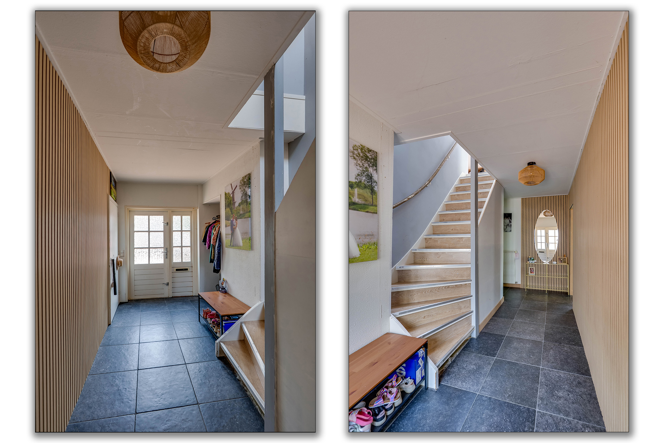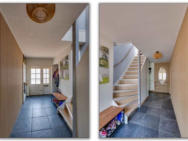 Je komt binnen via een groene, uitnodigende entree aan de straatzijde; meteen een mooie binnenkomer! In de ruime hal vind je de trap naar boven en heb je toegang tot de gezellige woonkamer en de tussenhal.
