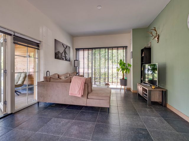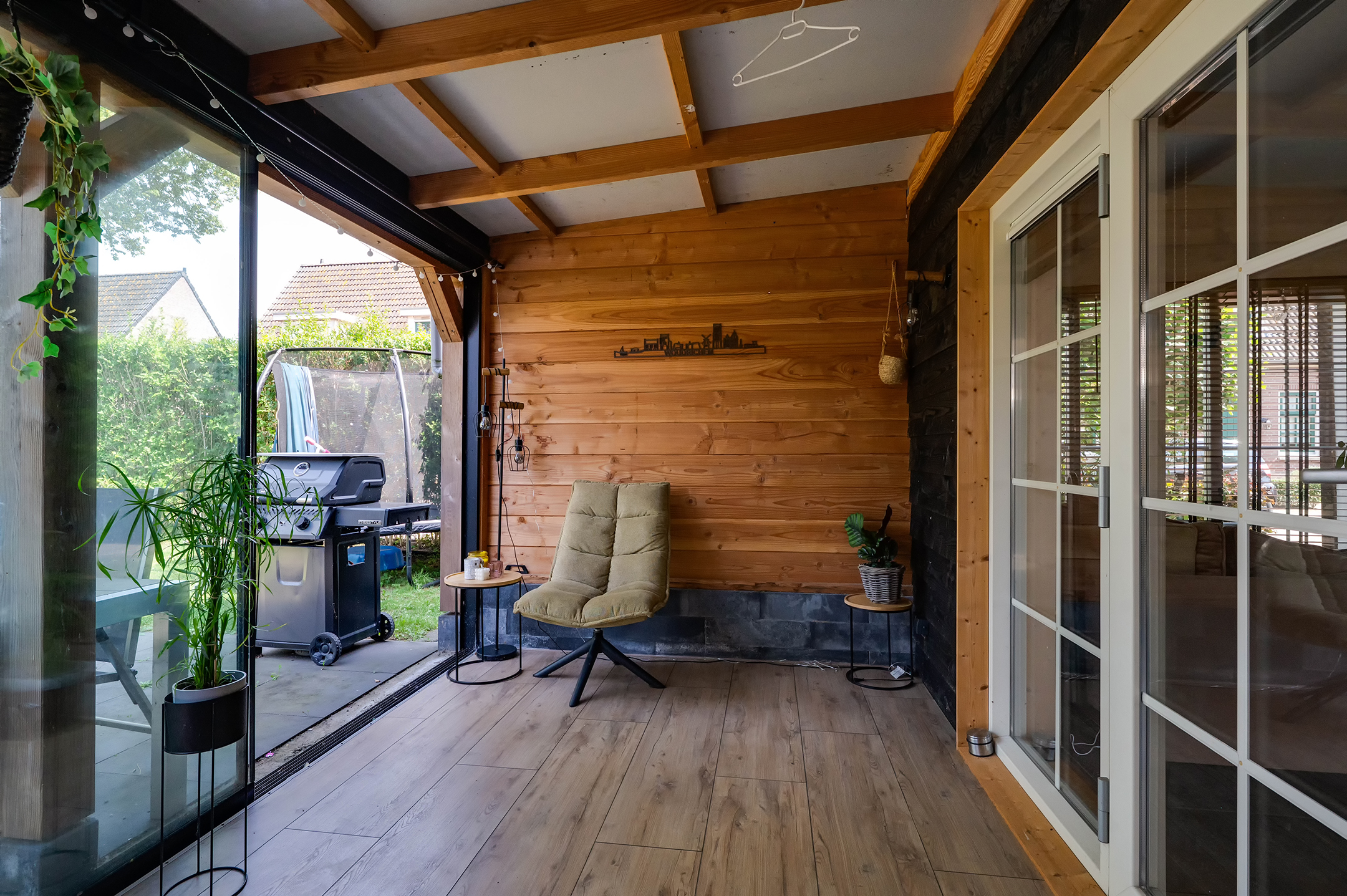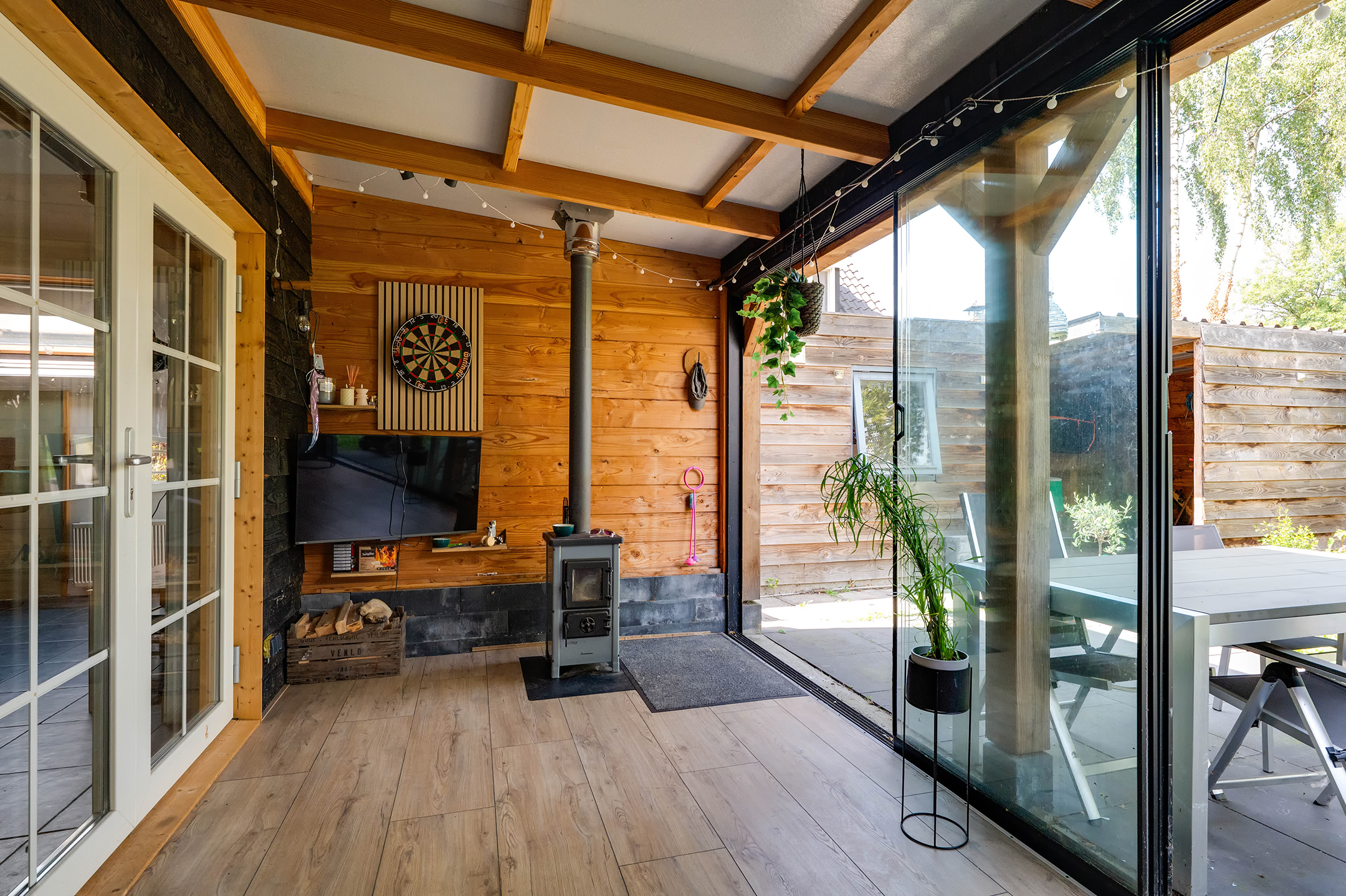 Via de openslaande deuren in de woonkamer stap je zo de sfeervolle veranda op. Deze is voorzien van een houten geïsoleerde vloer, is af te sluiten met een glazen schuifwand en is voorzien van een houtkachel zodat je hier zomer én winter heerlijk kunt zitten.