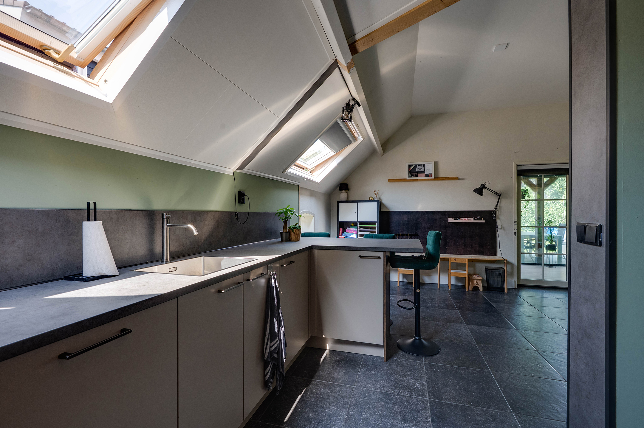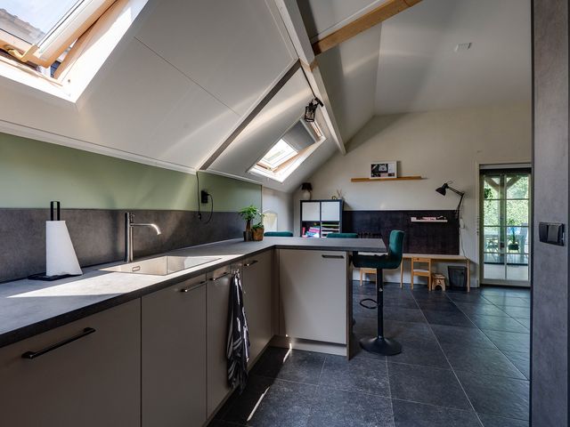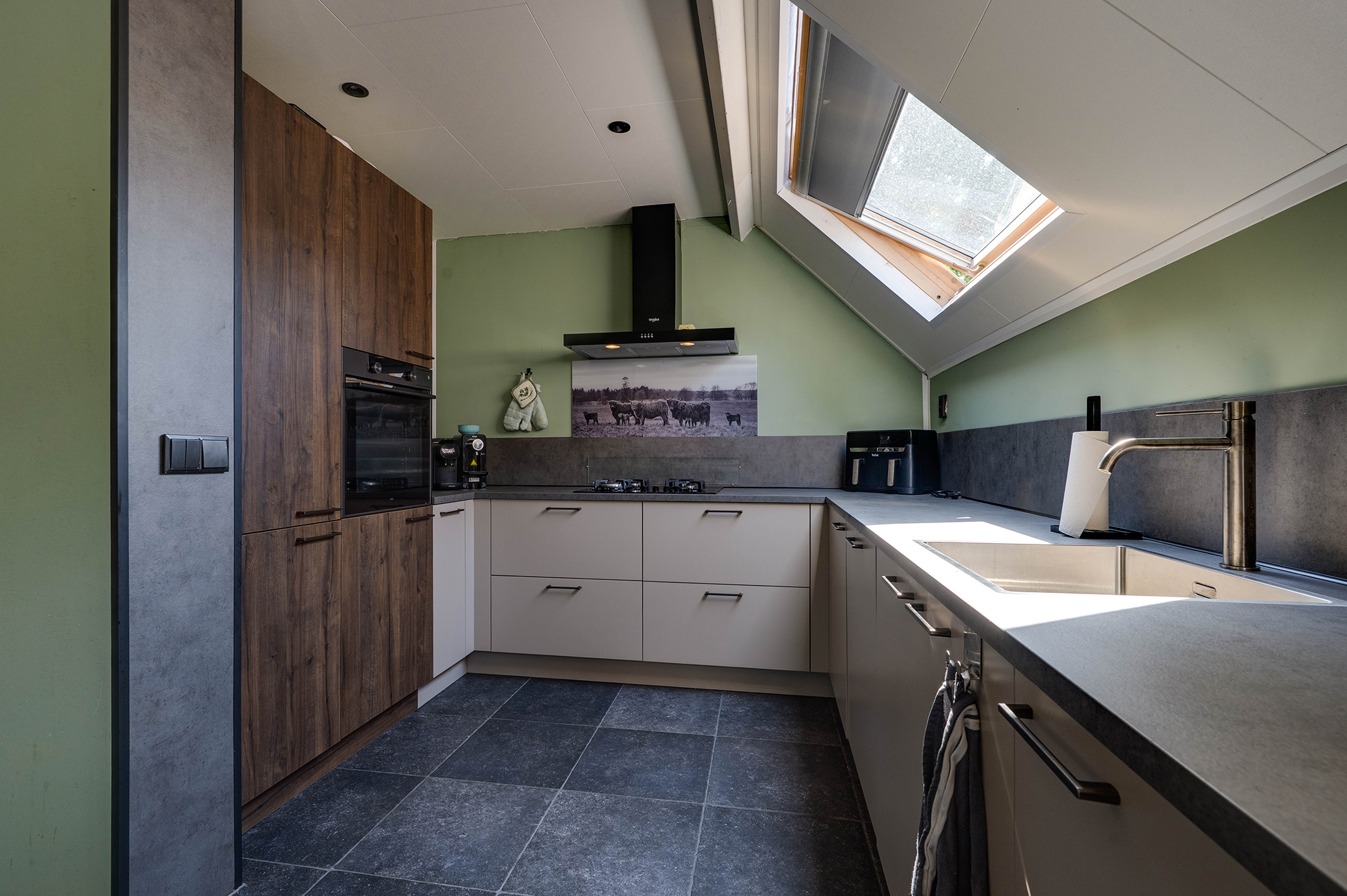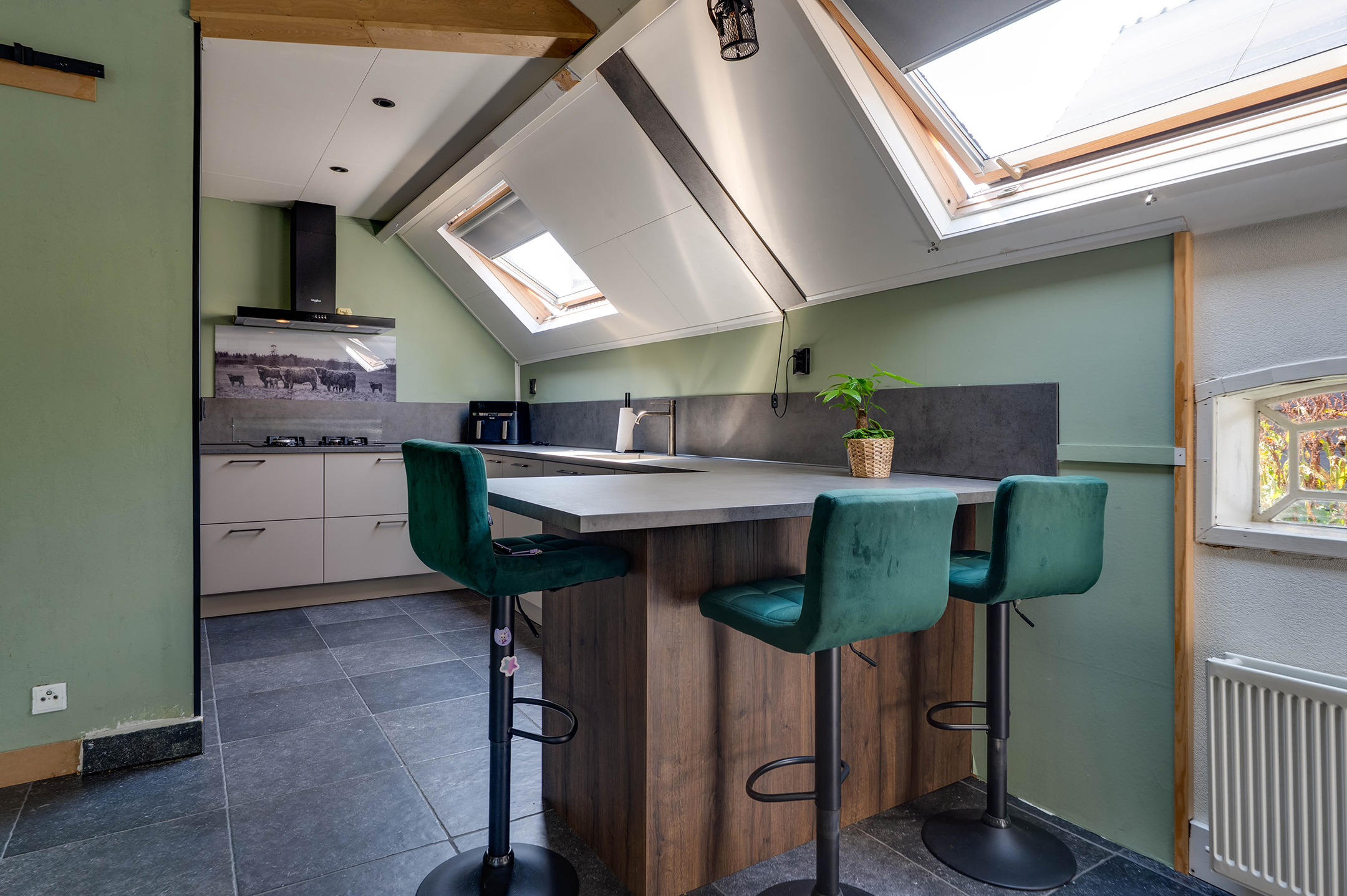 Aangrenzend ligt de open keuken (2023), uitgevoerd in een praktische G-vorm en voorzien van een gezellige bar. Door de schuine dakramen valt ook hier het daglicht rijkelijk binnen.