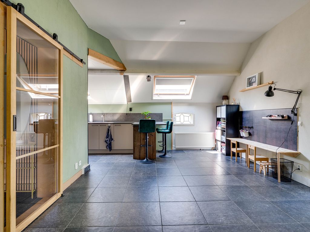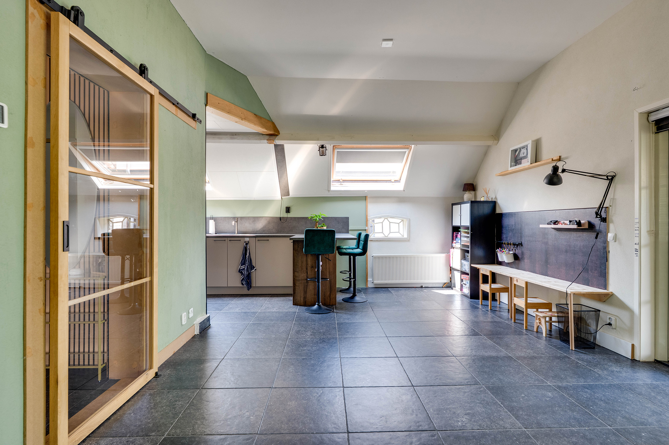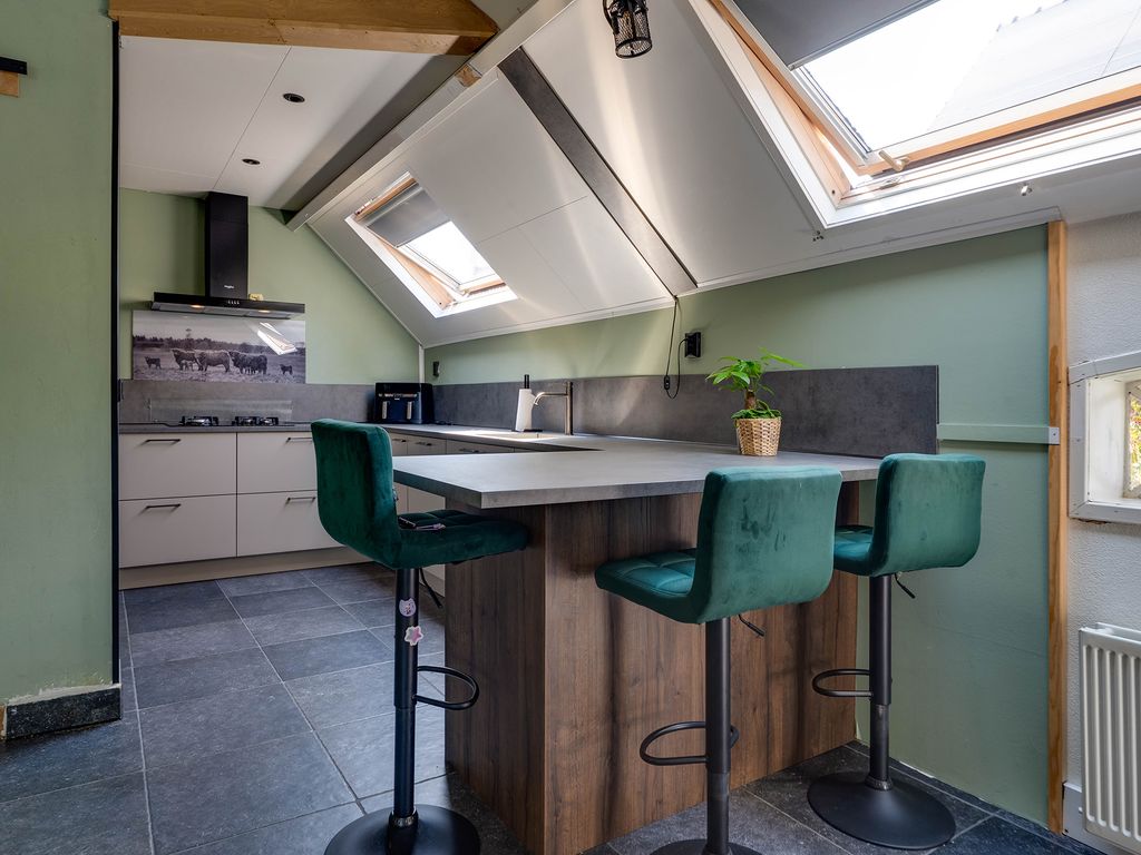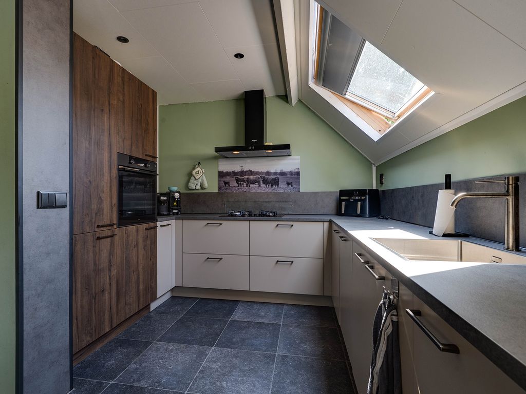 Aangrenzend ligt de open keuken (2023), uitgevoerd in een praktische G-vorm en voorzien van een gezellige bar. Door de schuine dakramen valt ook hier het daglicht rijkelijk binnen.
