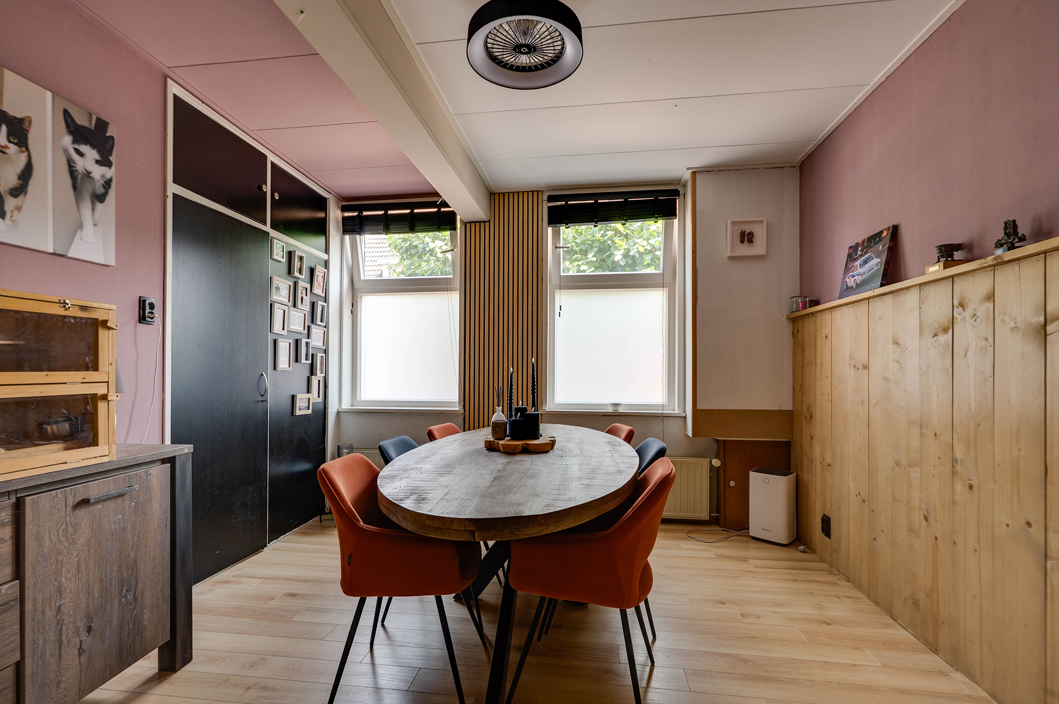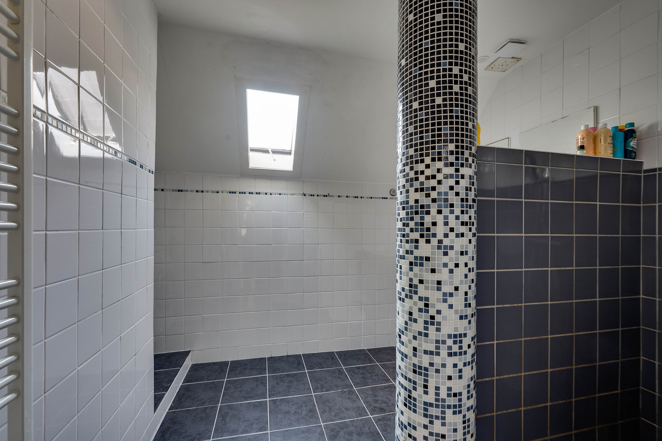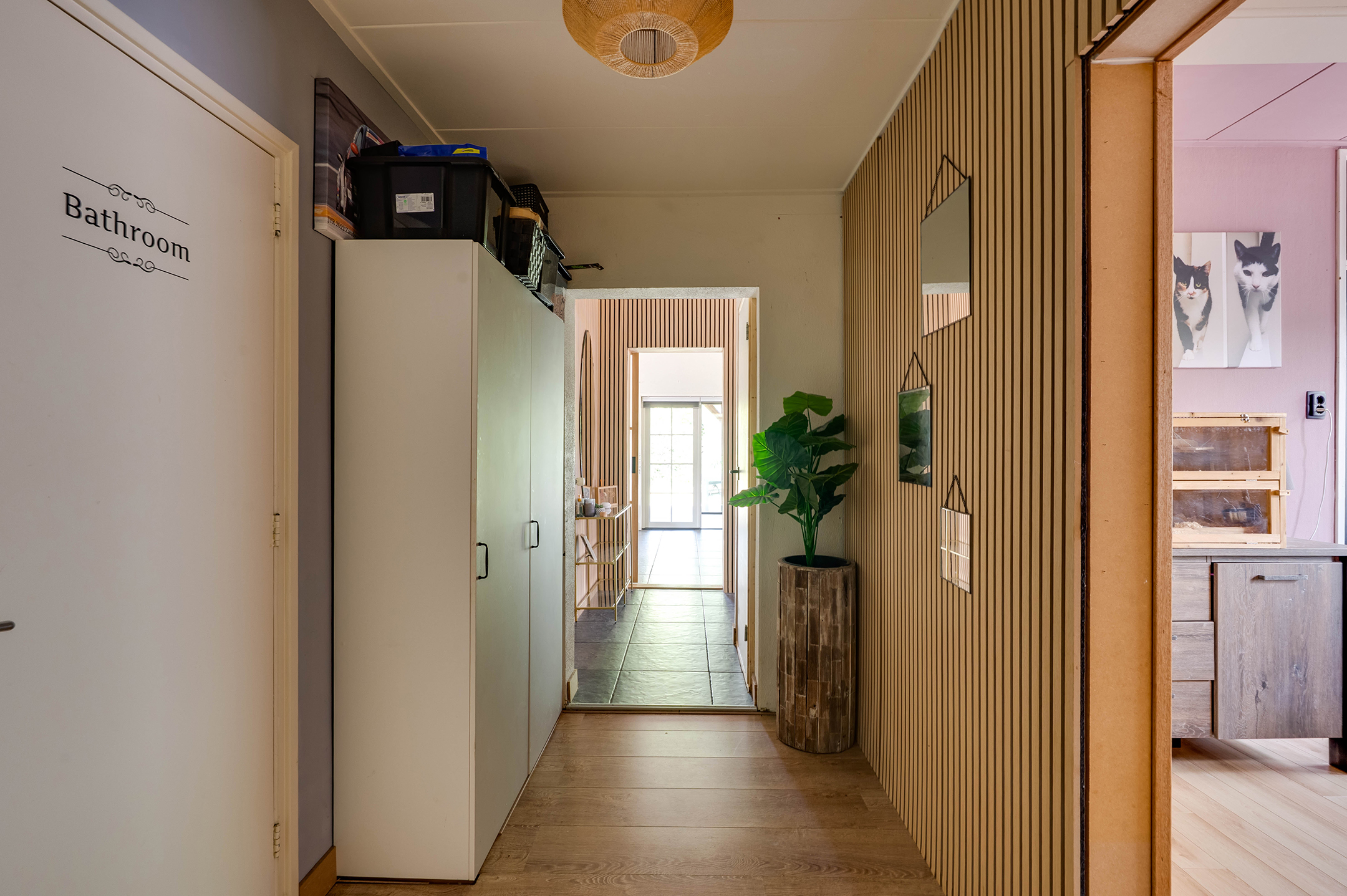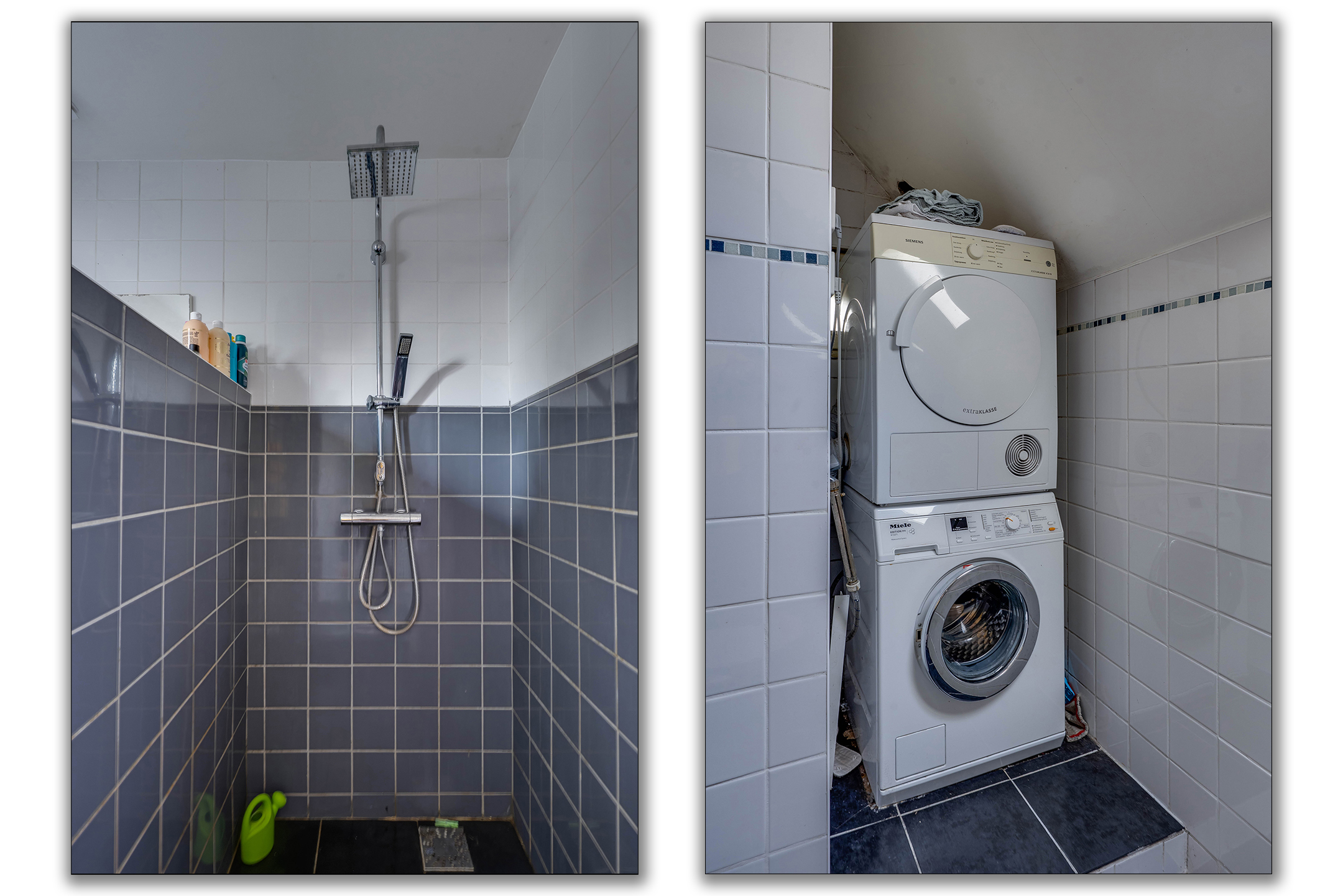 Via de tussenhal bereik je het toilet, de badkamer en de multifunctionele kamer op de begane grond. Deze ruimte wordt nu gebruikt als eetkamer, maar is net zo goed geschikt als slaapkamer, kantoor of speelkamer. De badkamer is uitgerust met twee wastafelmeubels, een douche, handdoekradiator én aansluitingen voor wasmachine en droger.