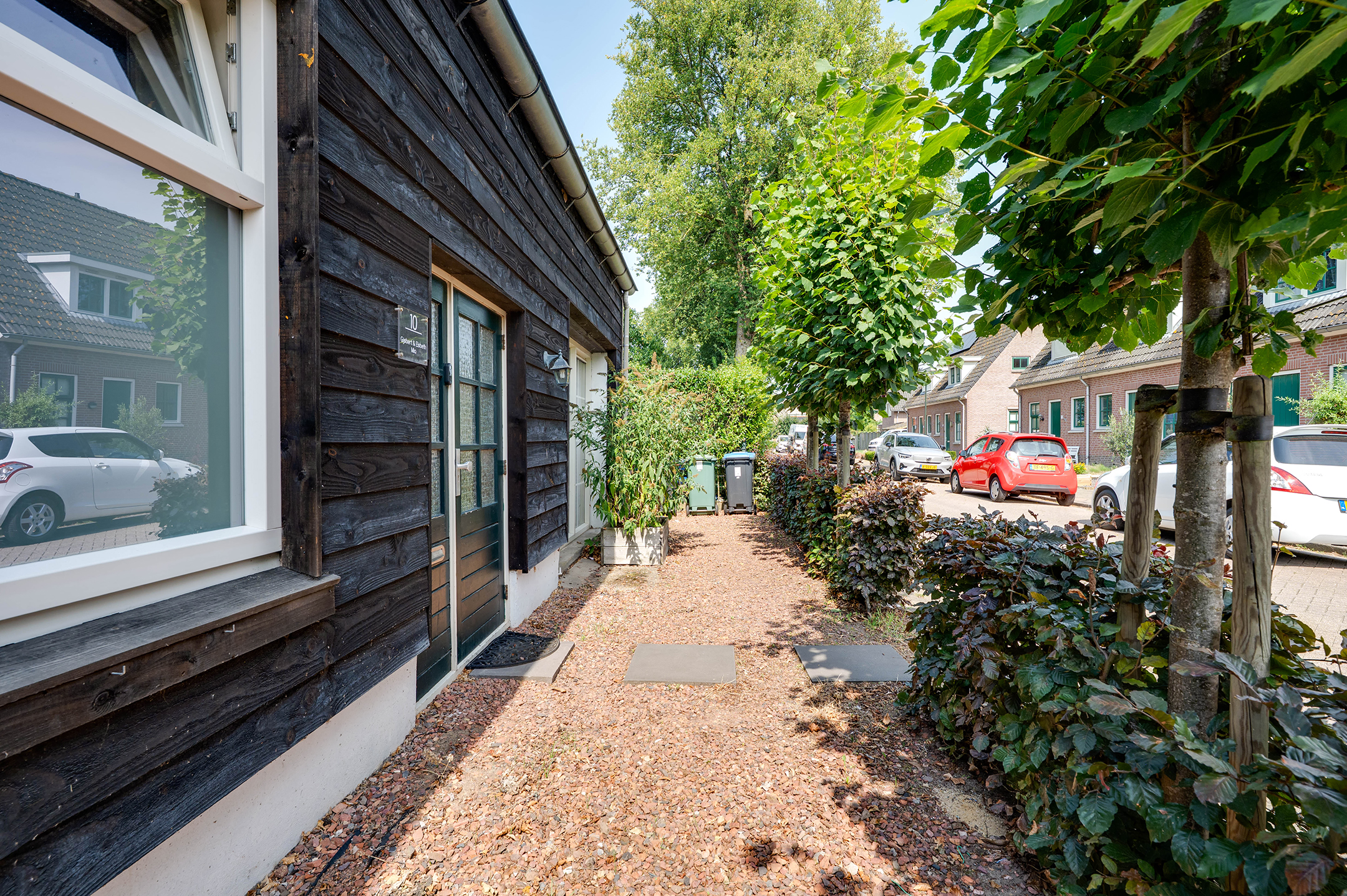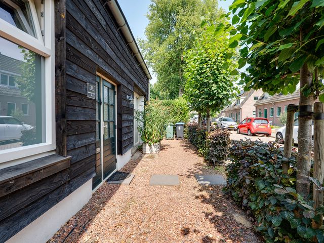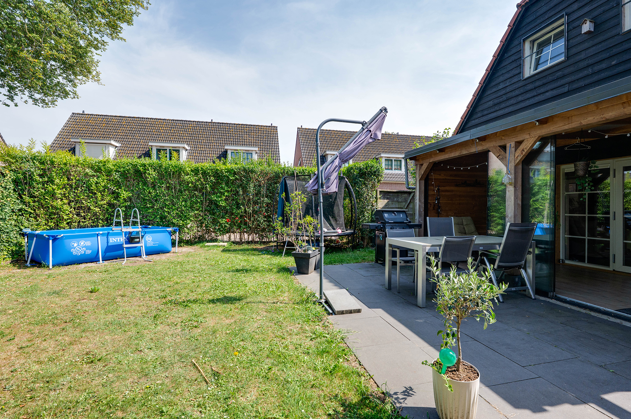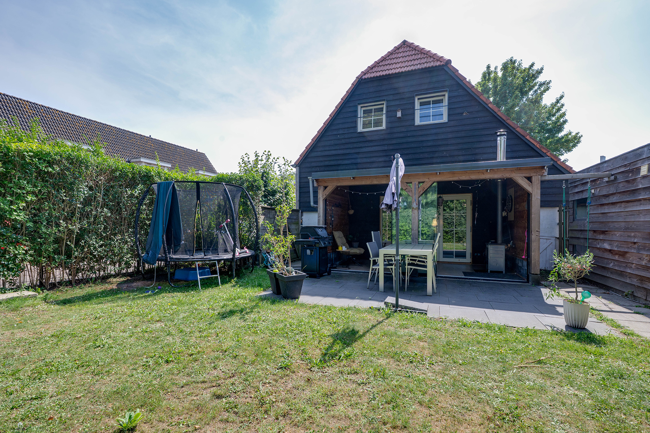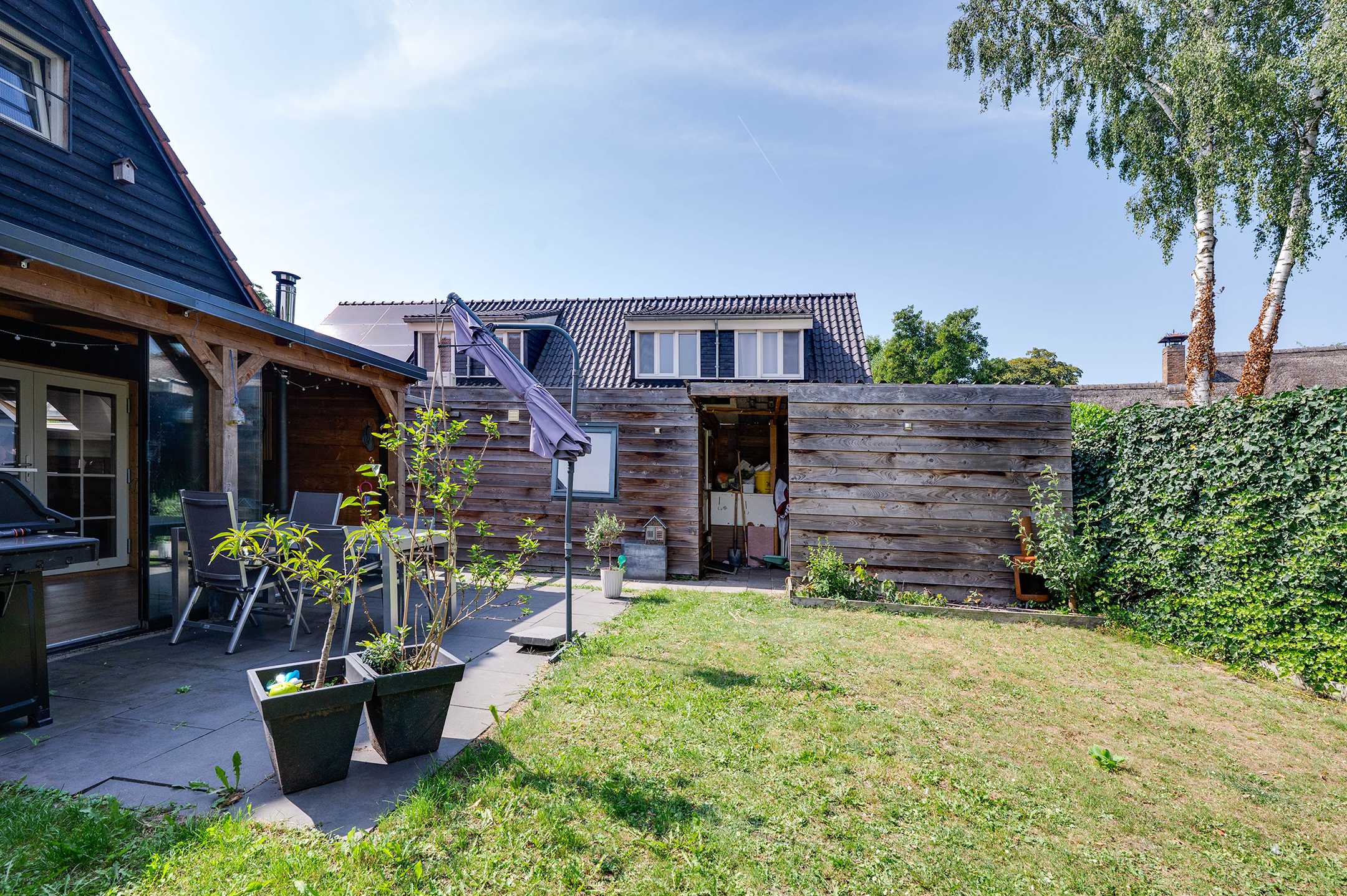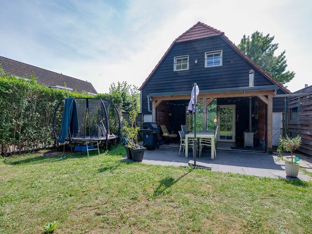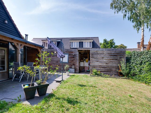 De tuin is verder ingericht met een groen gazon en een natuurlijke erfafscheiding, wat zorgt voor veel privacy. In de houten schuur met elektra kun je al je tuingereedschap en fietsen kwijt.