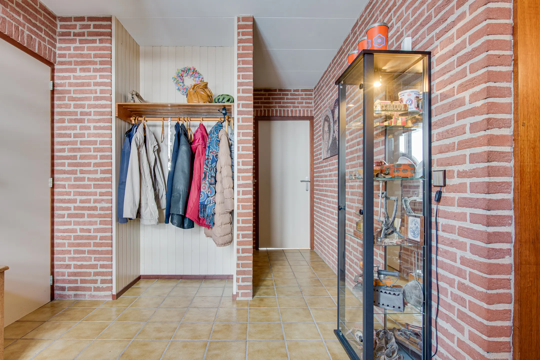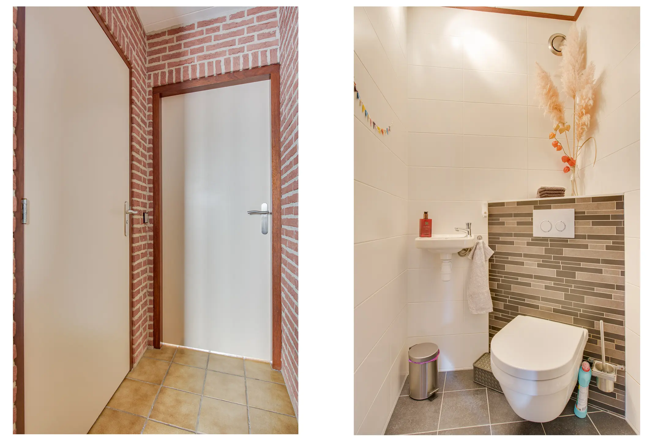Via de ruime oprit bereik je de entree aan de zijkant van de woning. In de hal voel je direct de ruimte: een open trap, garderobenis en een toilet zorgen voor een prettige ontvangst. Vanuit hier zijn de woonkamer en keuken bereikbaar en via een tussenhal loop je door naar de badkamer en de garage.
