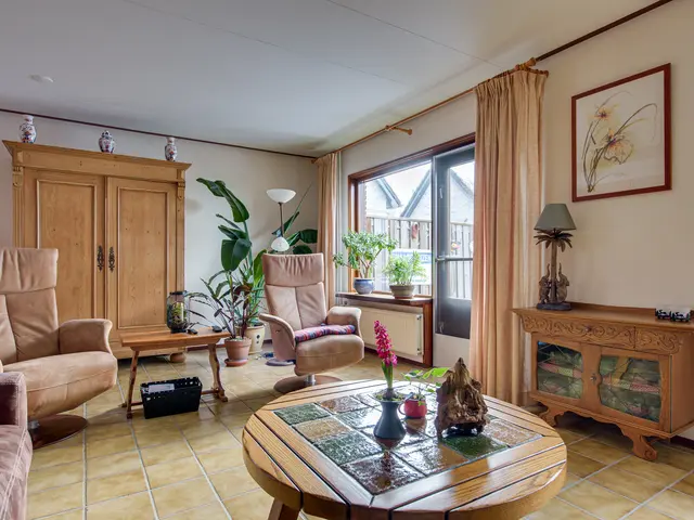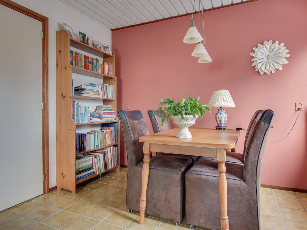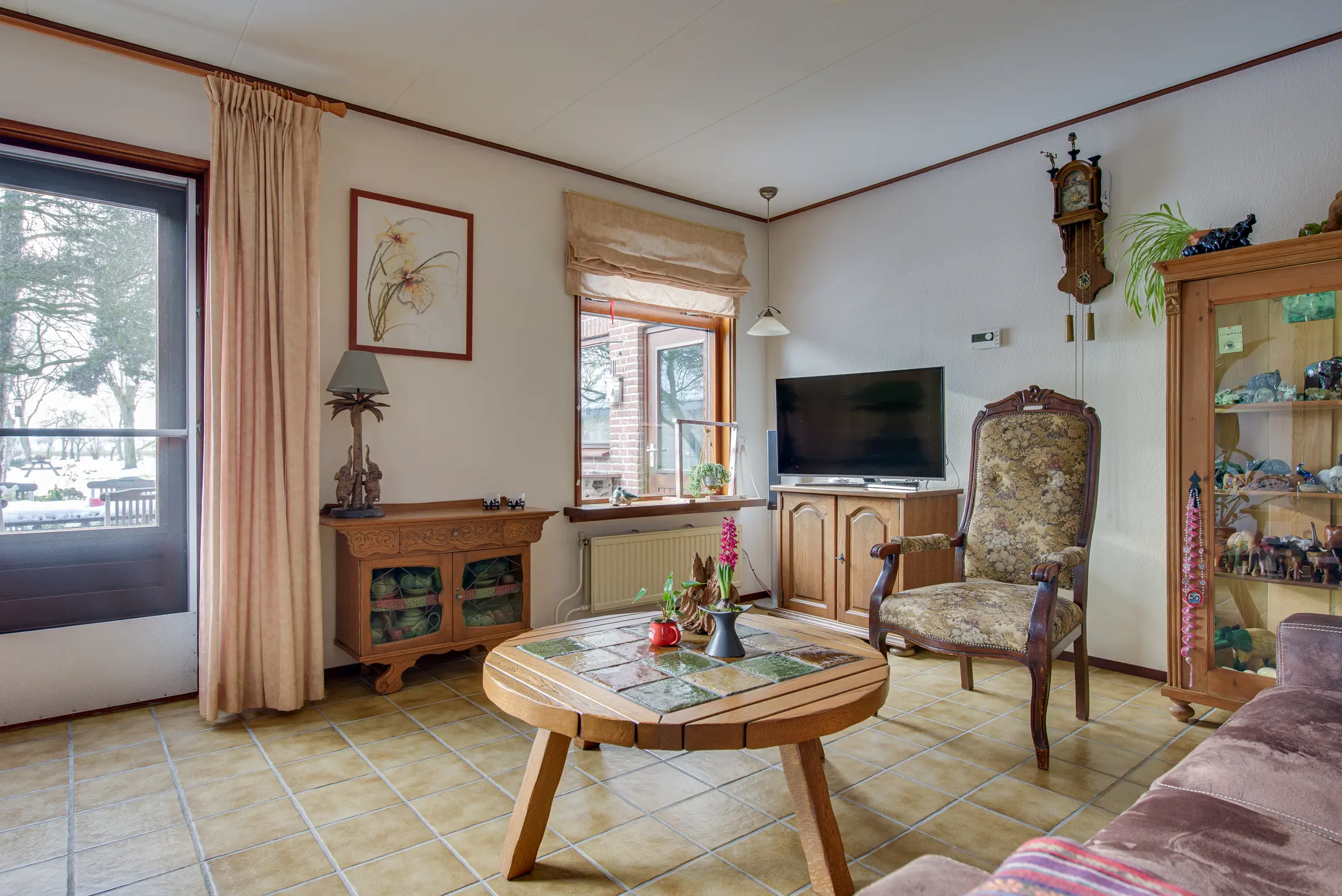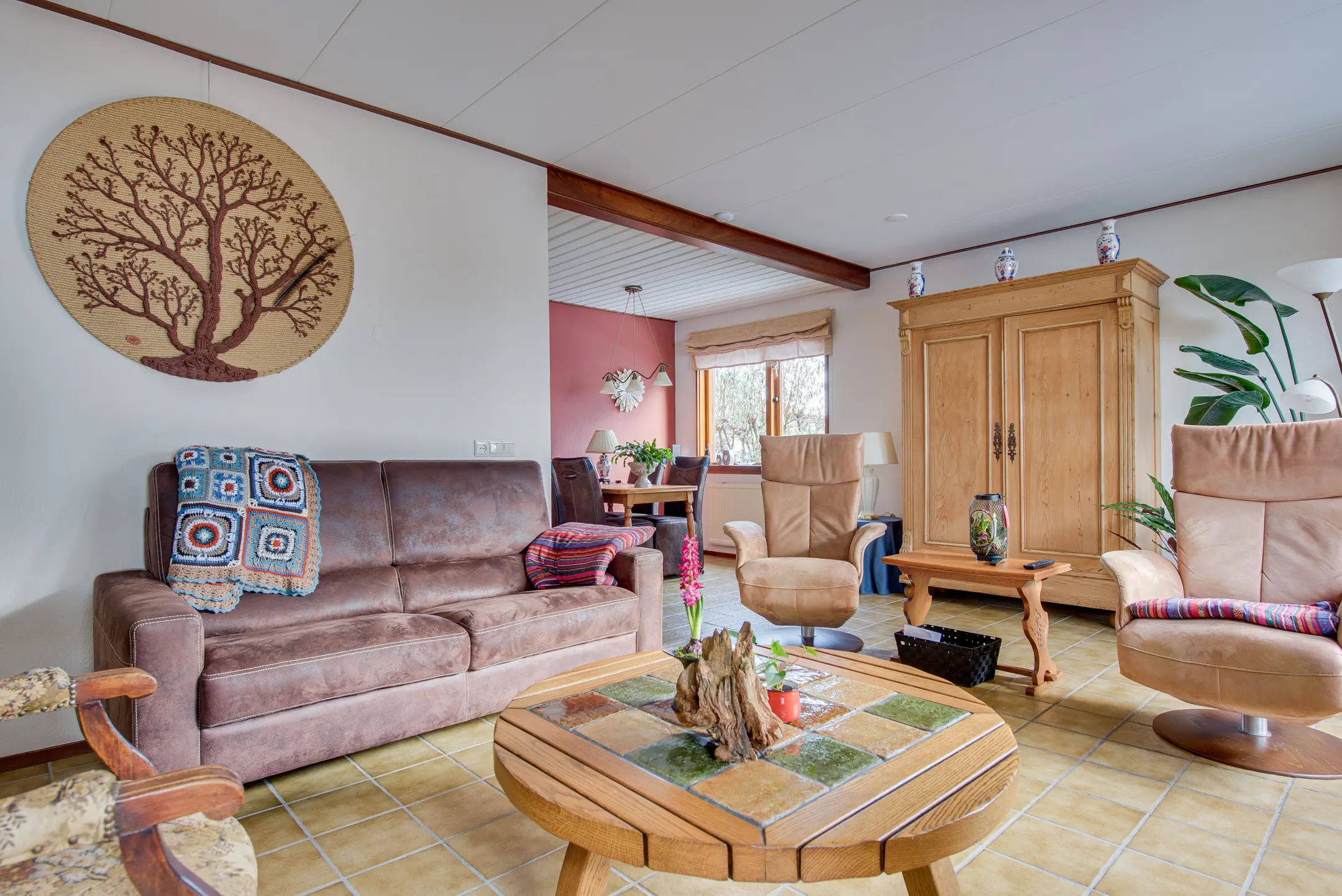 De woonkamer, gelegen aan de achterzijde, biedt een prachtig uitzicht over de diepe tuin. Een fijne plek om samen te komen, te ontspannen of juist in alle rust van het groen te genieten.