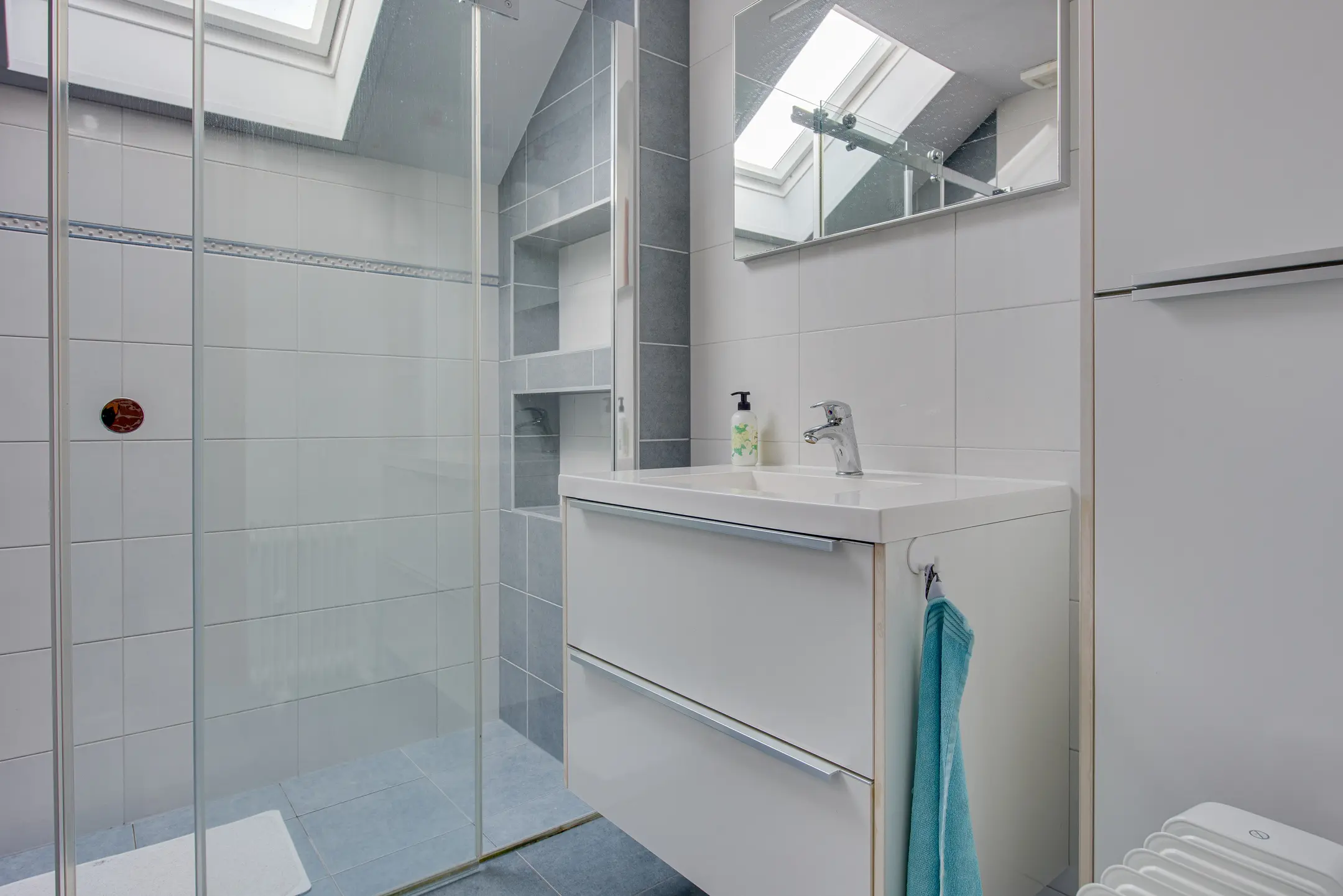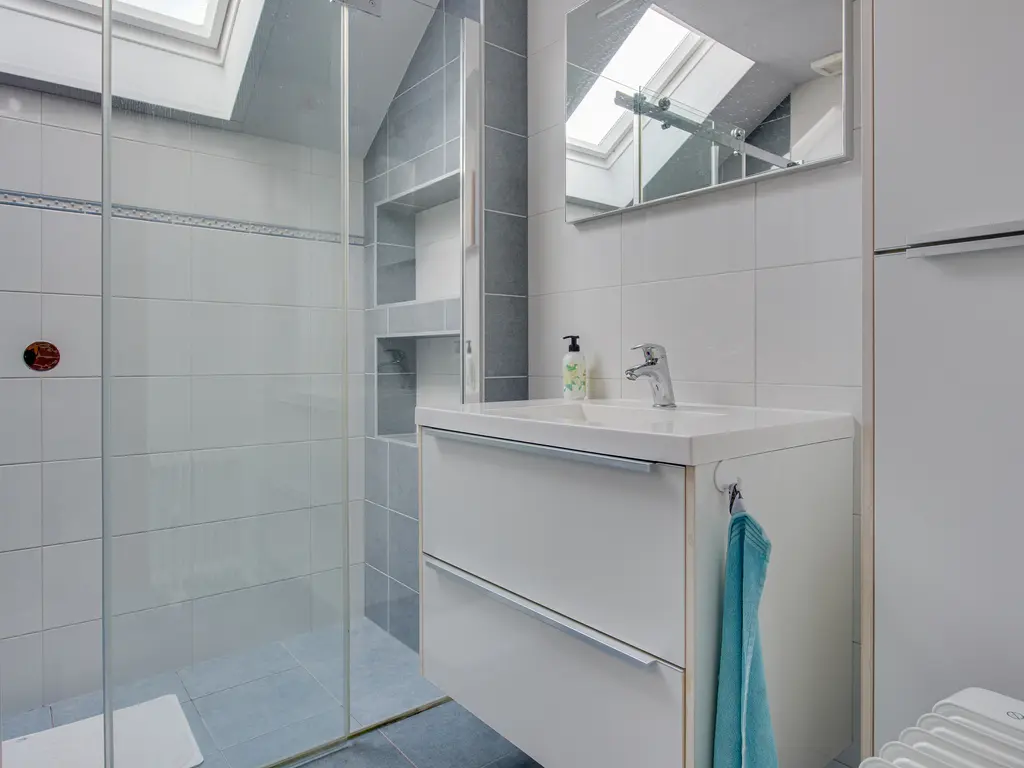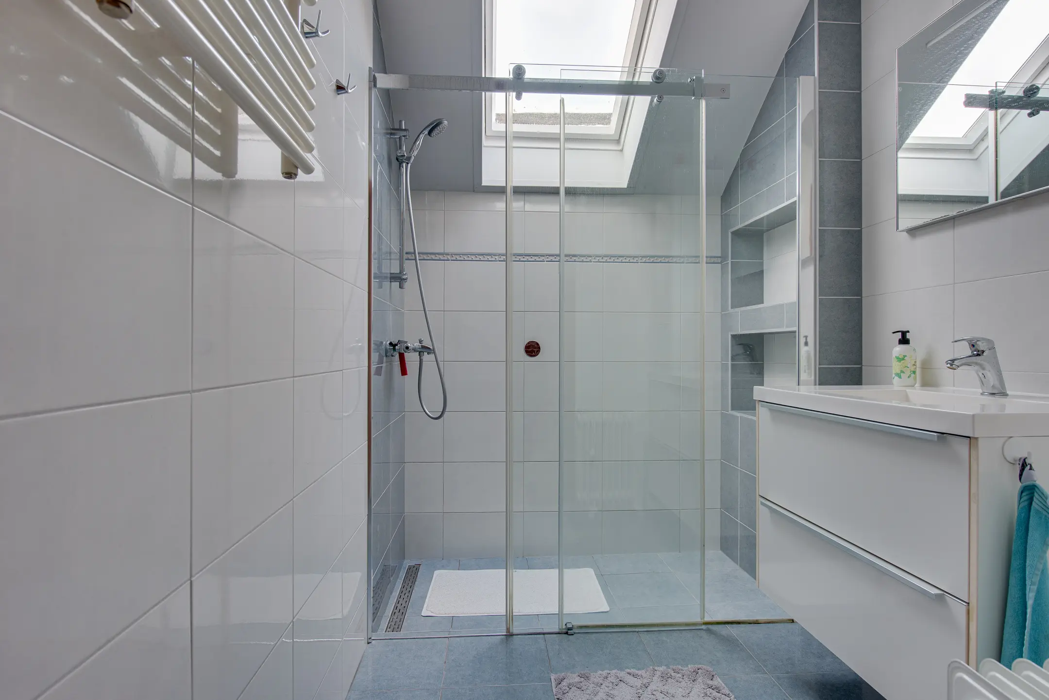 De badkamer is verzorgd uitgevoerd en beschikt over een douche, wastafelmeubel en handdoekradiator.