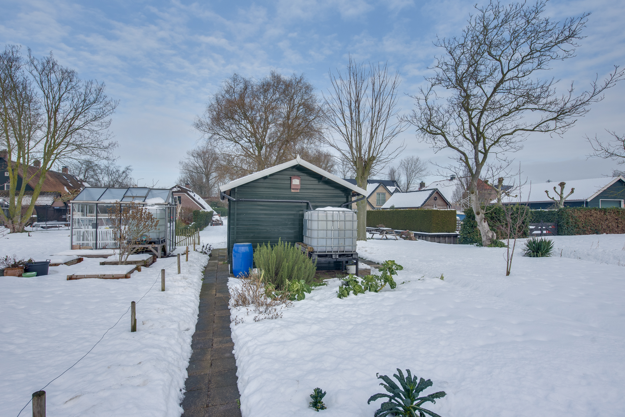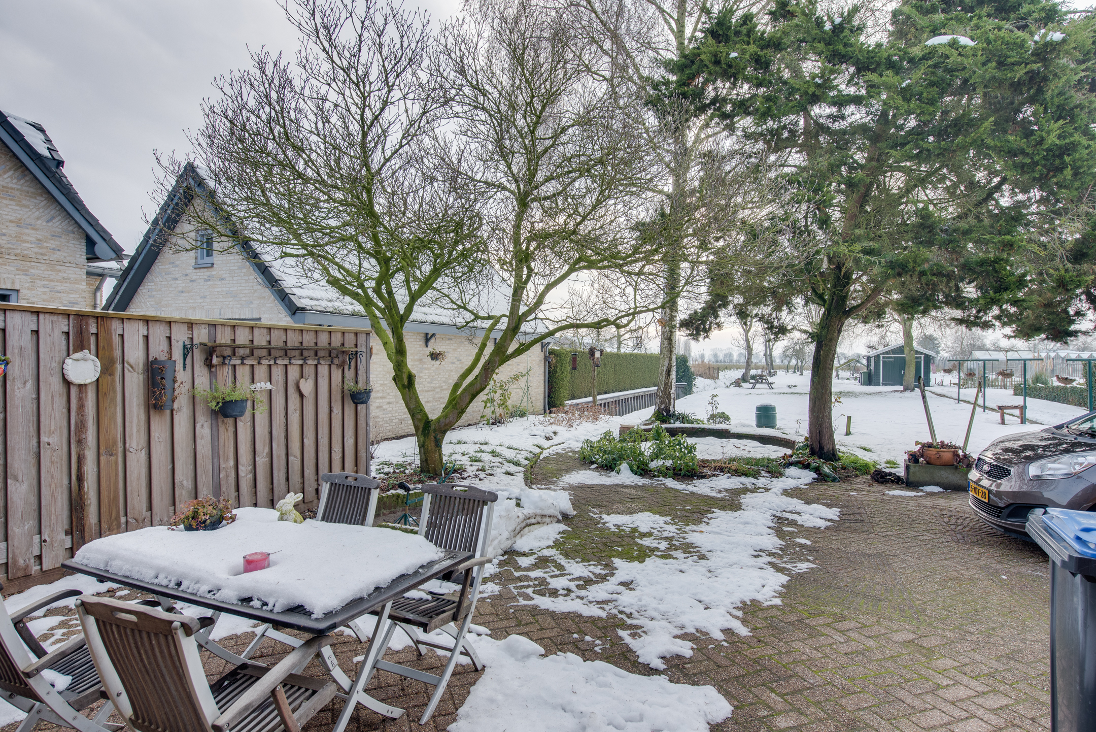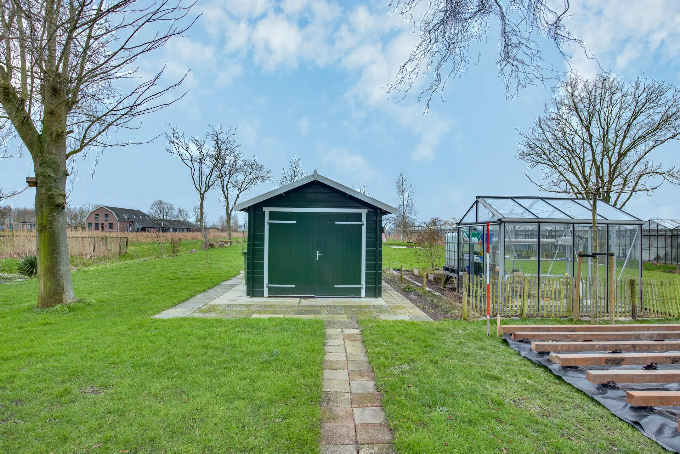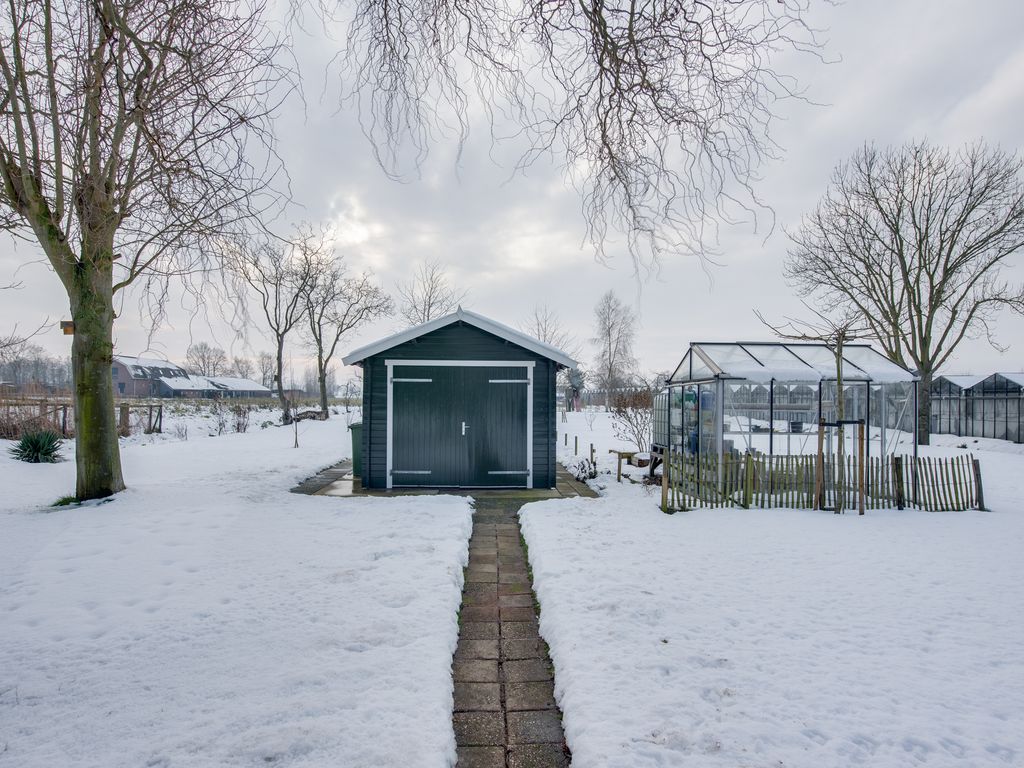 De diepe achtertuin is gelegen op het zuiden en biedt volop rust en privacy. Direct achter de woning ligt een terras met zonnescherm, waar je heerlijk kunt zitten en genieten van lange zomerdagen. Halverwege de tuin staat een houten berging met dubbele deuren en elektra, perfect voor opslag, hobby’s of tuinspullen.