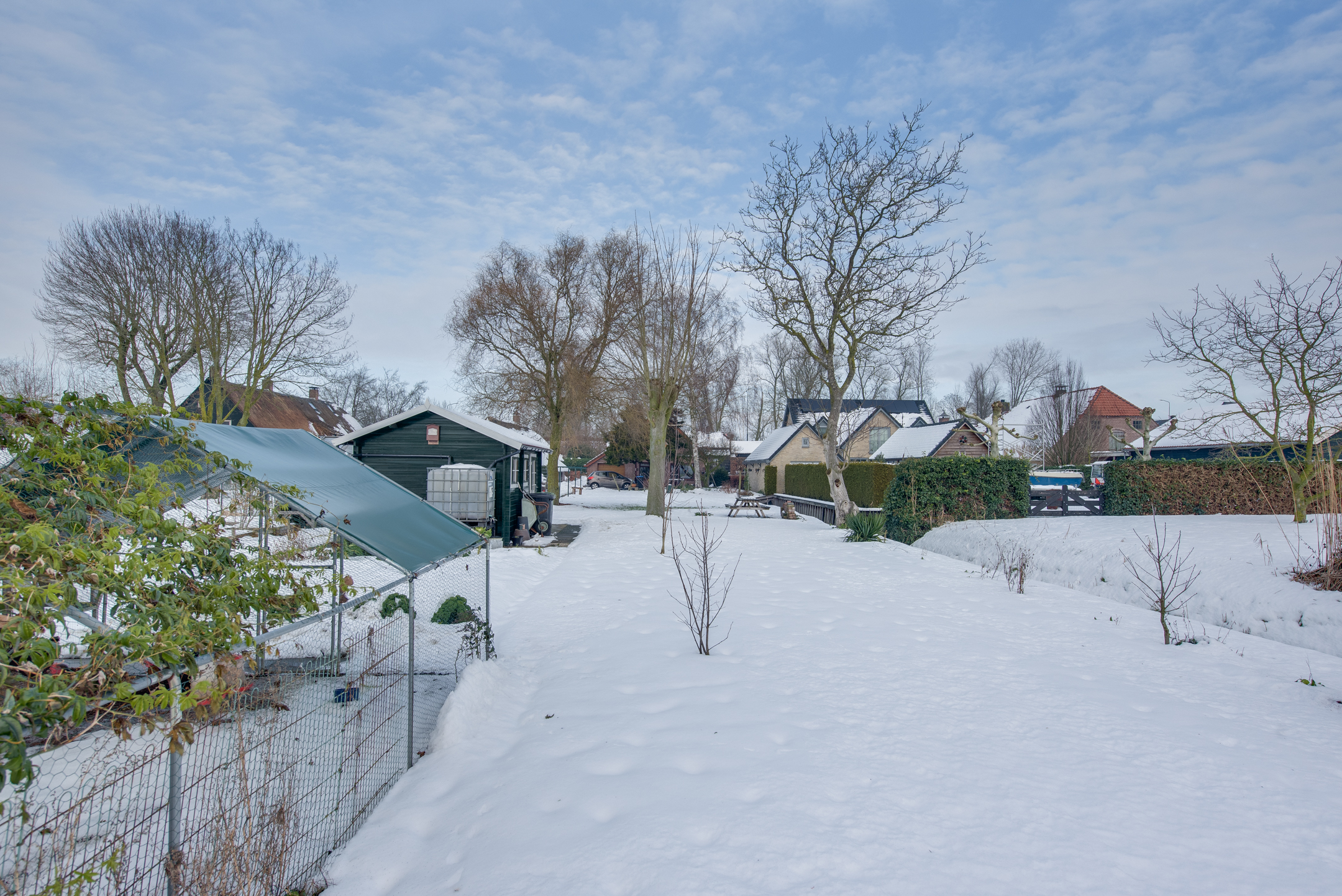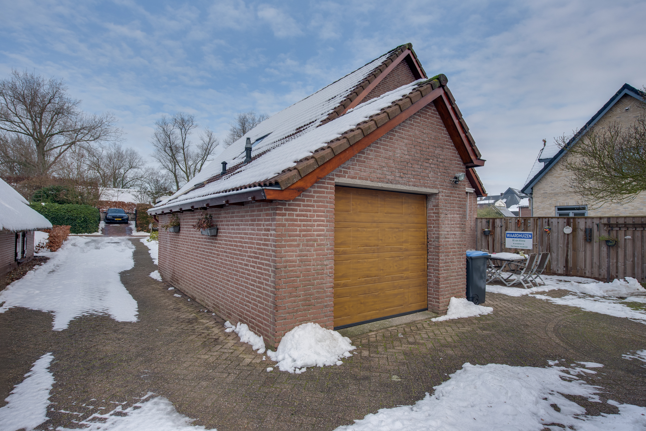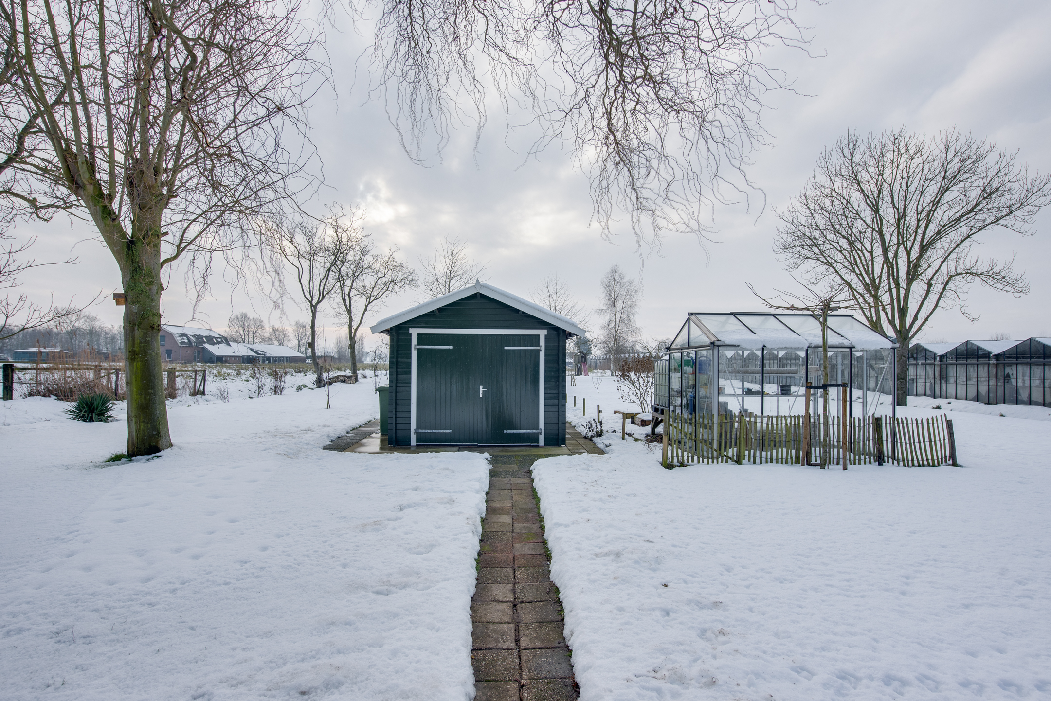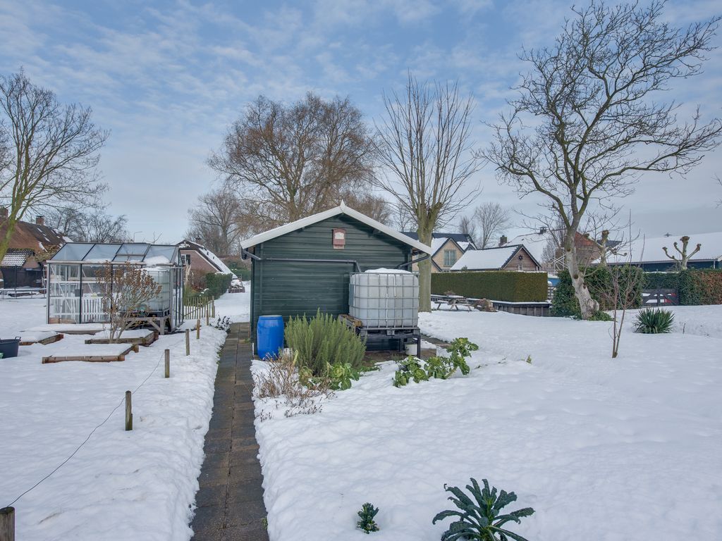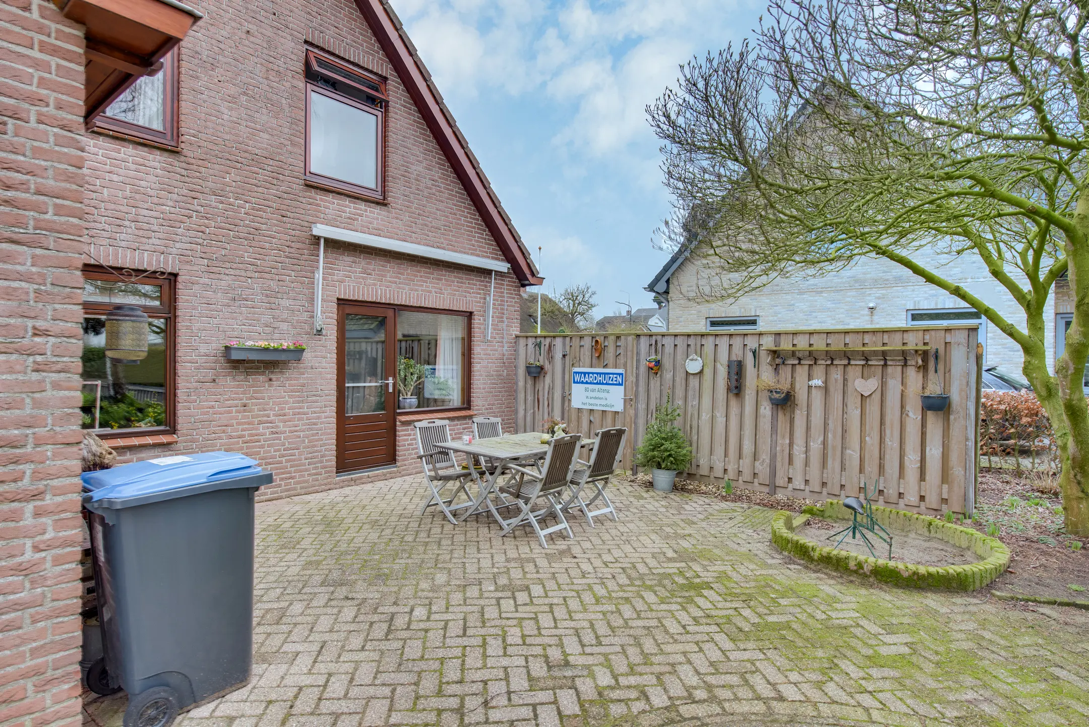 De diepe achtertuin is gelegen op het zuiden en biedt volop rust en privacy. Direct achter de woning ligt een terras met zonnescherm, waar je heerlijk kunt zitten en genieten van lange zomerdagen. Halverwege de tuin staat een houten berging met dubbele deuren en elektra, perfect voor opslag, hobby’s of tuinspullen.