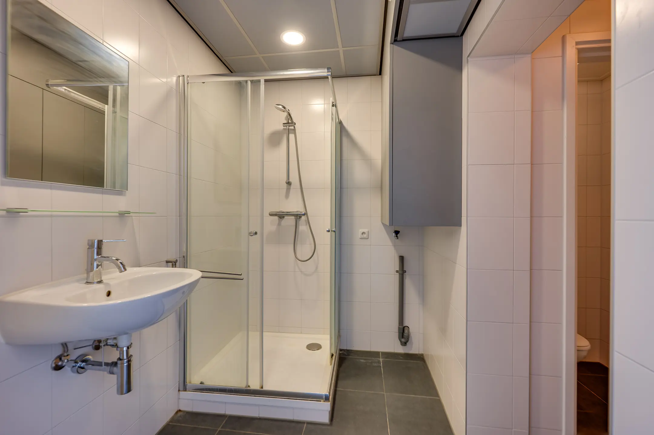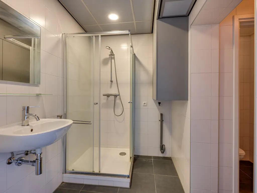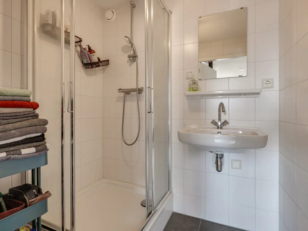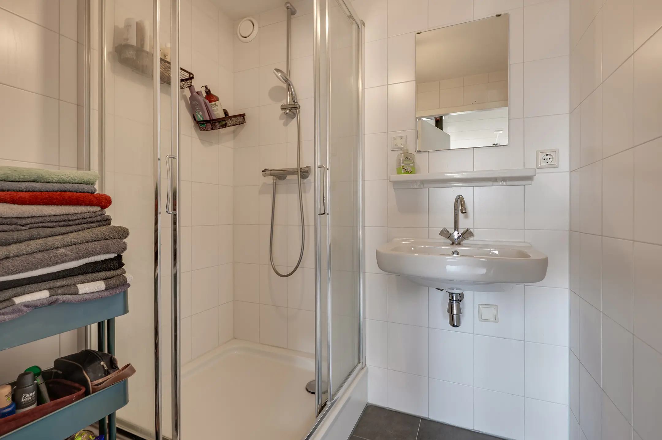 De badkamer op deze verdieping is compleet met douche, wastafel en handdoekradiator. De cv-installatie (Nefit Proline HR, 2012) voorziet deze verdieping en de zolder van verwarming en warm water.