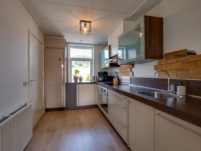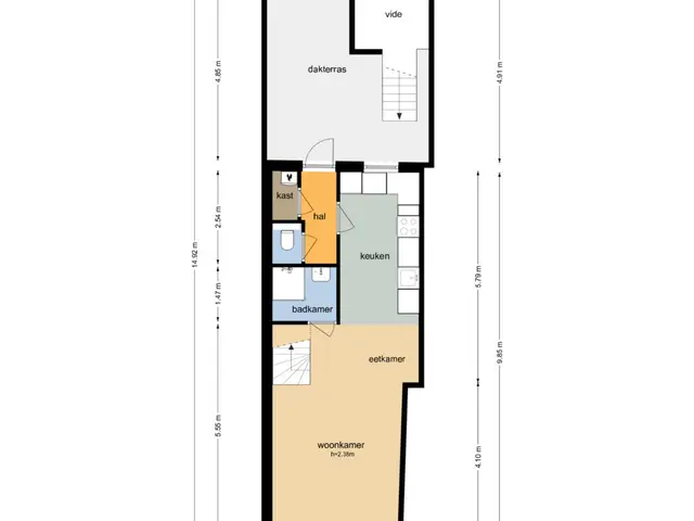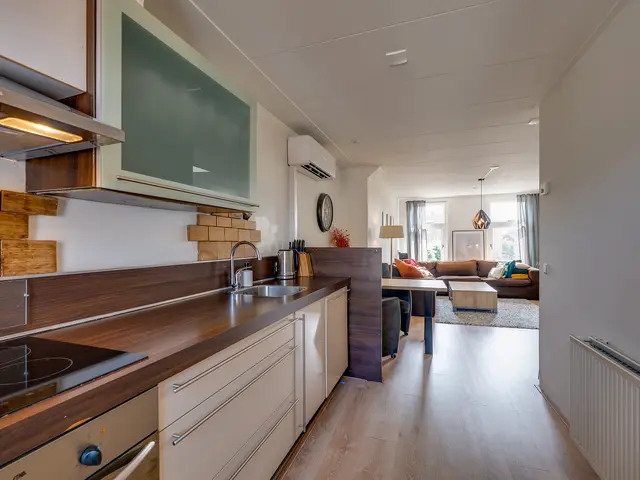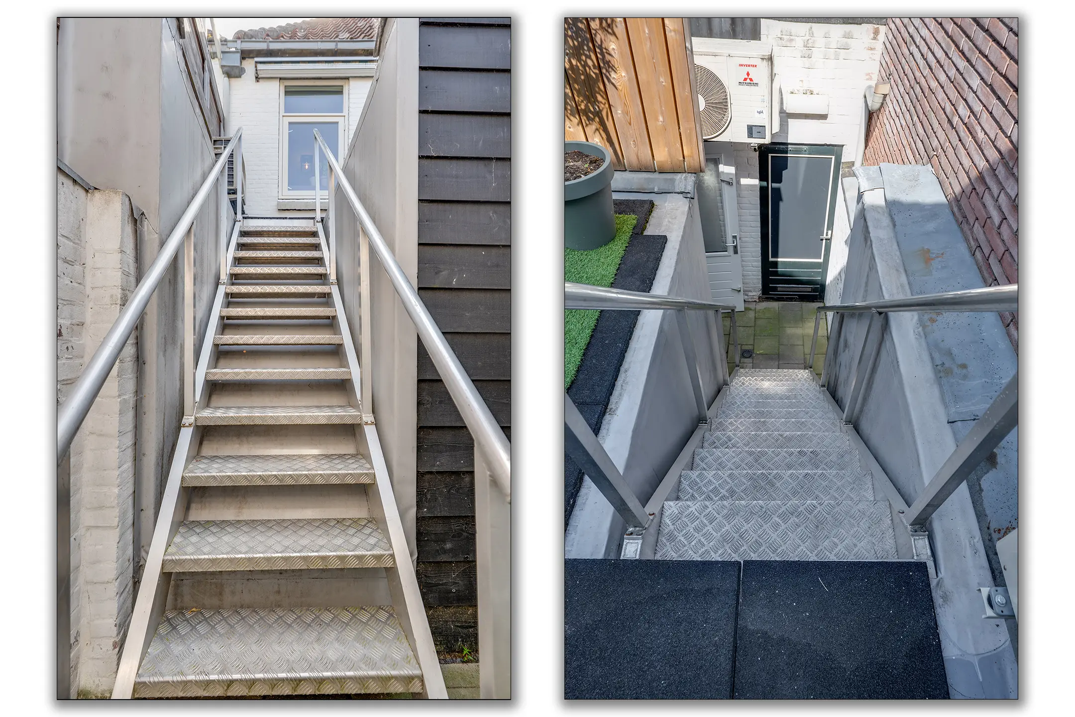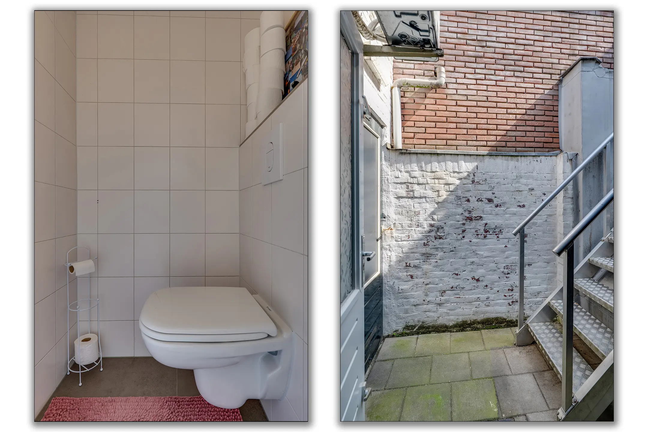 Via de buitentrap bereik je het ruime dakterras en aparte bovenwoning. De hal biedt toegang tot een aparte berging, het toilet, en de lichte woonkamer met open keuken. Grote ramen zorgen voor een fijne lichtinval, en ook hier vind je een inverter. De keuken is compleet uitgevoerd met o.a. een vaatwasser, keramische kookplaat, oven, koelkast, vriezer en volop kastruimte.