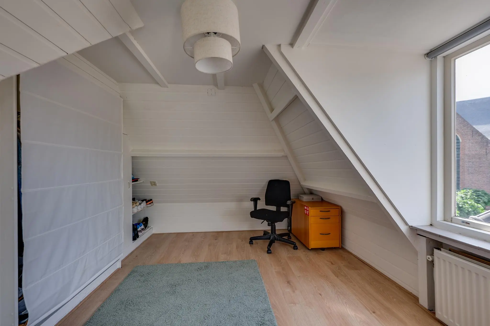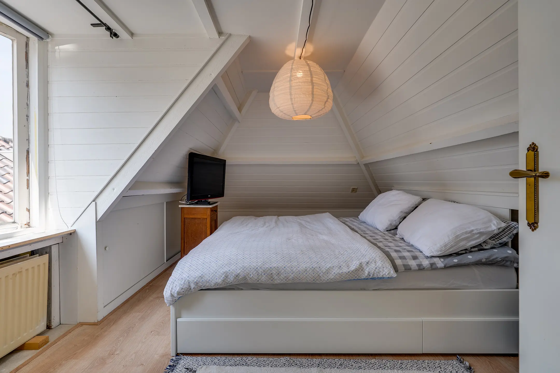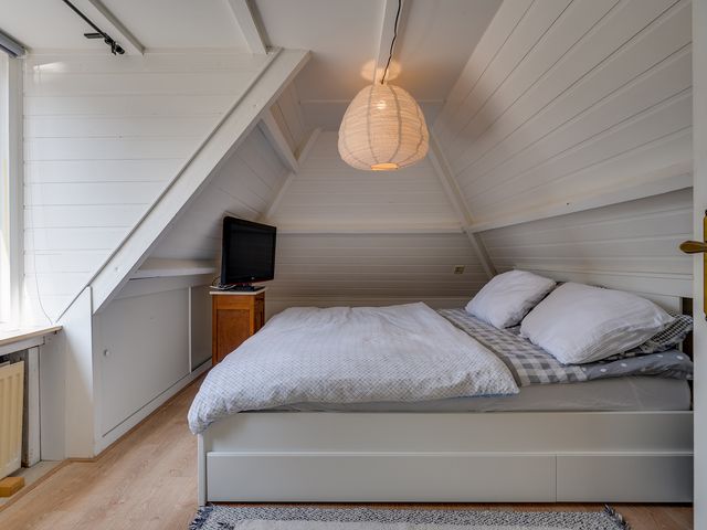 Een open trap leidt naar de ruime zolder. Hier vind je twee lichte slaapkamers, beide met dakkapel. In de ene slaapkamer is een wastafel aanwezig; in de andere veel bergruimte achter knieschotten. Op de overloop met dakraam is nog extra bergruimte en de aansluiting voor de wasmachine.