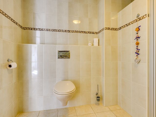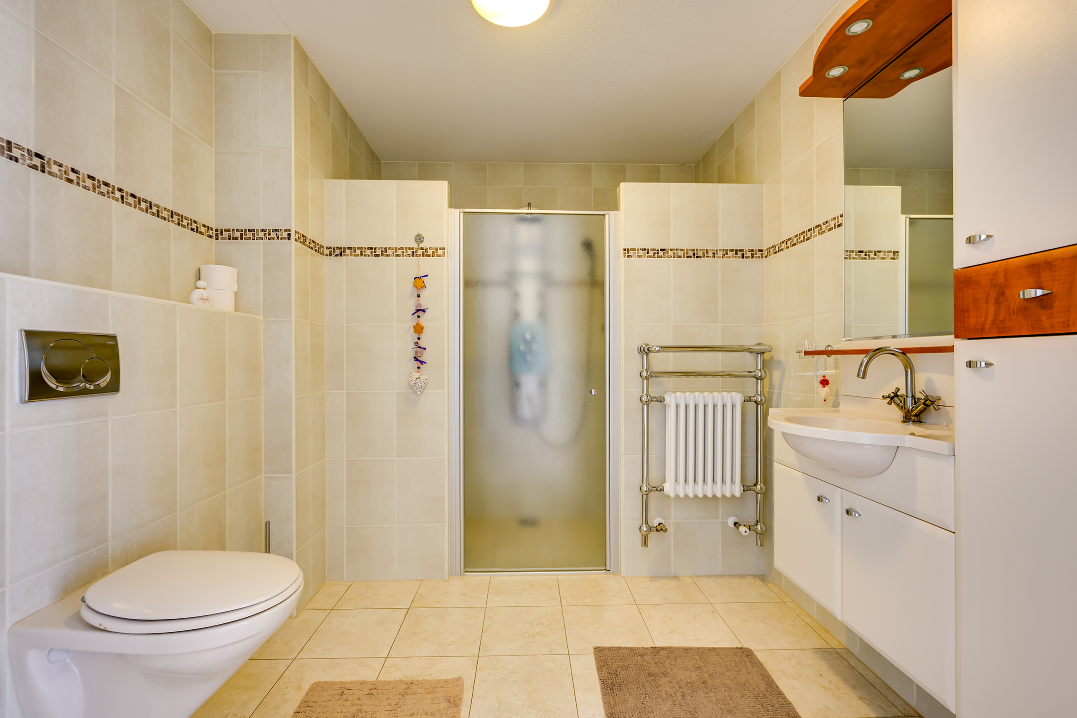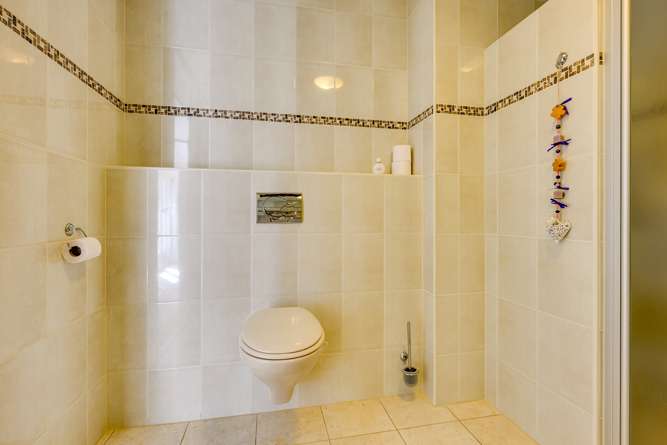 De badkamer is ruim en compleet uitgevoerd met een modern wastafelmeubel, toilet, handdoekradiator en een luxe funshower – jouw eigen spa aan huis!