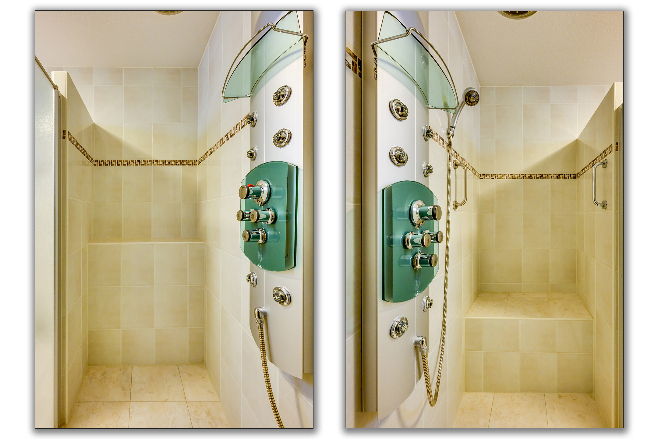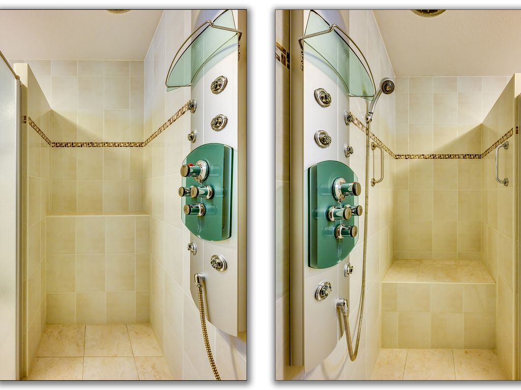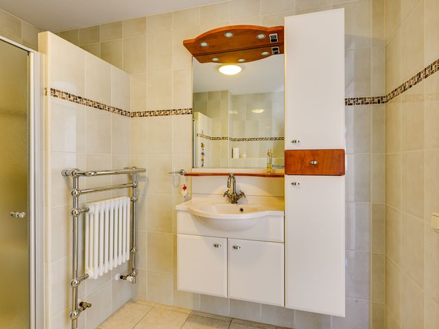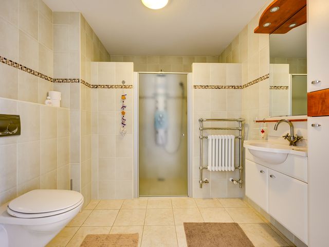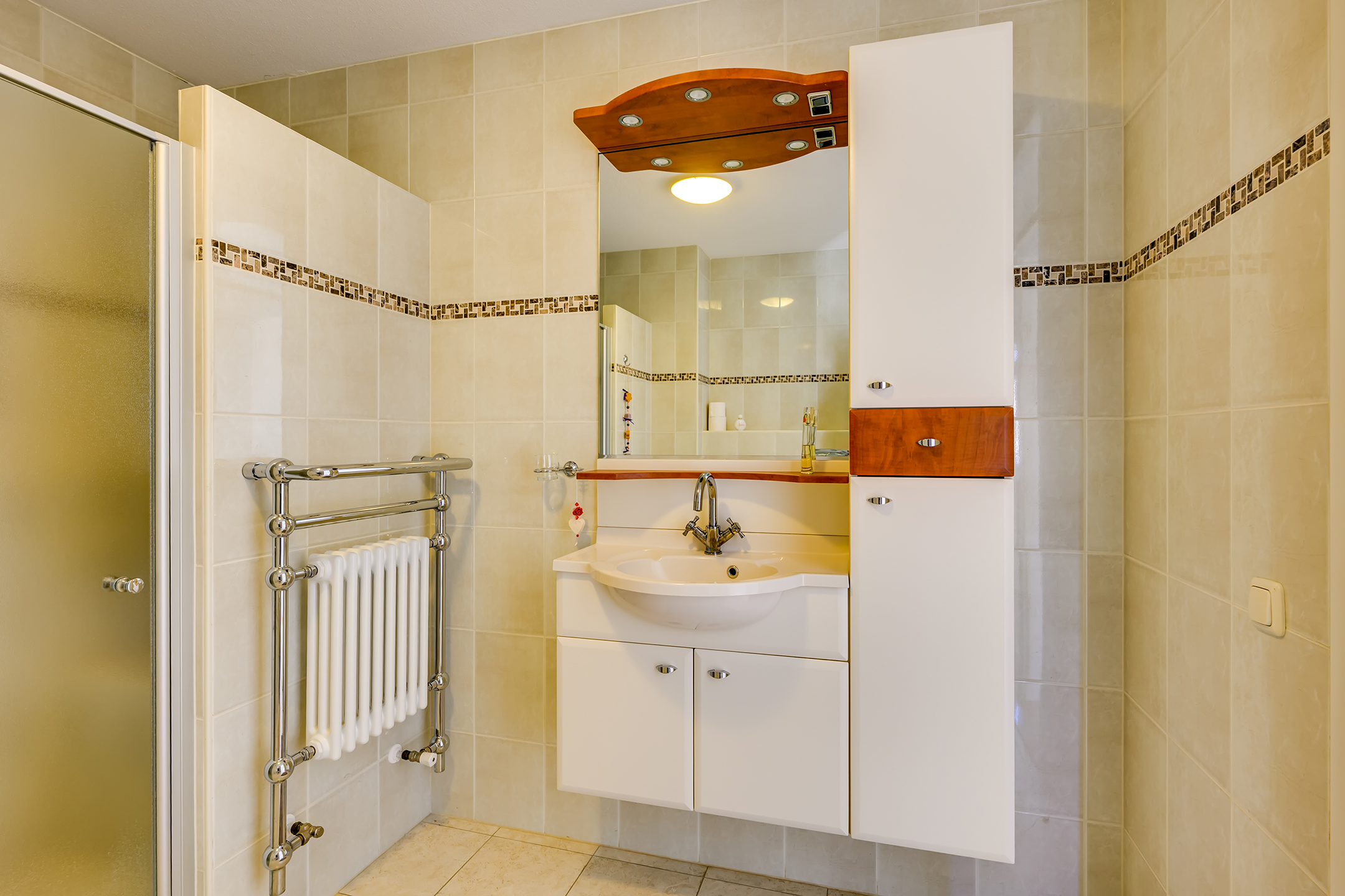 De badkamer is ruim en compleet uitgevoerd met een modern wastafelmeubel, toilet, handdoekradiator en een luxe funshower – jouw eigen spa aan huis!