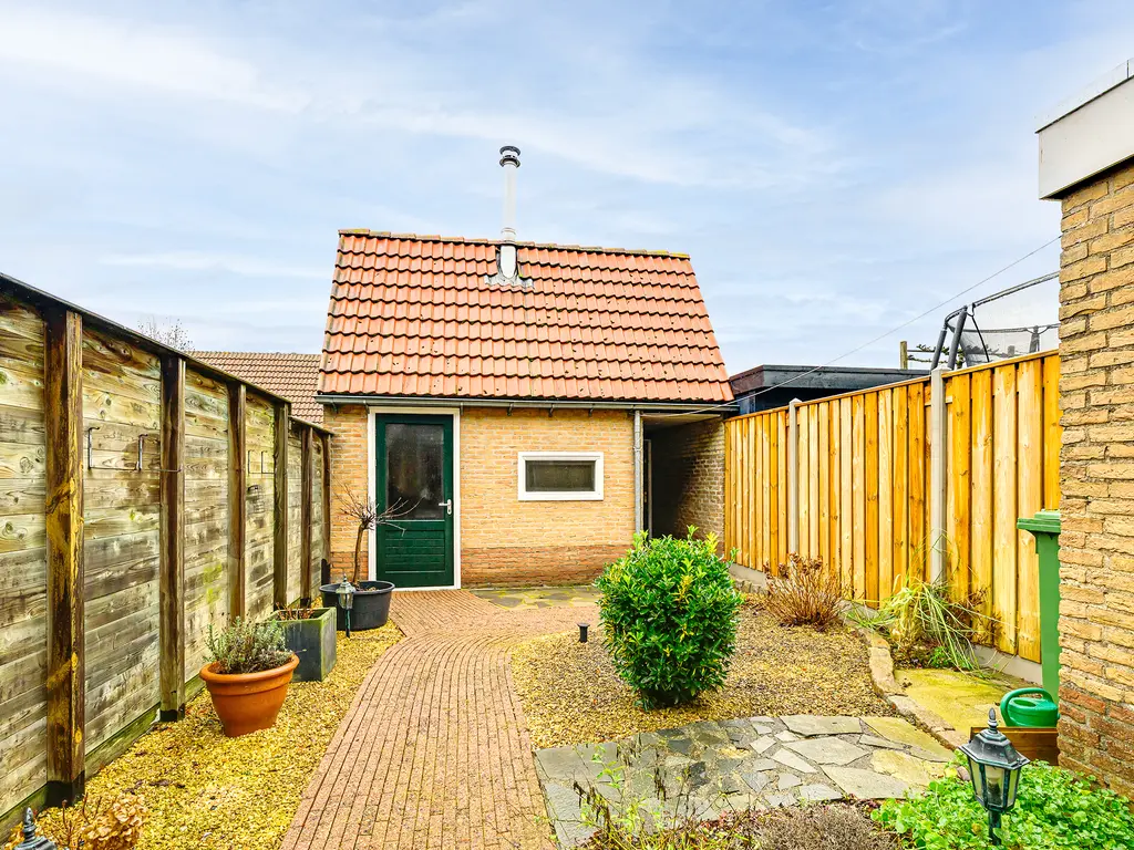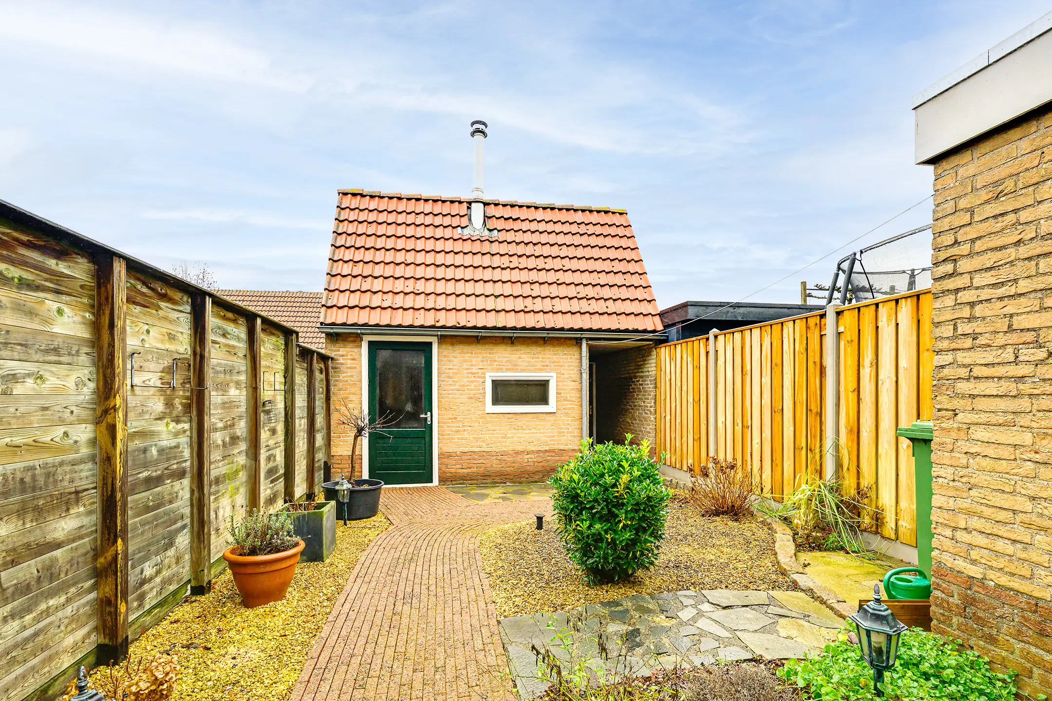 Buiten beschikt de woning over zowel een voortuin als een verzorgde achtertuin op het noordoosten. De tuin is netjes aangelegd met sierbestrating en borders en biedt dankzij de houten erfafscheiding volop privacy. Achterin de tuin staat een stenen berging met vliering, waar bovendien een houtkachel aanwezig is.